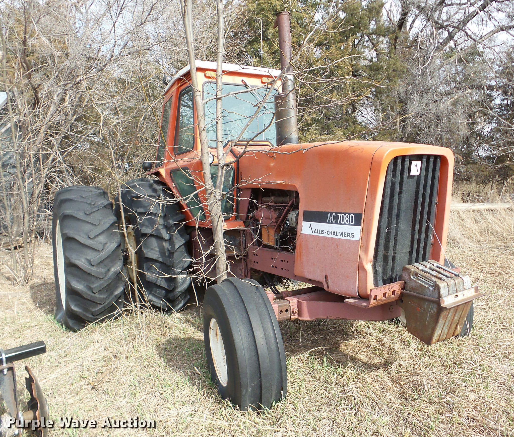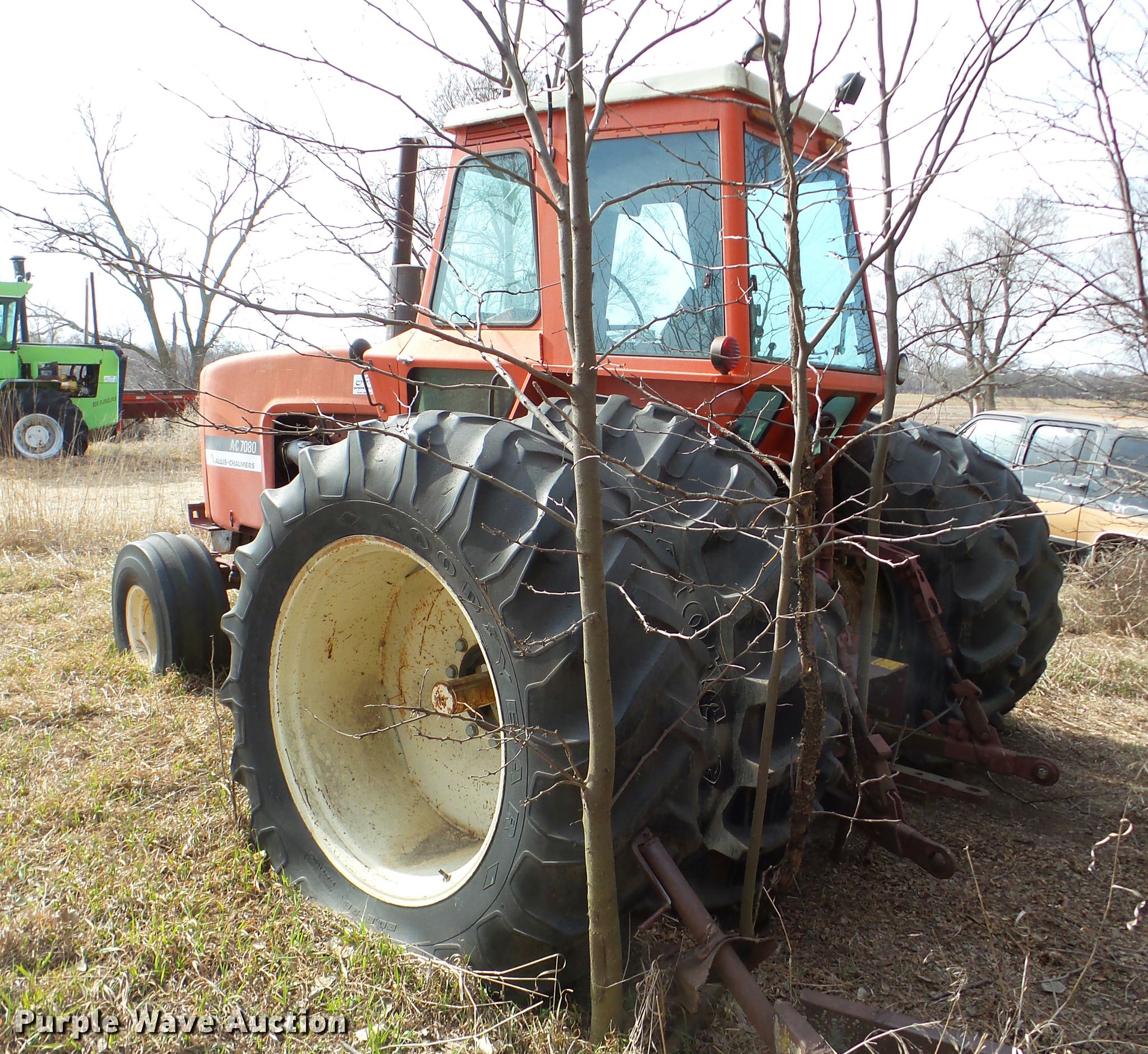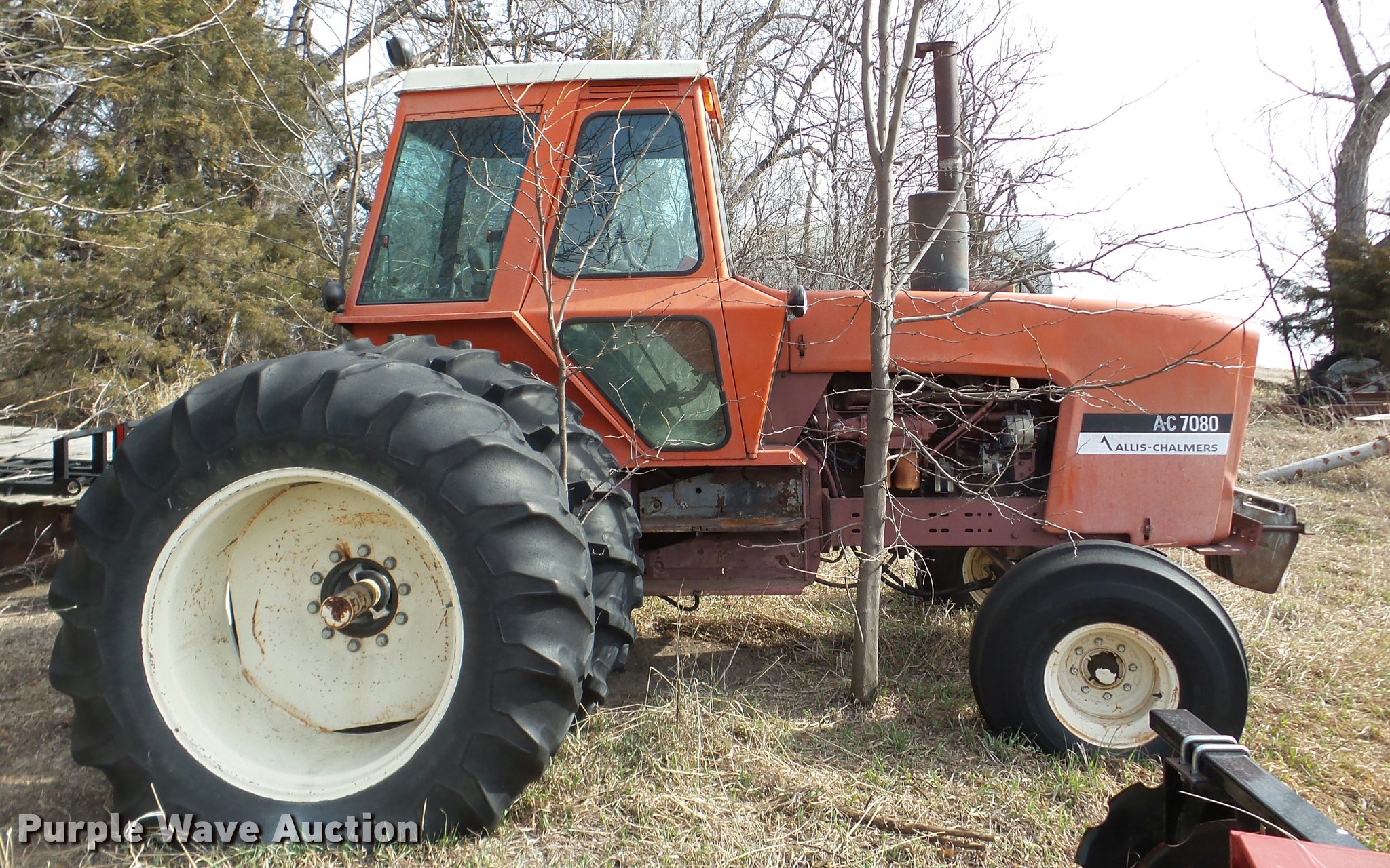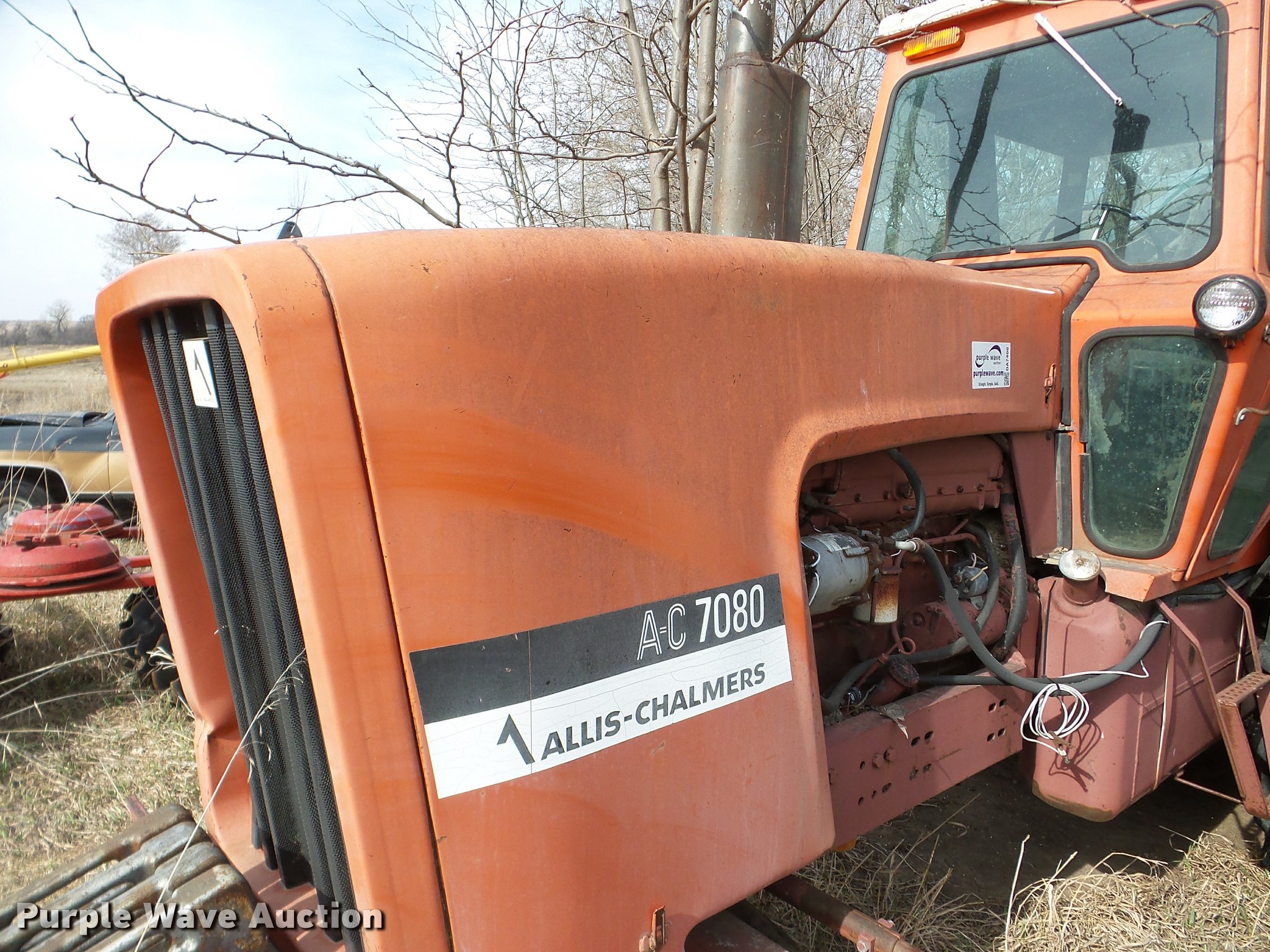 Purple Wave is selling a used Tractor in Nebraska. This item is a Allis Chalmers 7080 tractor with the following: 2,767 hours on meter, Six cylinder diesel engine, Five speed manual transmission, Three point, 1000 PTO, (3) hydraulic remote sets, 14L-16.1 front tires, 20.8-38 rear tires, Flat tires, PTO adapter not included, Front weights not included, Non-operational unit, Serial 70801517