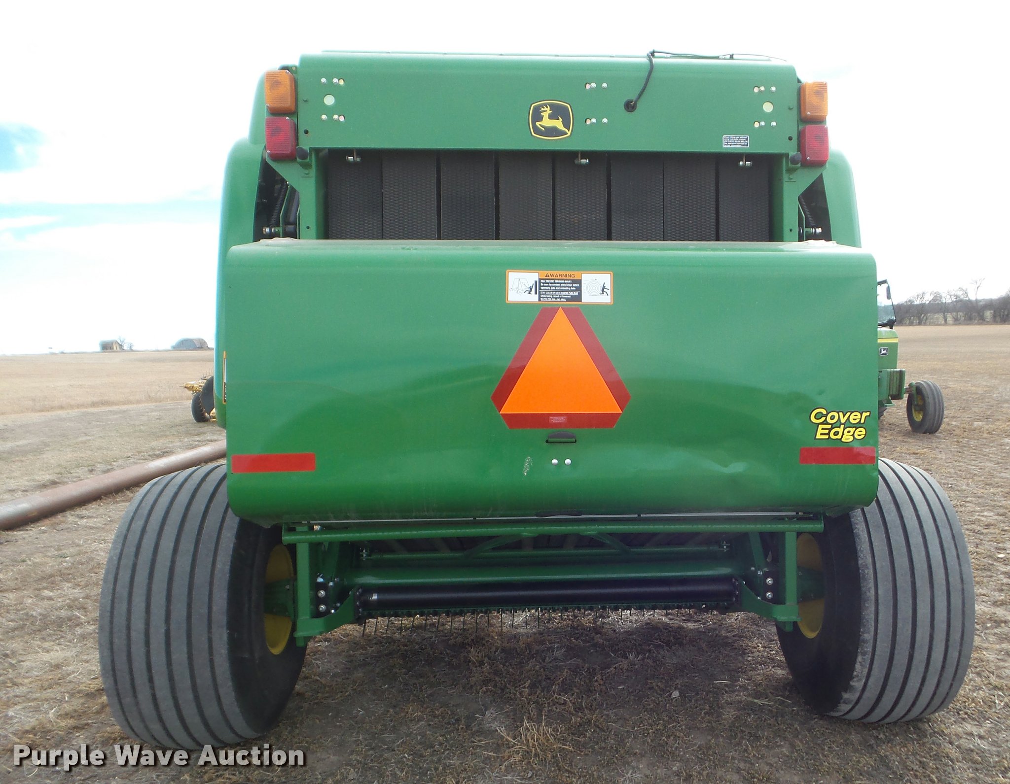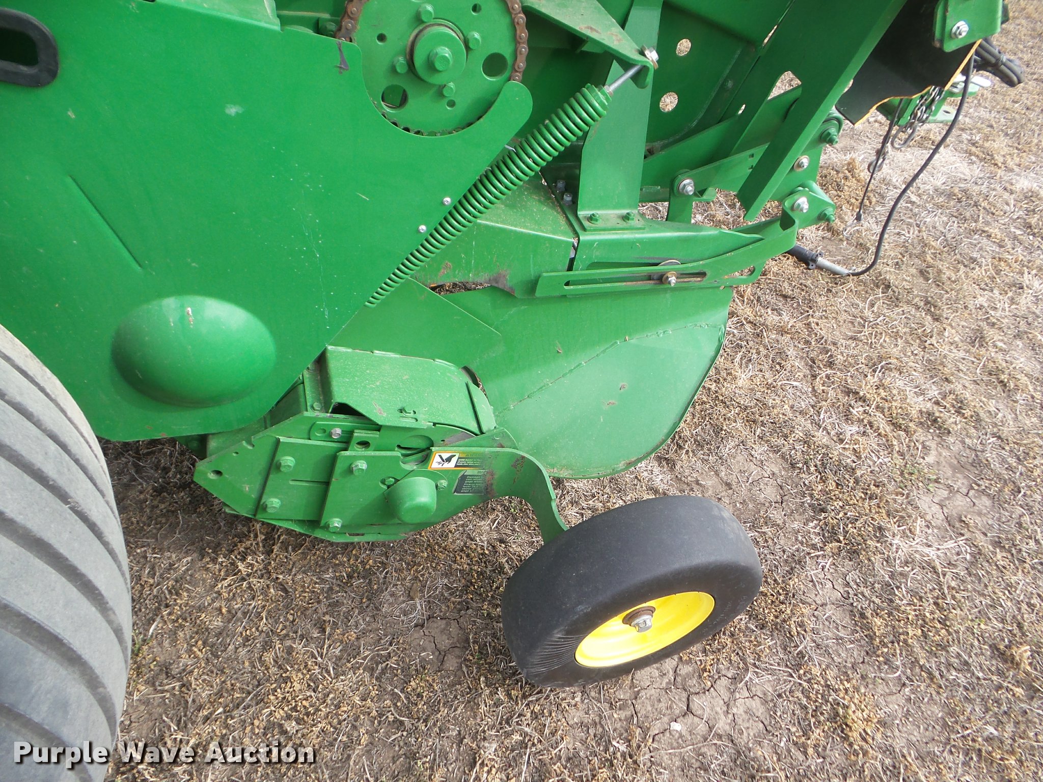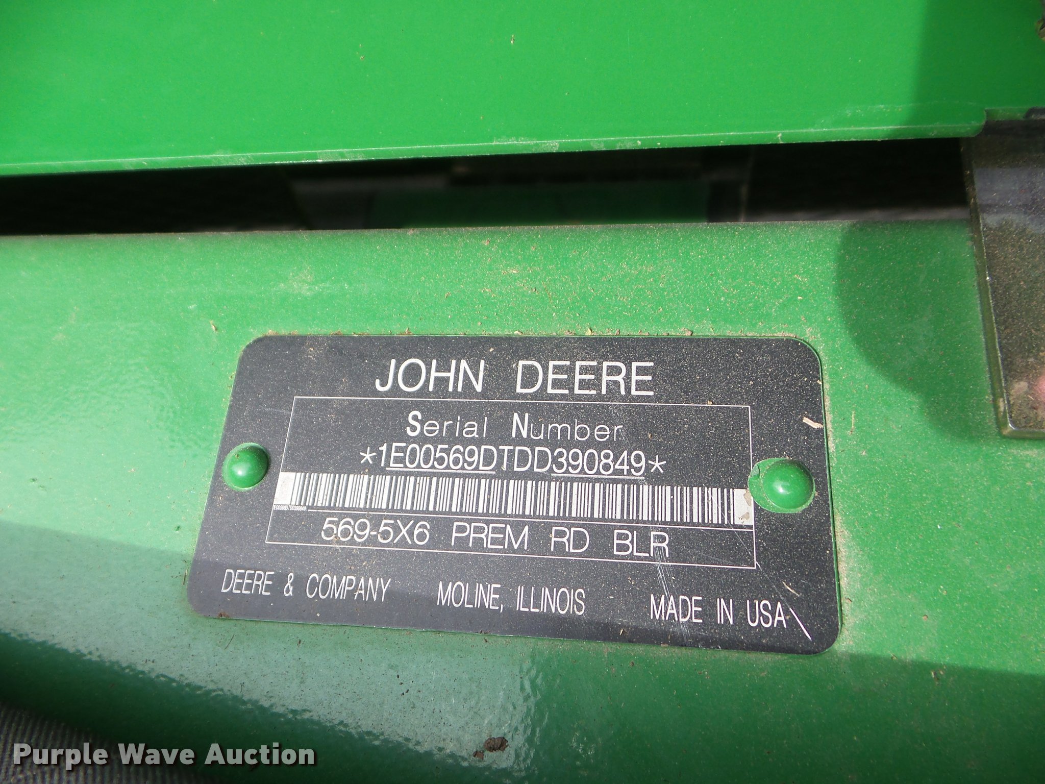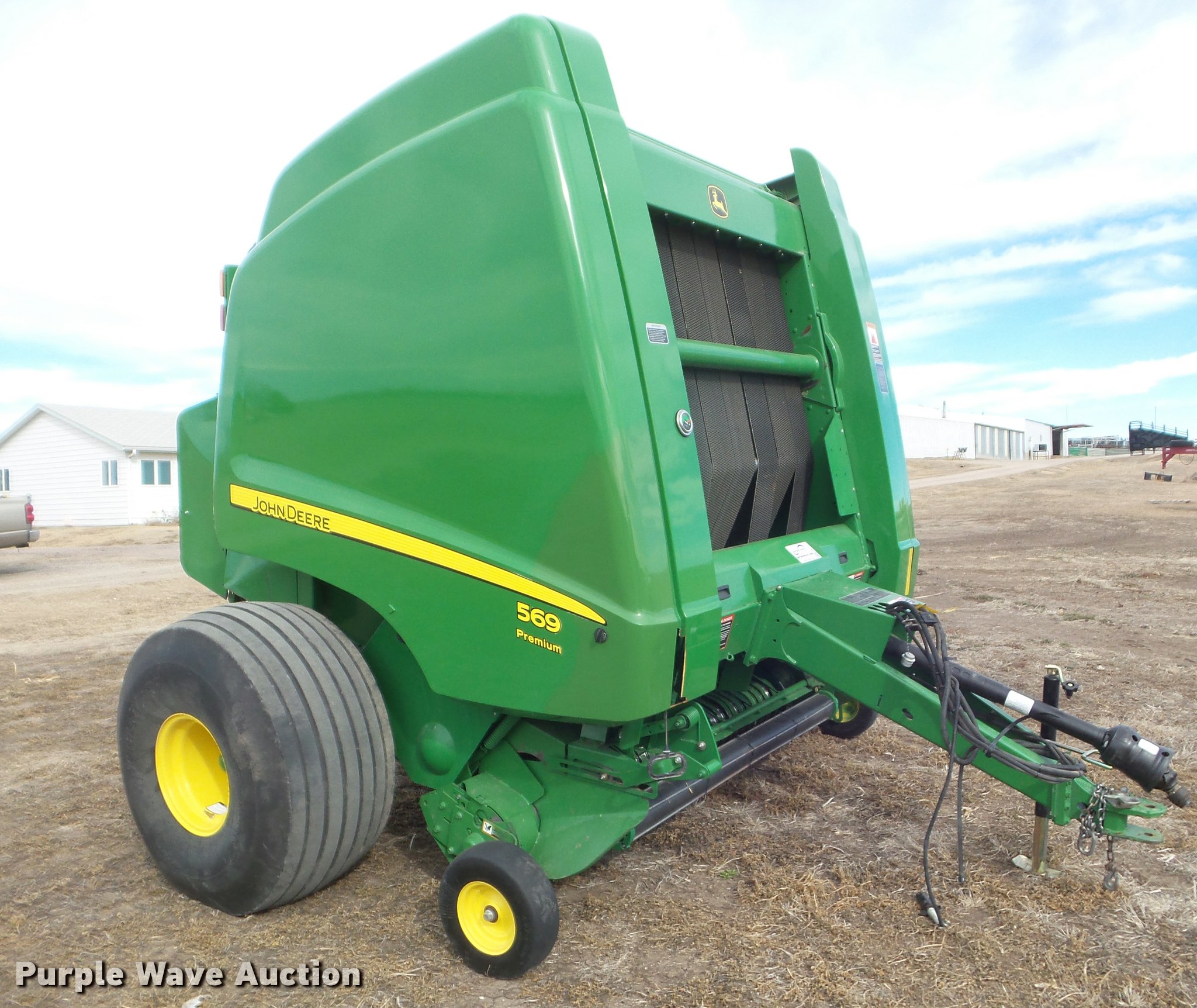 Purple Wave is selling a used Round Baler in Kansas. This item is a 2013 John Deere 569 Premium round baler with the following: 3,822 bales on counter, 5' x 6' bale capacity, 72"W pickup, Hydraulic pickup lift, 4.80-8/3.75 gauge wheels, John Deere GreenStar 2 monitor, Net-wrap, Bale kicker, Transport lights, 1000 PTO, Pin hitch, 21.5-16.1 tires, Manual, Serial 1E005690TDB390849