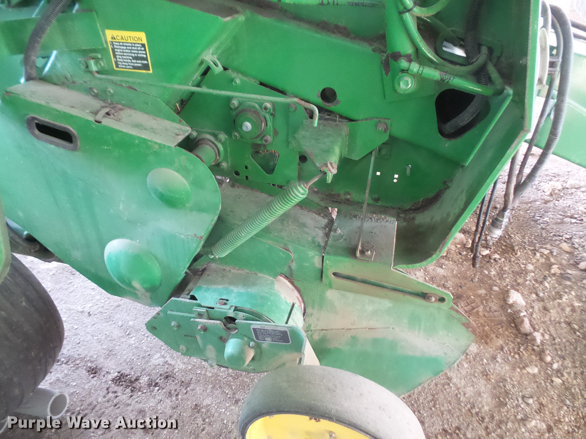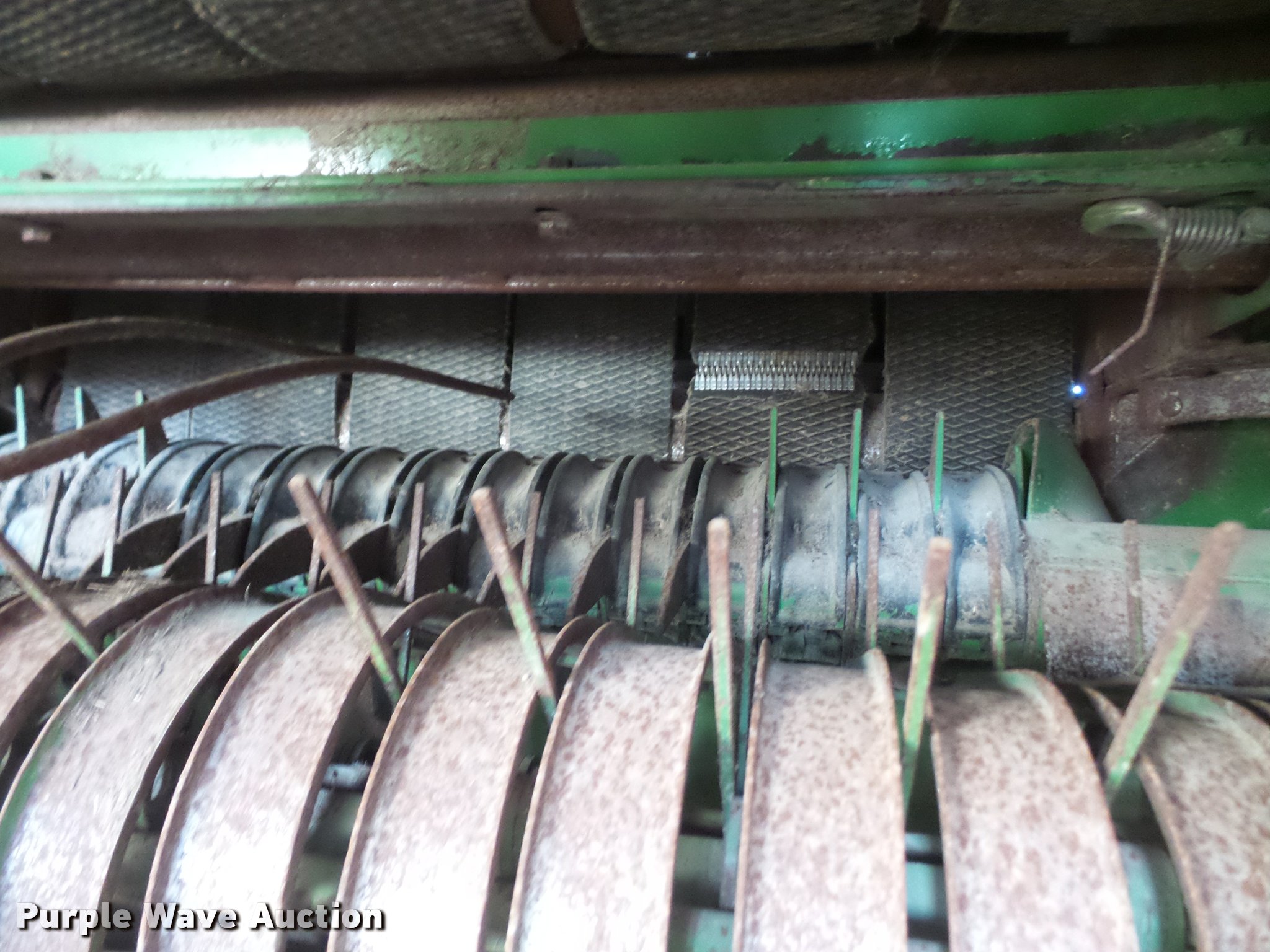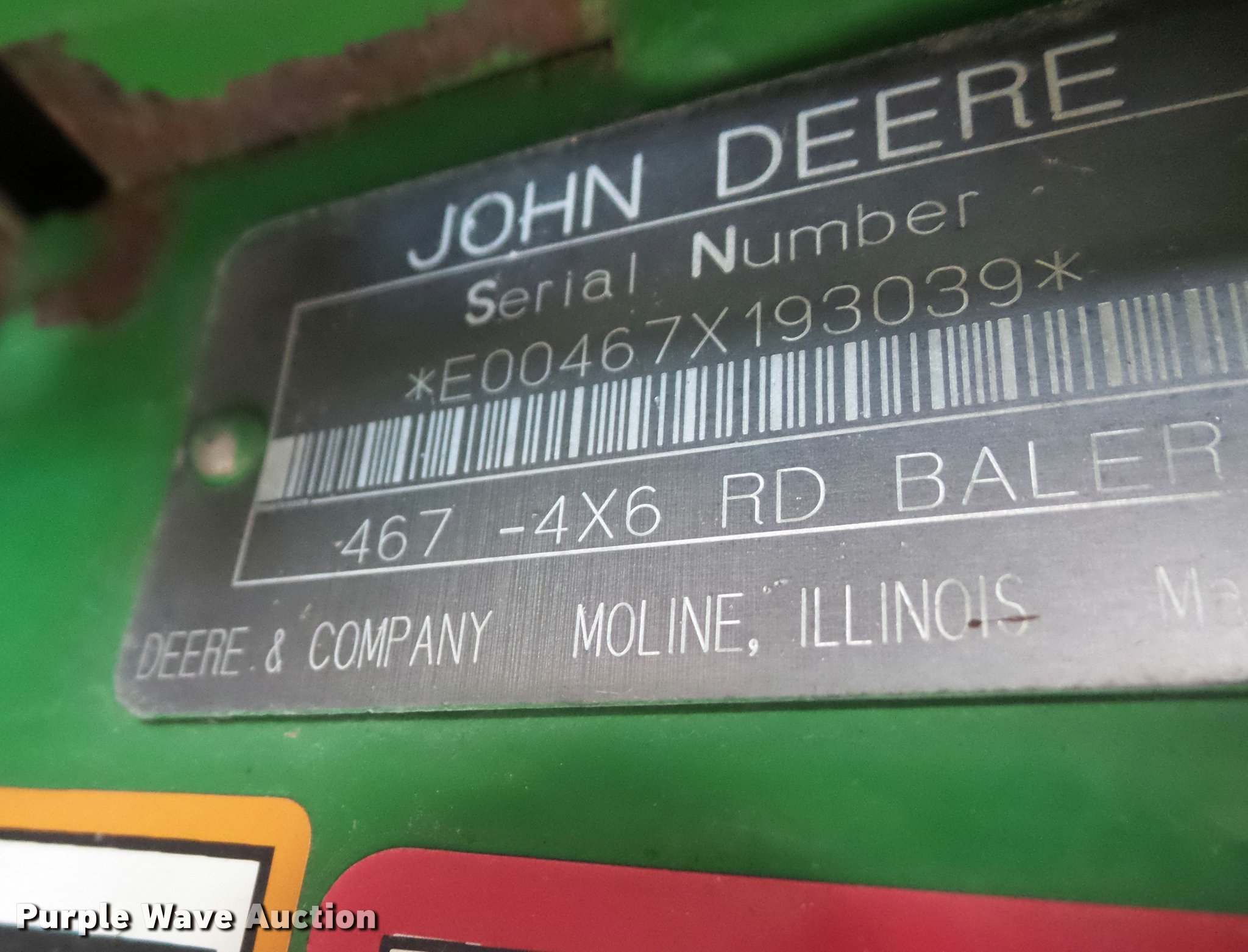 Purple Wave is selling a used Round Baler in Kansas. This item is a 2003 John Deere 467 round baler with the following: Approx. 12,000 bales on counter, 4' x 6' bale capacity, 60"W pickup, Hydraulic pickup lift, Gauge wheels, Twin twine tie, New-wrap, Bale kicker, John Deere monitor, Transport lights, 540 PTO, Pin hitch, 31x13.50-15 tires, Serial E00467X193039