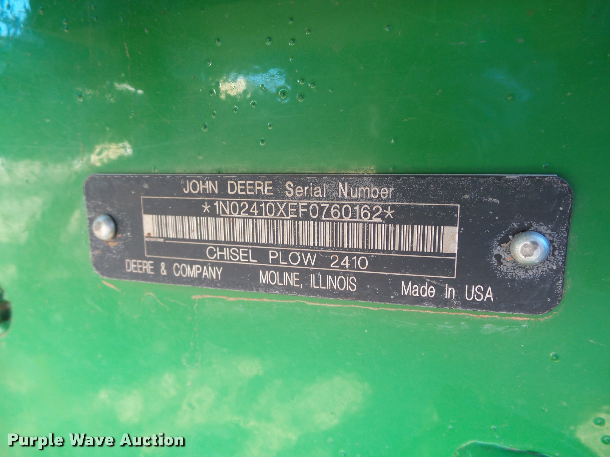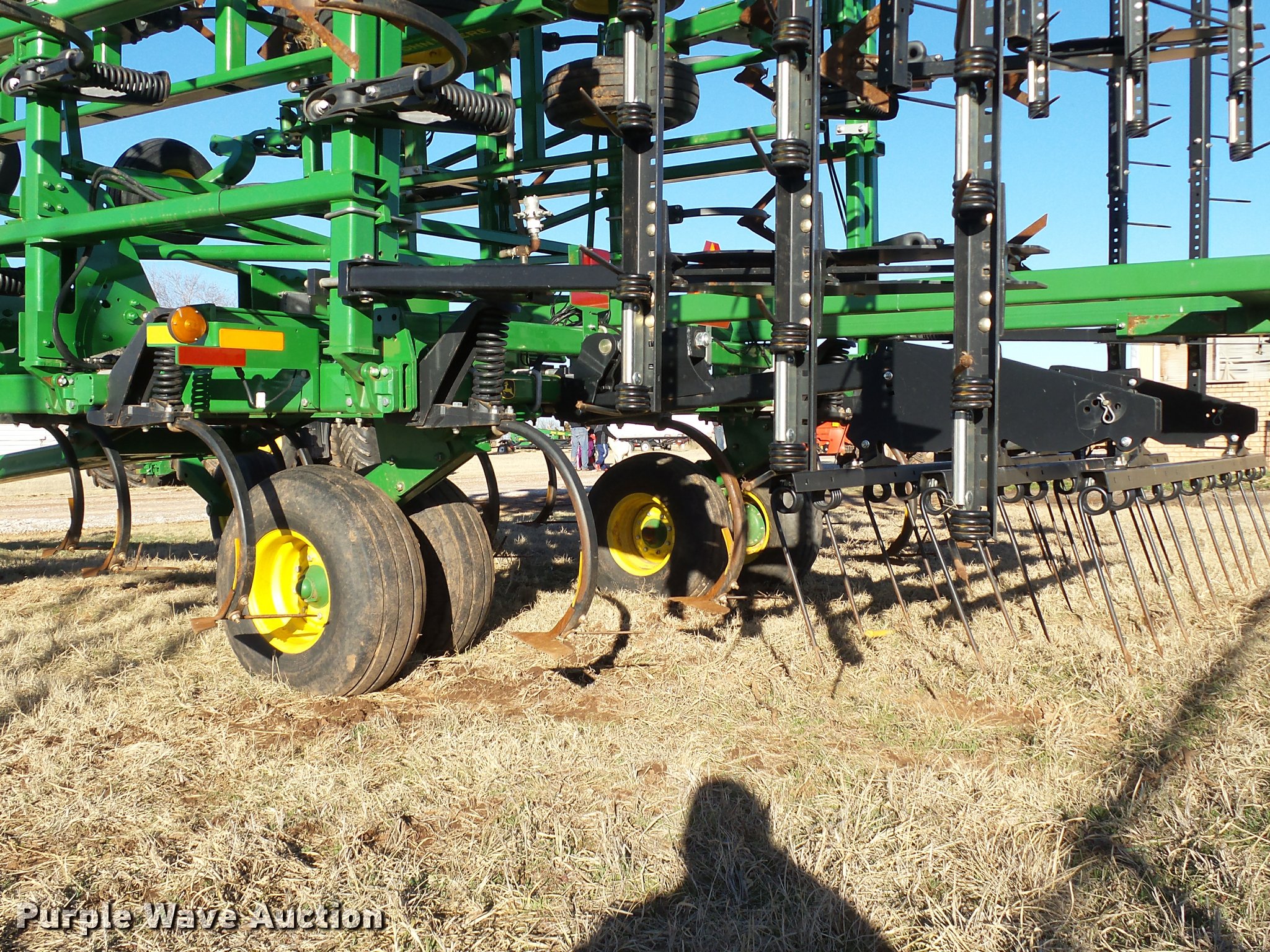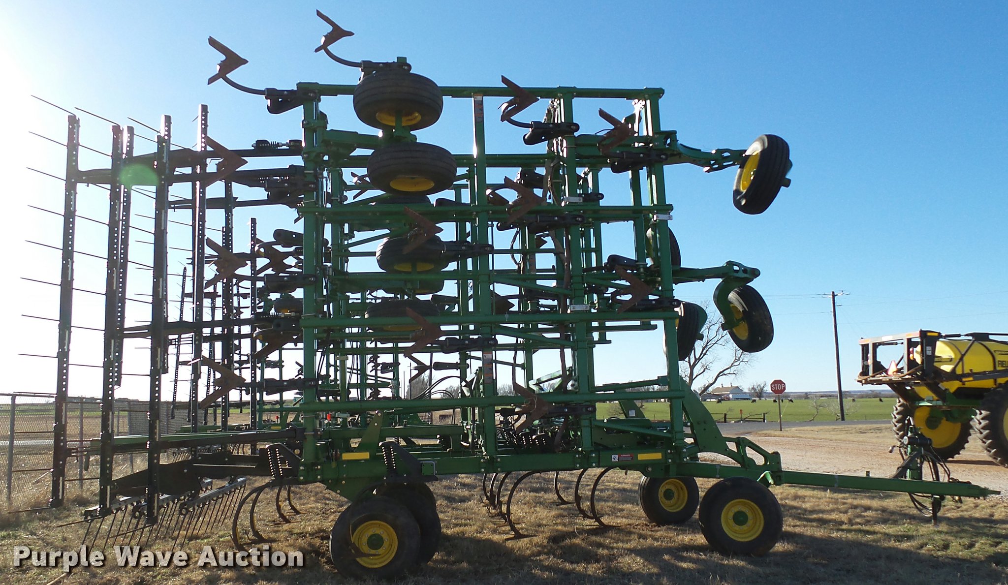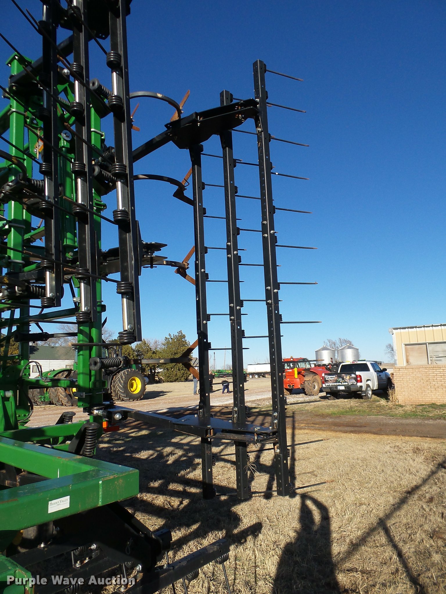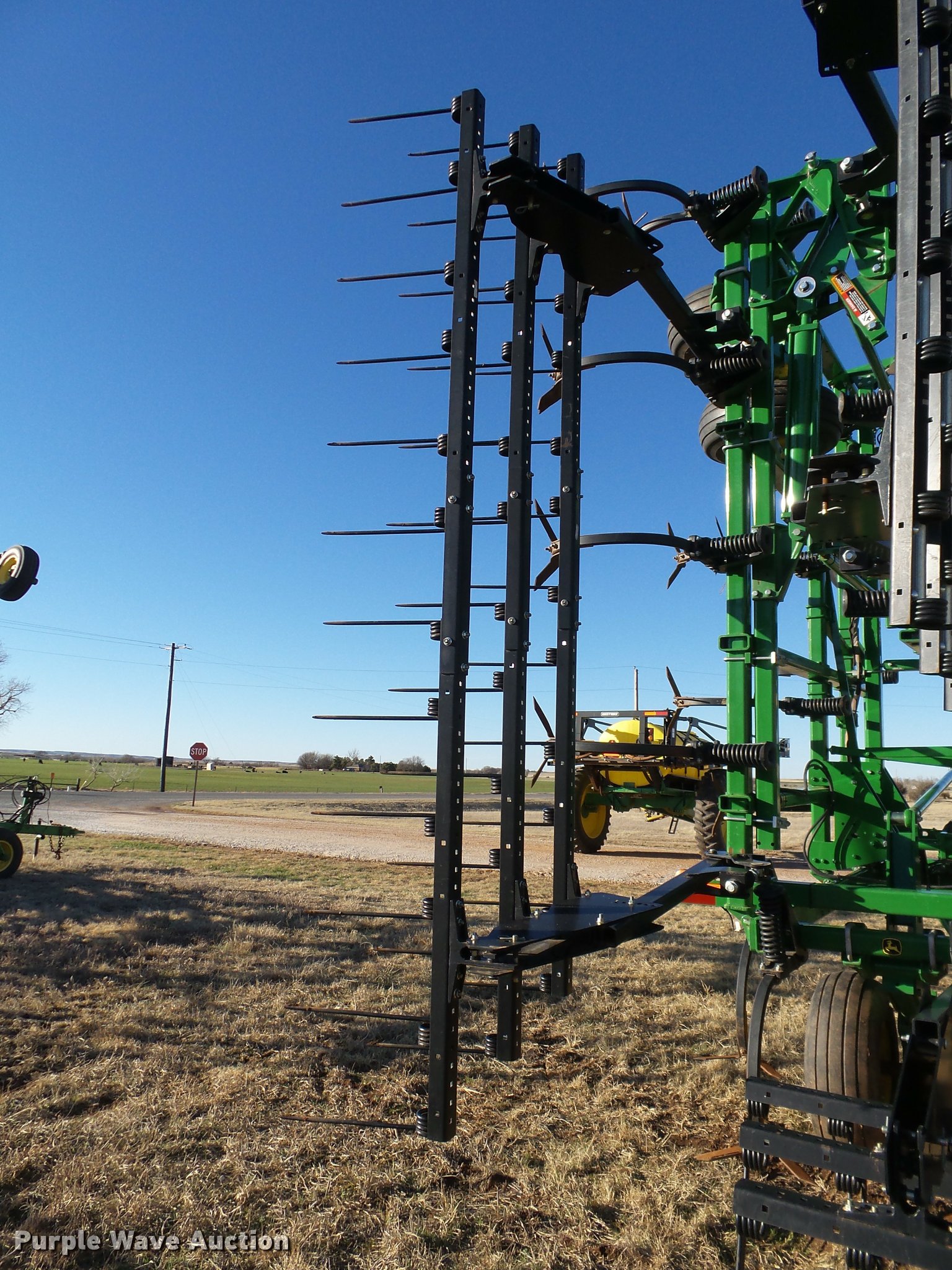 Purple Wave is selling a used Chisel in Oklahoma. This item is a 2015 John Deere 2410 chisel plow with the following: 52'W, Five sections, (52) spring-loaded shanks, 18" sweep width, 12" spacing, Hydraulic lift and fold, Manual leveler, Three bar tine harrow, John Deere 240 coil-tine harrows, AccuDepth system, Soil management system, Transport lights, Slab hitch, Rear pin hitch, Walking tandem axle, 12.5L-15FI tires, Serial 1N02410XEF0760162