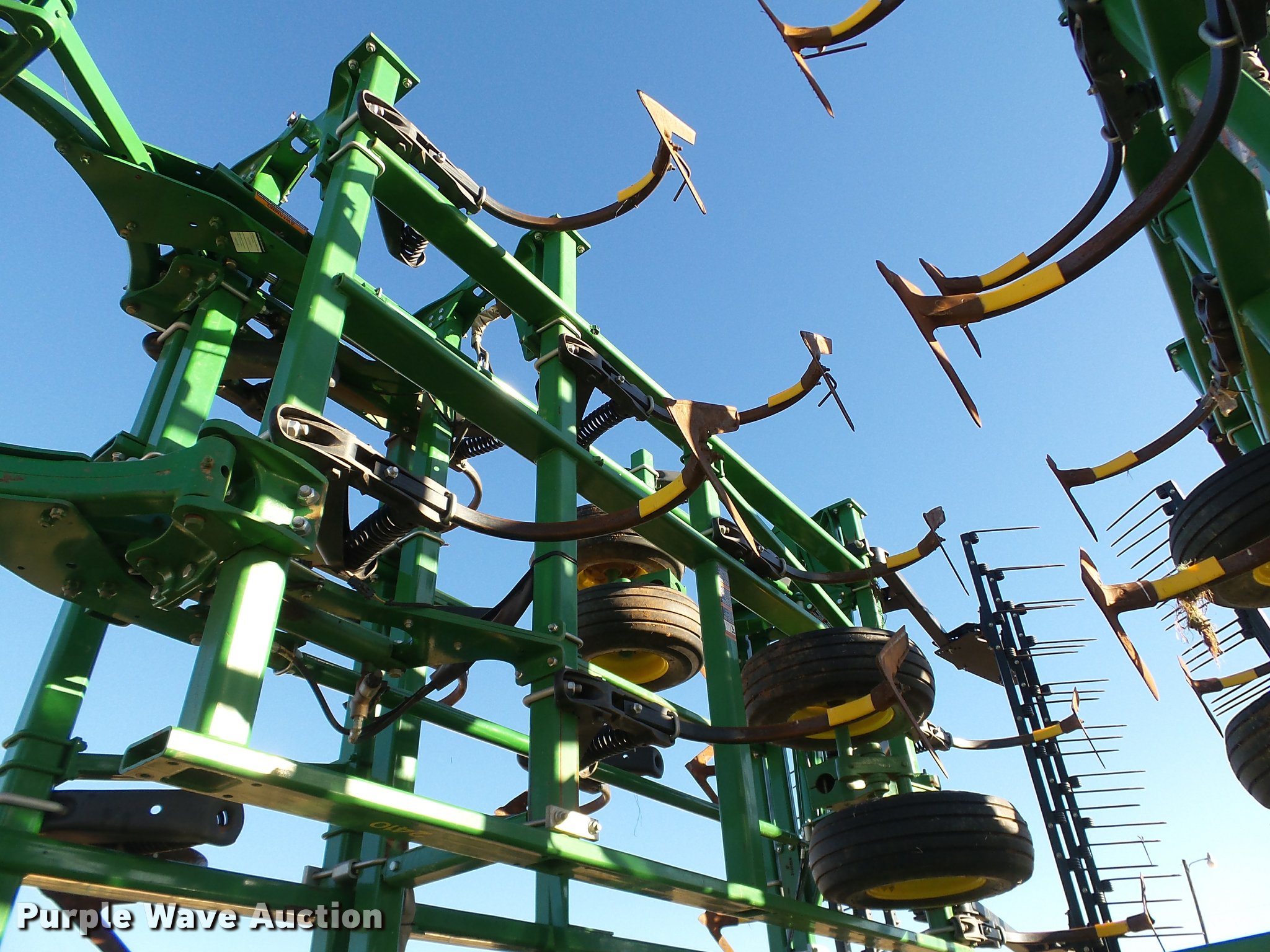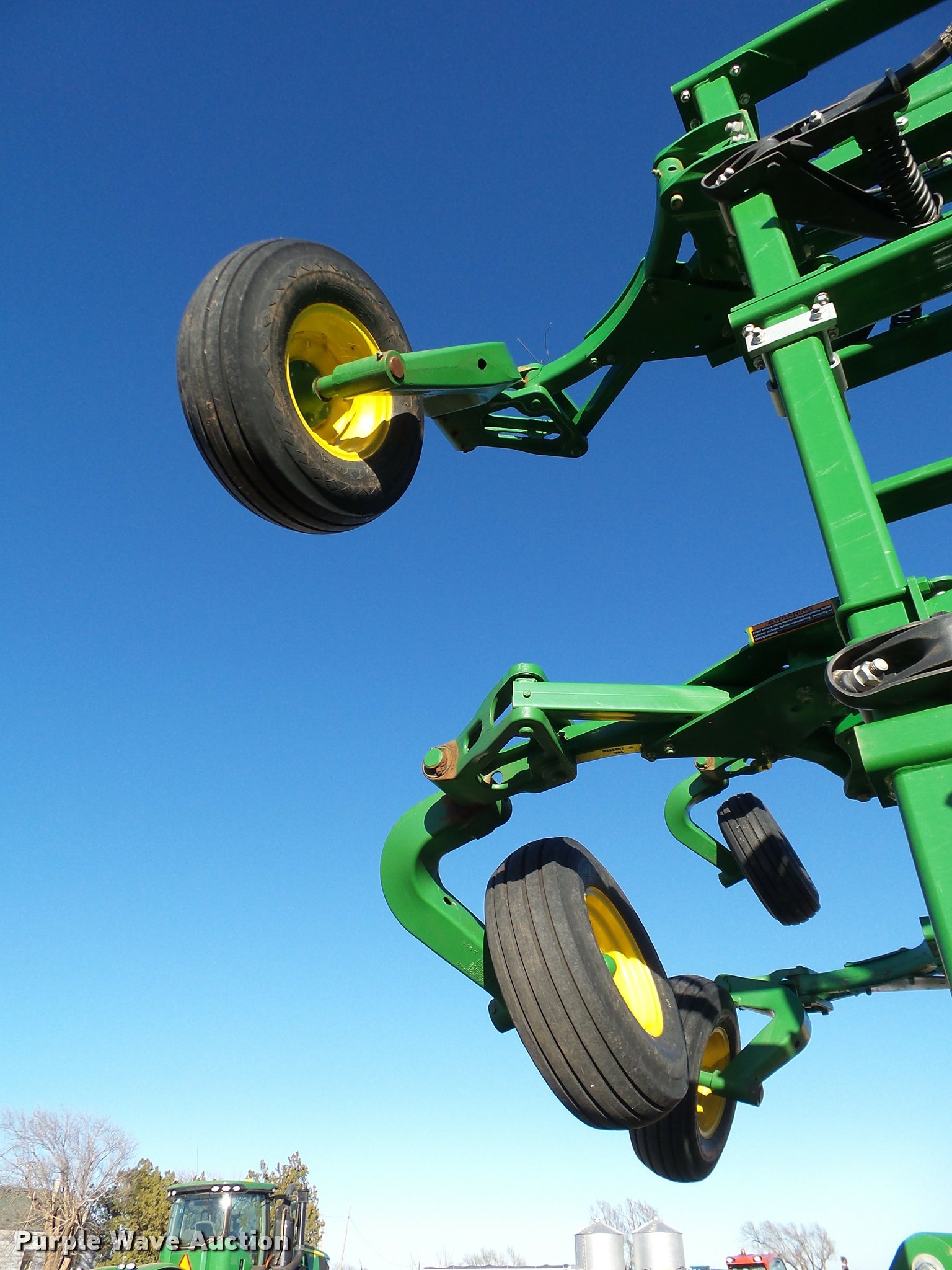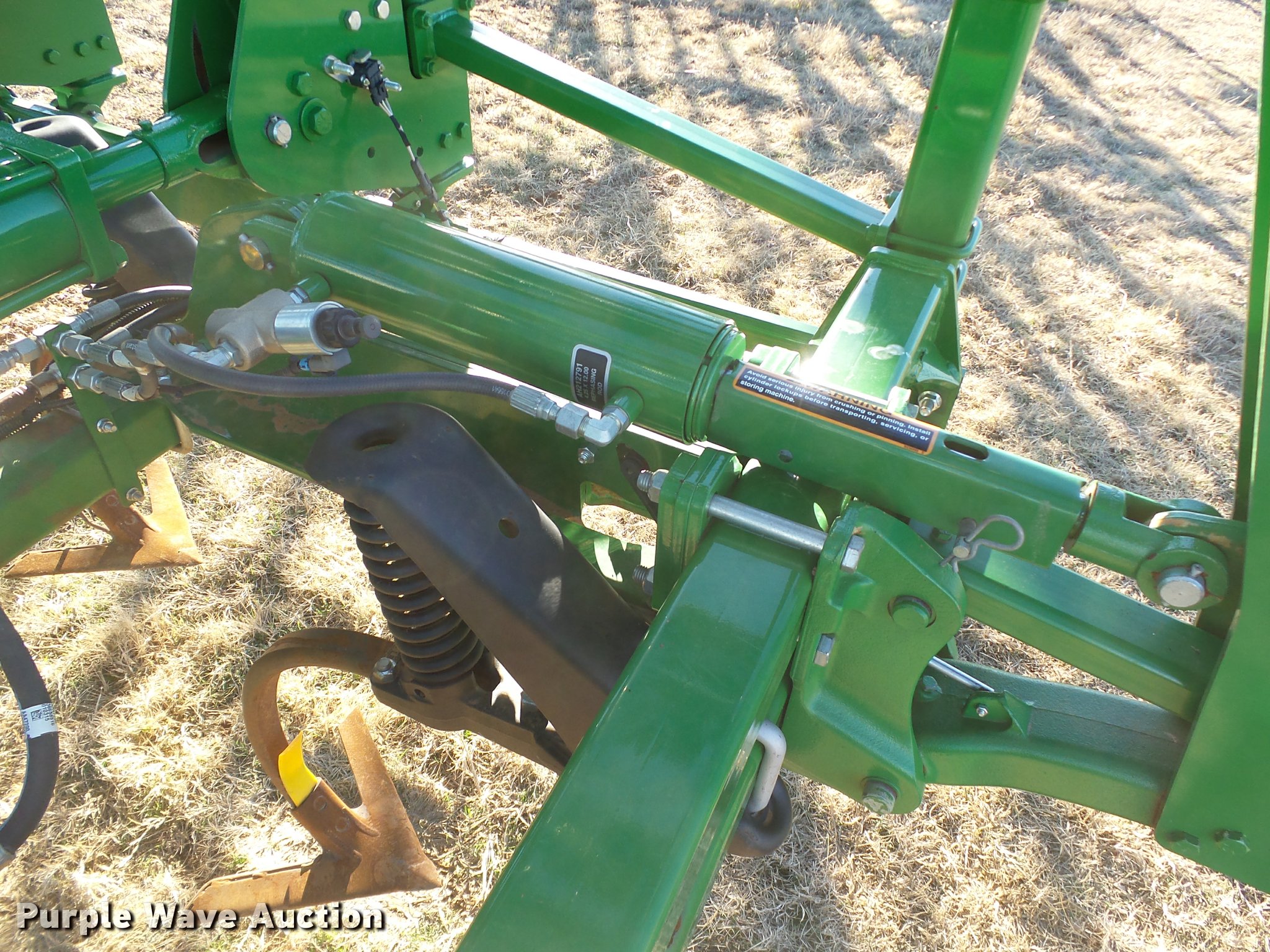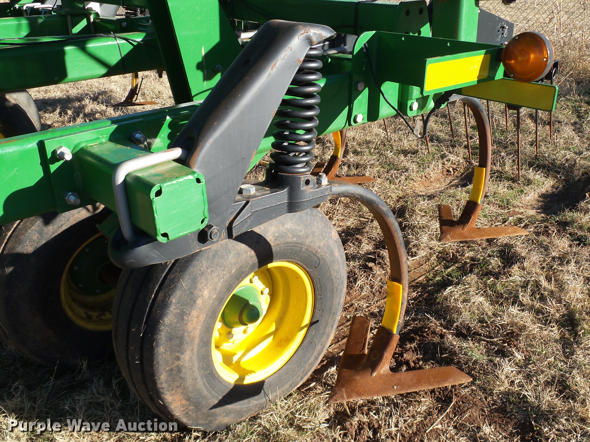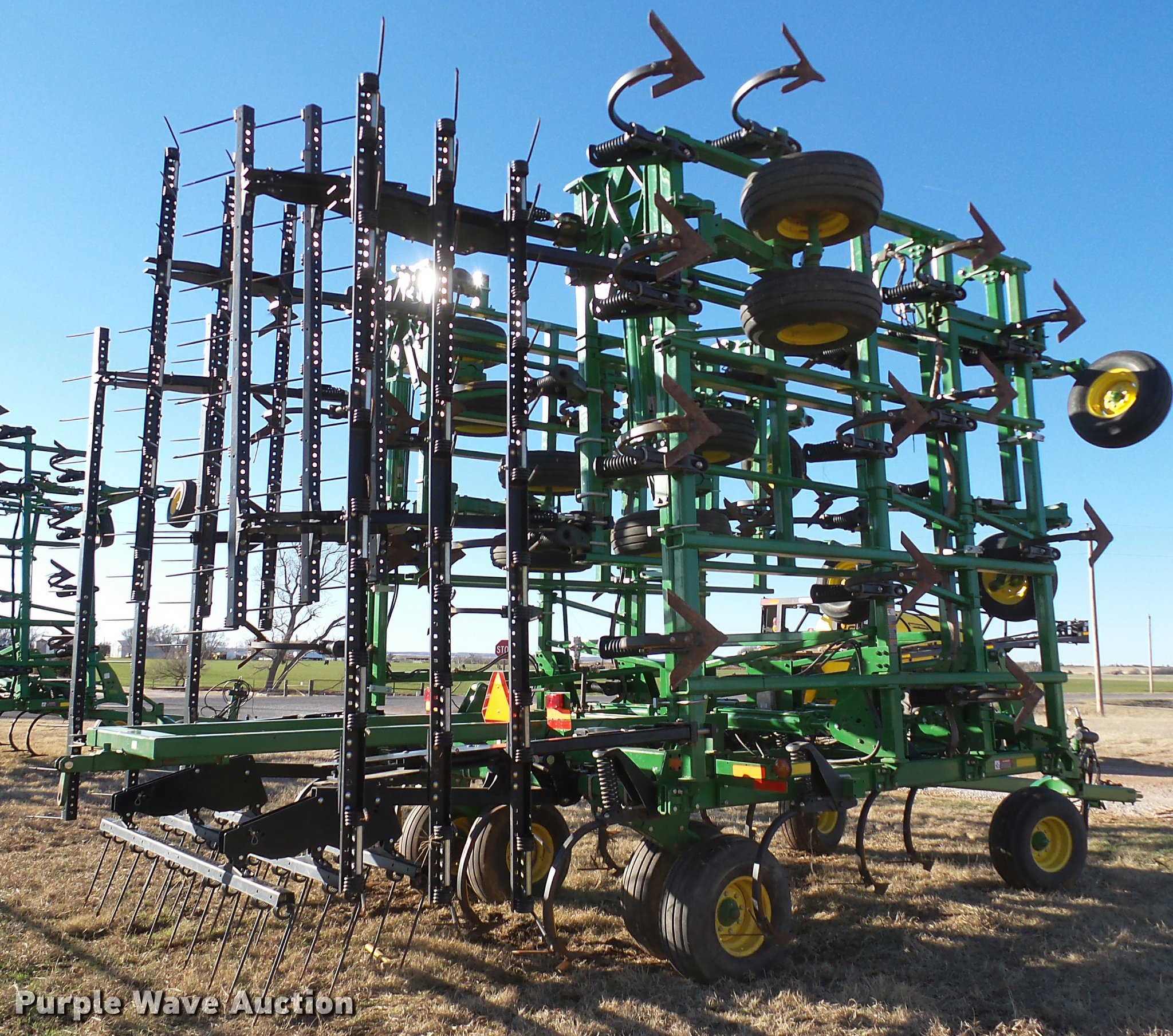 Purple Wave is selling a used Chisel in Oklahoma. This item is a 2015 John Deere 2410 chisel plow with the following: 52'W, Five sections, (52) spring-loaded shanks, 18" sweep width, 12" spacing, Hydraulic lift and fold, Manual leveler, Three bar tine harrow, John Deere 240 coil-tine harrows, AccuDepth system, Soil management system, Transport lights, Slab hitch, Rear pin hitch, Walking tandem axle, 12.5L-15FI tires, Serial 1N02410XEF0760162