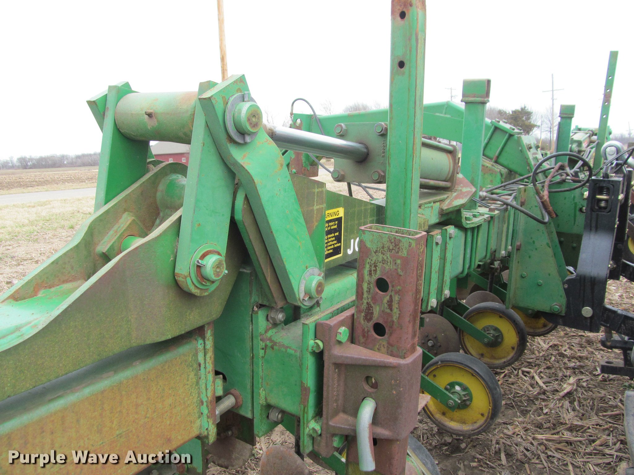 Purple Wave is selling a used Row Crop Cultivator in Kansas. This item is a John Deere 855 cultivator with the following: 12 rows, 30" row spacing, 17" disks, 16" shovel shanks, Row shields, Hydraulic riase and lower, Hydraulic fold wings, Three point, 15" gauge wheels, 20.5x8.0-10 gauge tires, 11L-15 transport tires, Serial N00885X001945