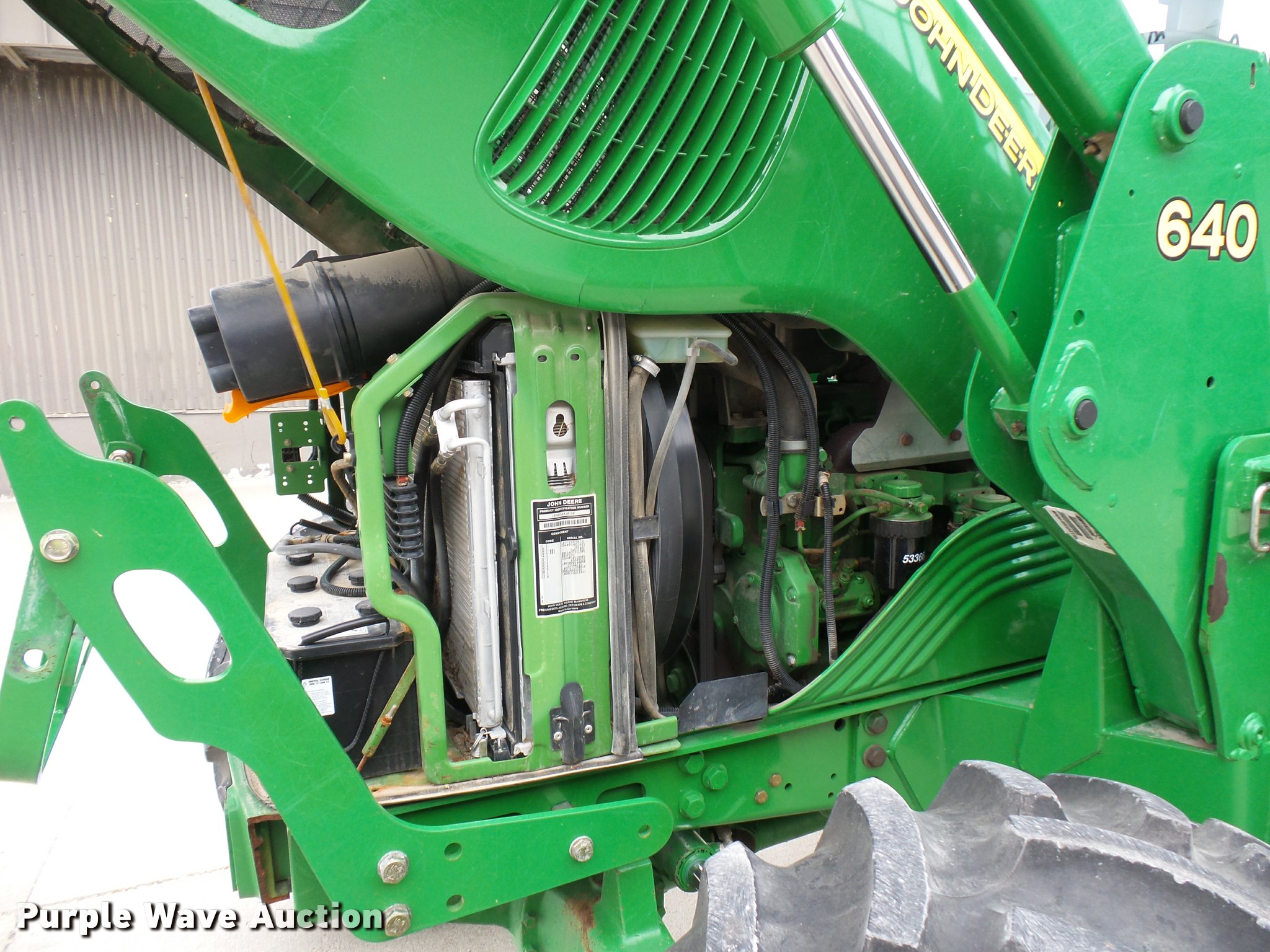 Purple Wave is selling a used Tractor in Missouri. This item is a 2004 John Deere 6415 MFWD tractor with the following: 686 hours on meter, John Deere 4045HL272 four cylinder turbo diesel engine, Shuttle shift transmission, 16F-16R gears, AC and heat, AM/FM, John Deere 640 loader, 85"W bucket, Three point, Top link, 540 PTO, (2) rear hydraulic remote sets, 13.6-24 front tires, 18.4-34 rear tires, Box blade selling separately as item L4632, Serial L06415B410750