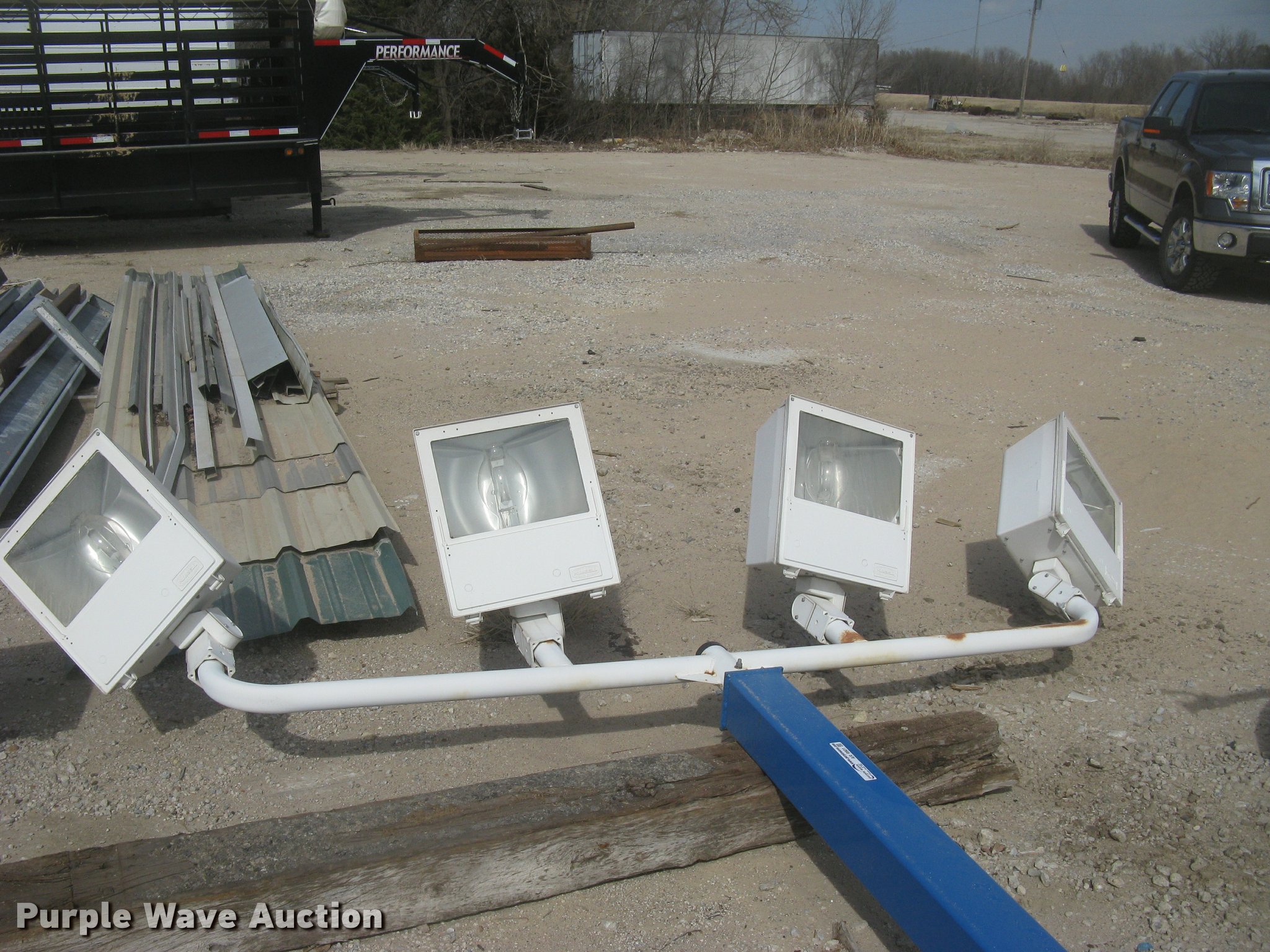 Purple Wave is selling a used Building Materials in Kansas. This item is a (7) commercial light poles with the following: (4) three light heads, One light box damaged, (2) four light heads, One pole only, Hubbell light boxes, 20'L poles, 5" x 5" poles, 12" x 12" base, Outlets toward ground level, Direct wired through bottom of pole, Working when removed from service a year ago