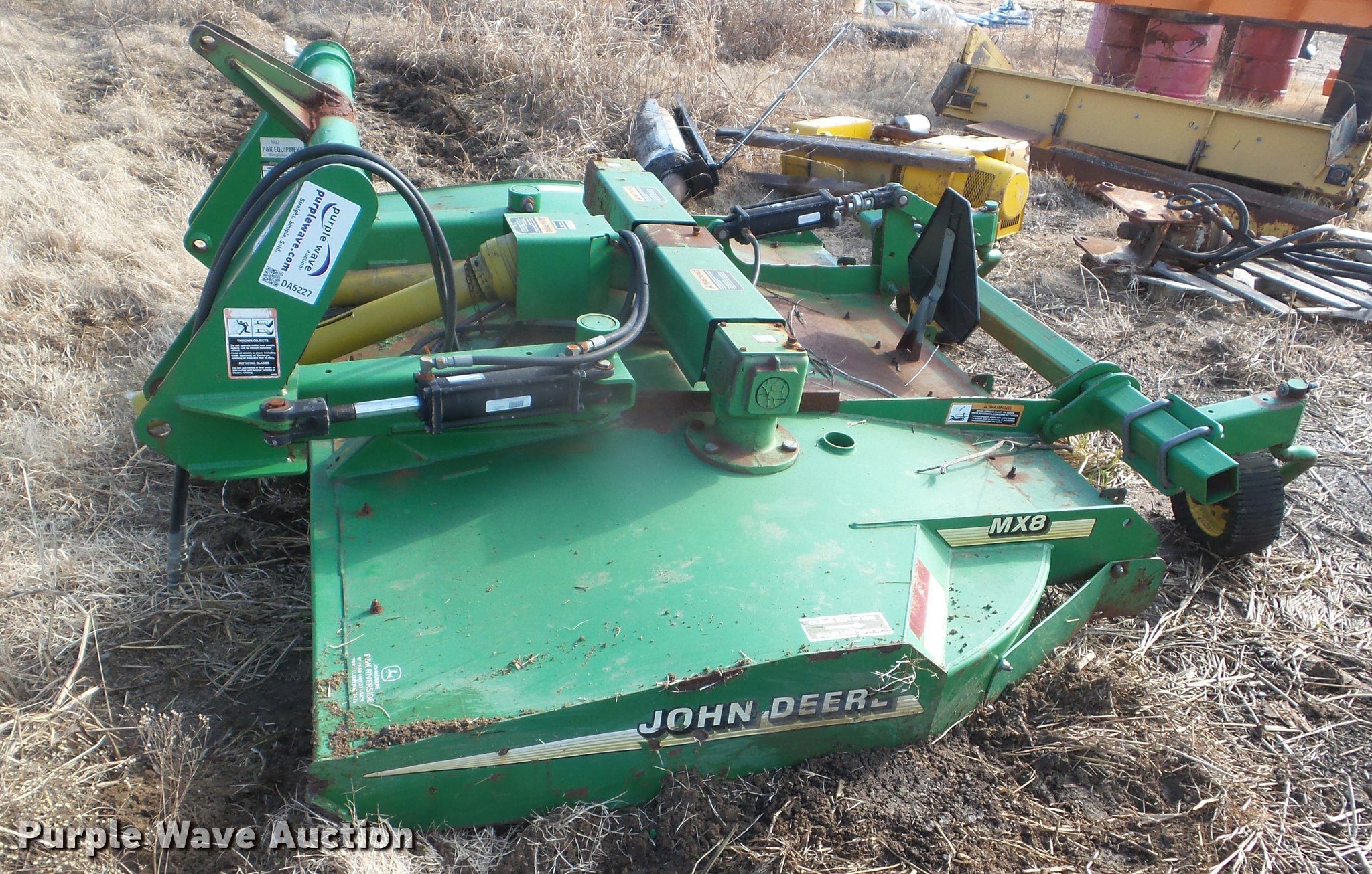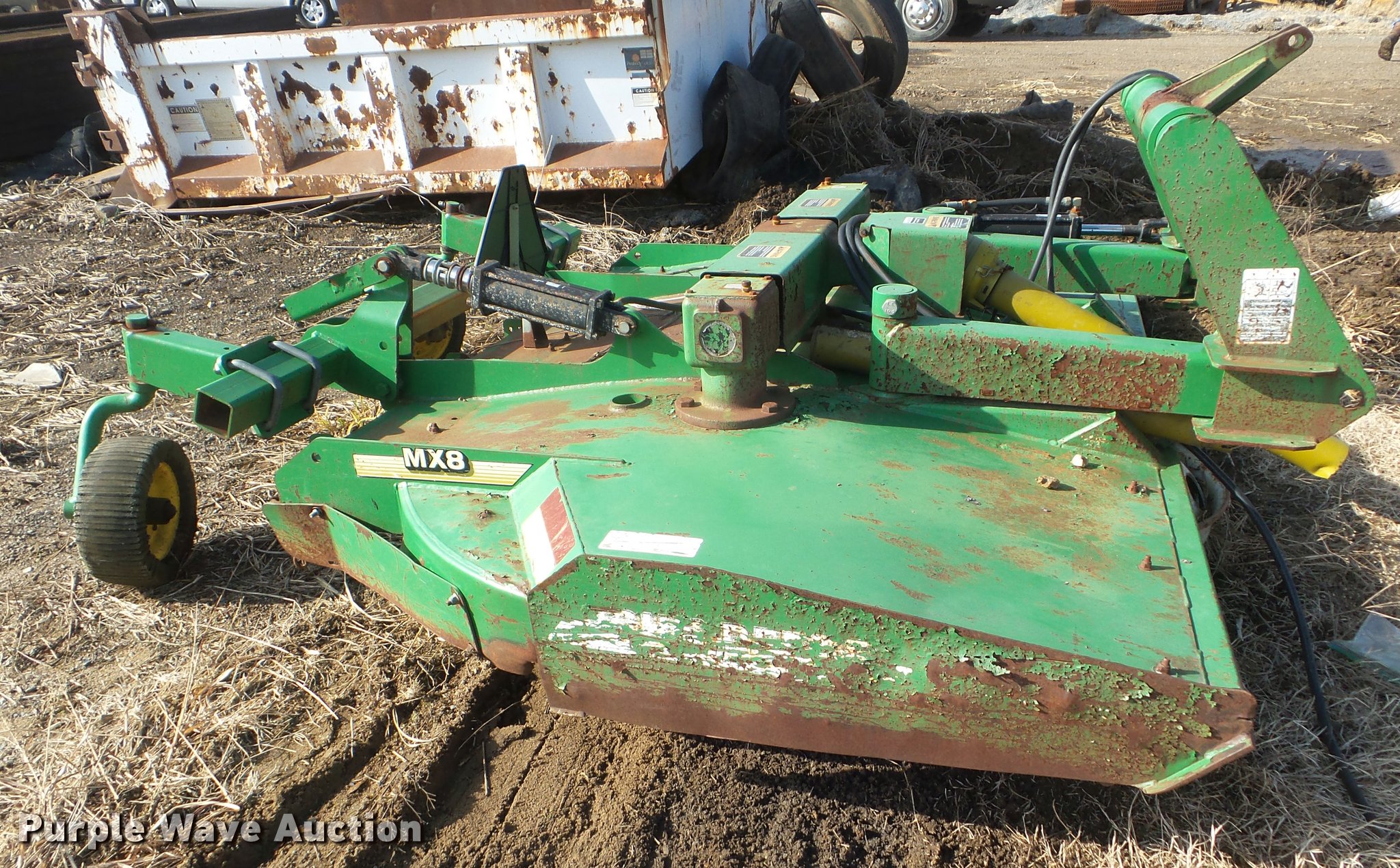 Purple Wave is selling a used Mower, Cutter, Shredder in Oklahoma. This item is a John Deere MX8 rotary mower with the following: 8'W, Hydraulic lift and swing, Three point, (2) 13" solid tires, PTO yoke missing, Unknown operating condition, Serial W00MX86009111