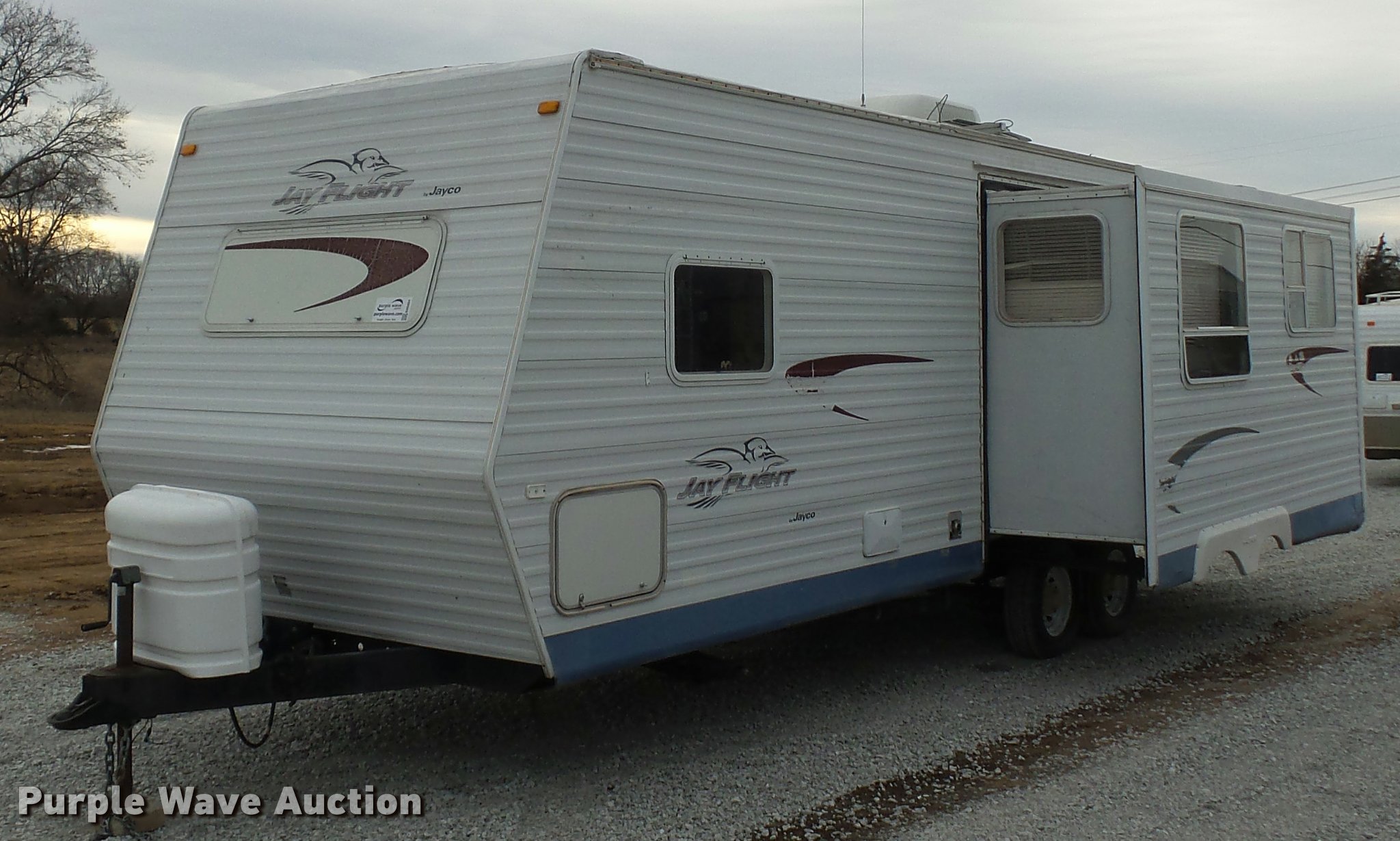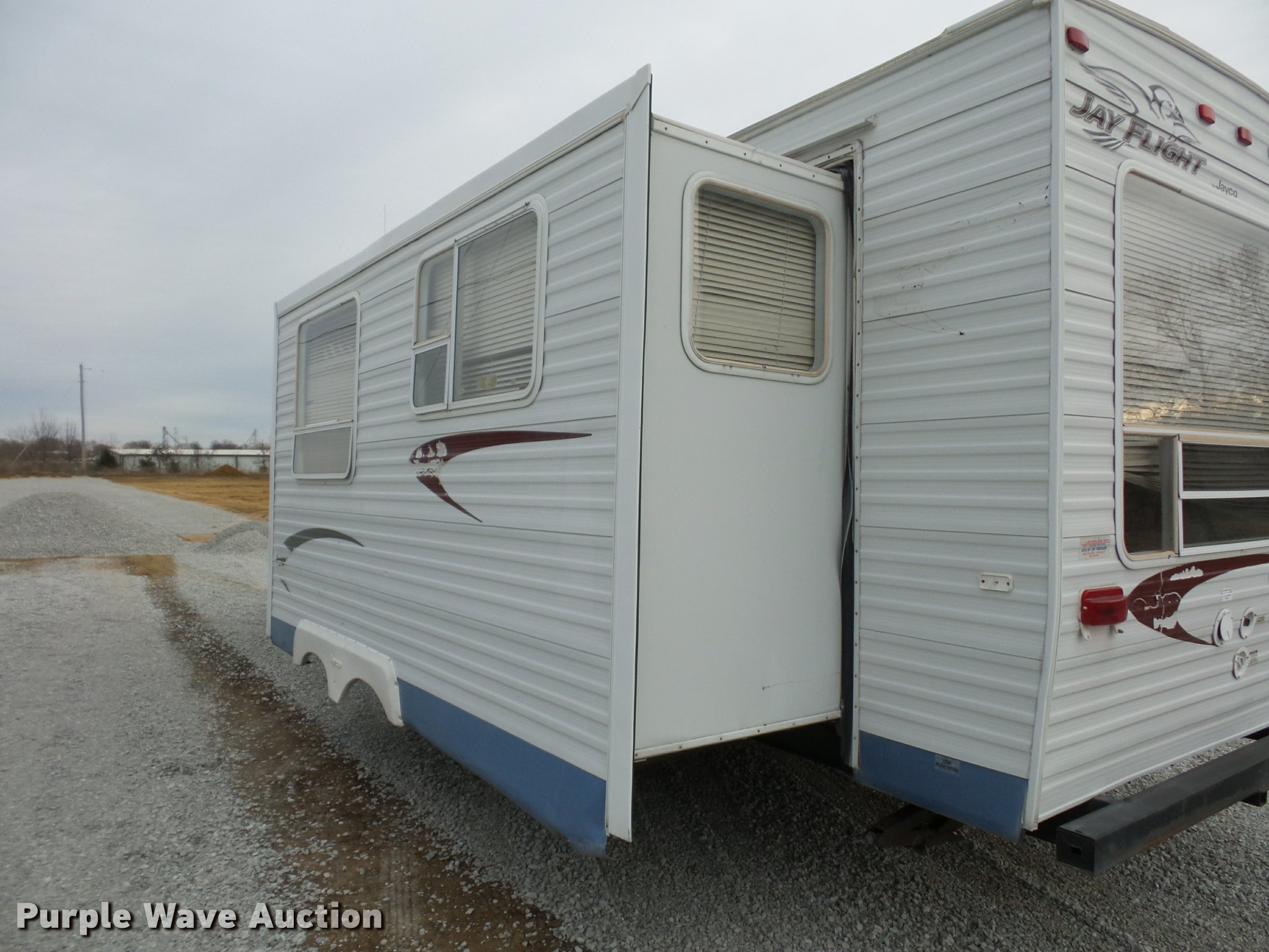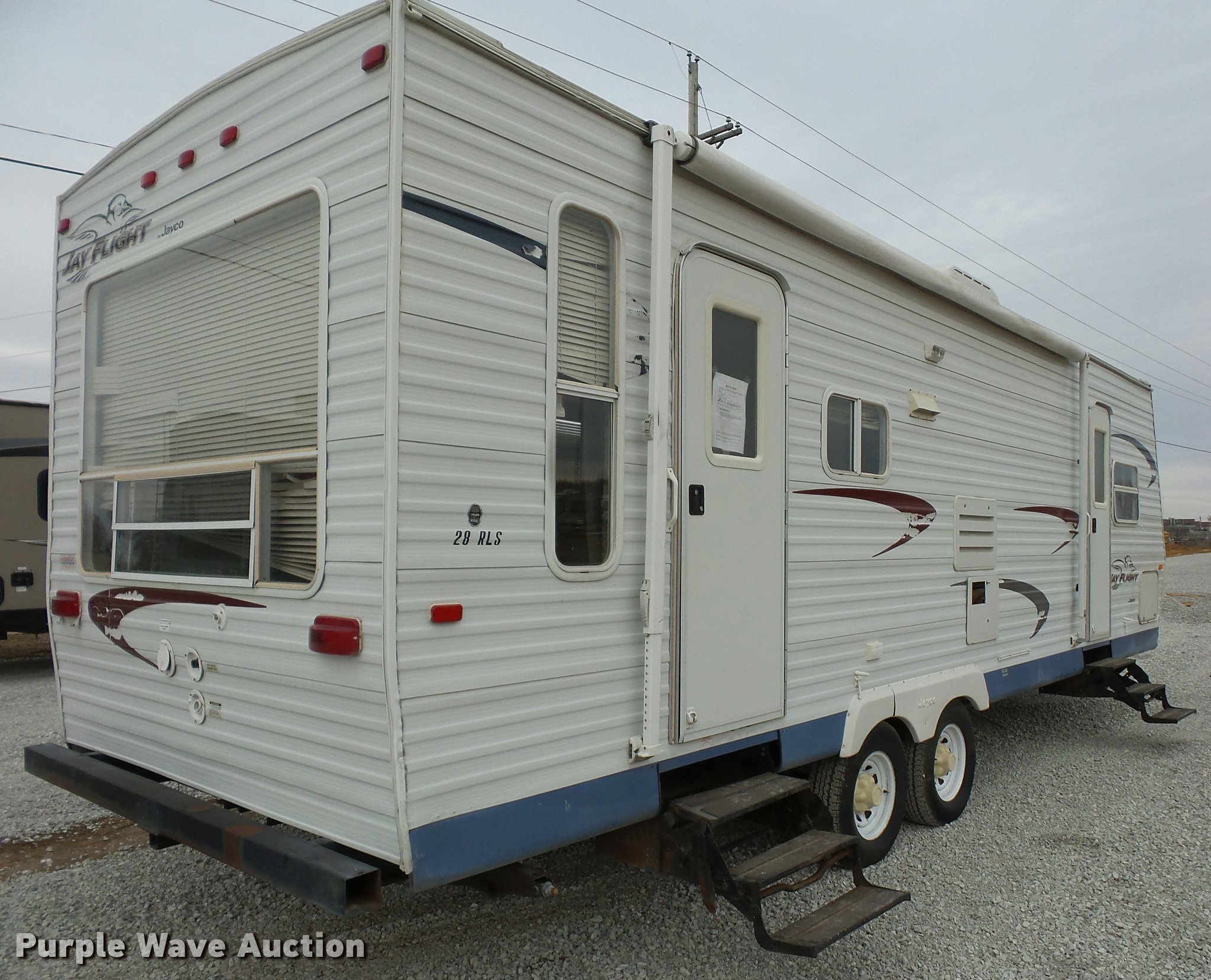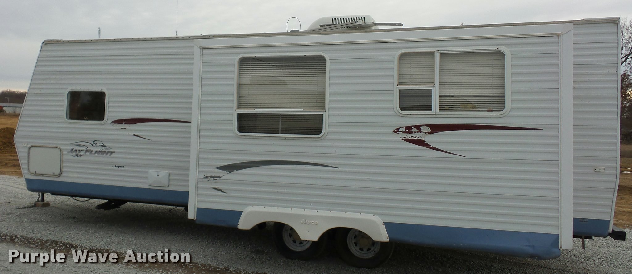 Purple Wave is selling a used RV in Missouri. This item is a 2004 Jayco Jayflight camper with the following: 27'L, Slide-out, Kitchen, Stove, Refrigerator/freezer, Sink, Microwave, Bathroom, Sink, Toilet, Shower, Awning, Manual jack, 2 5/16" ball hitch, 225/75R15 tires, GVWR 6,500 lbs