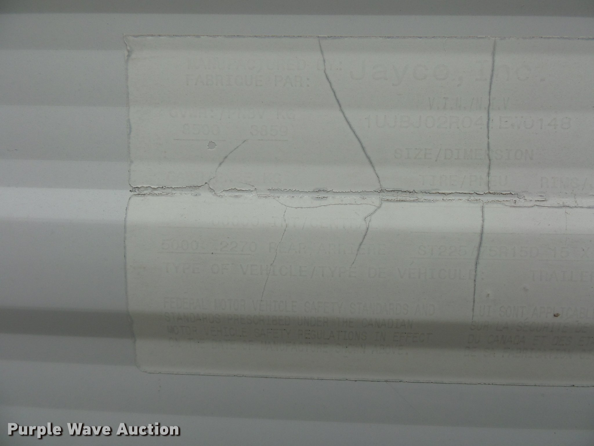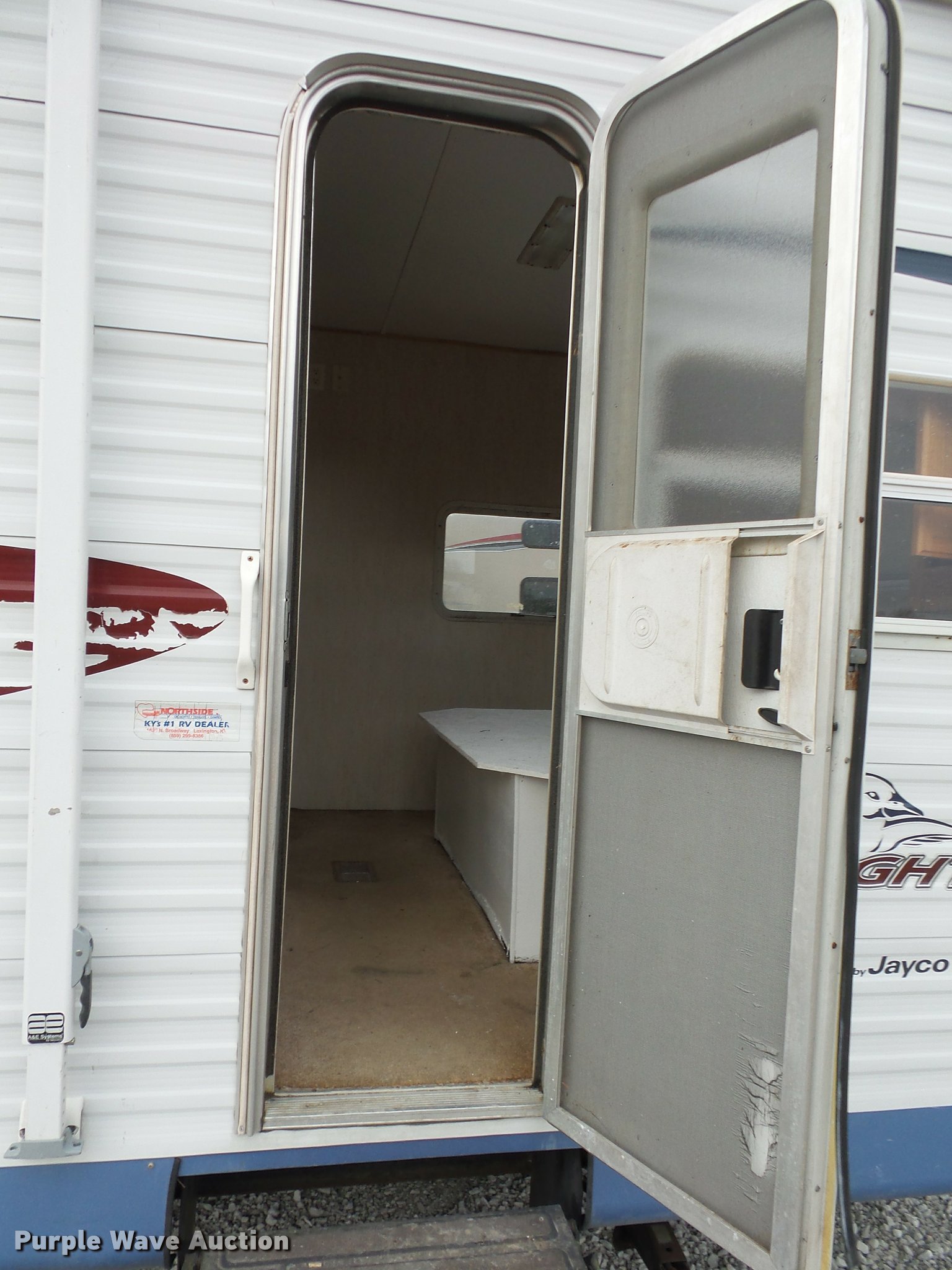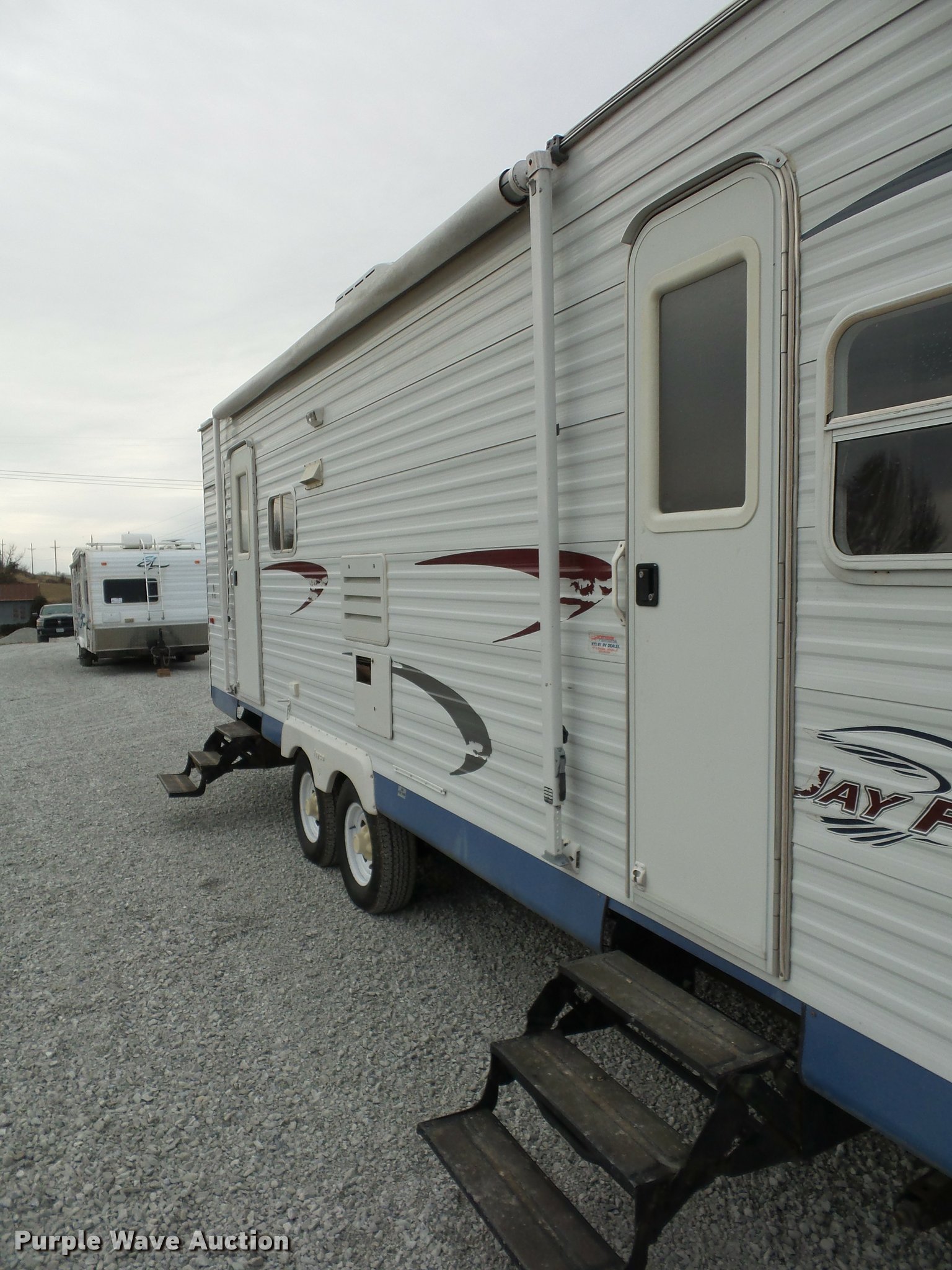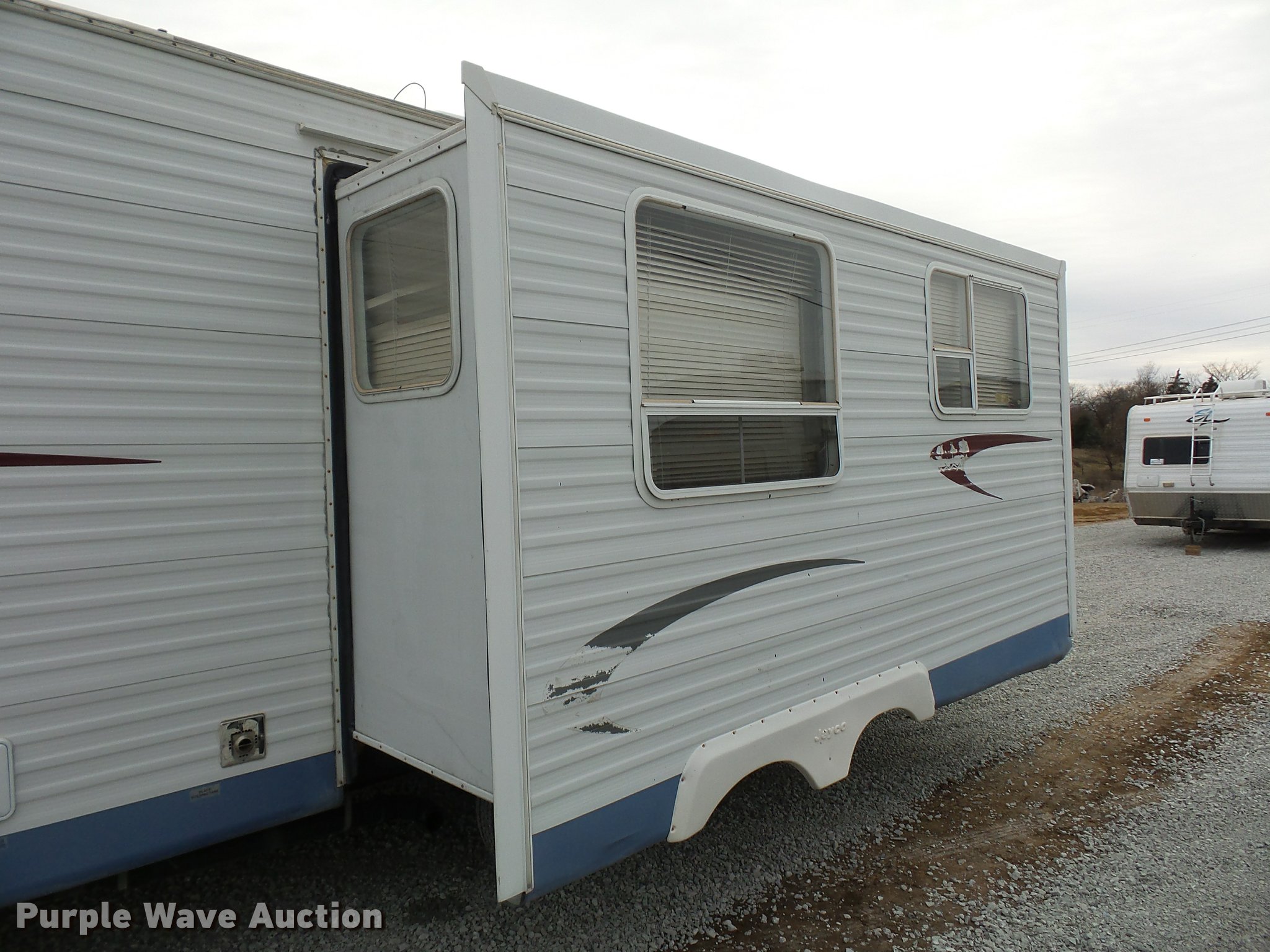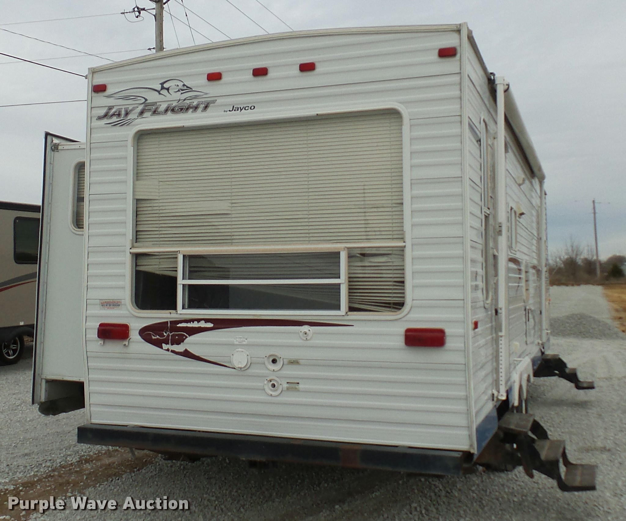 Purple Wave is selling a used RV in Missouri. This item is a 2004 Jayco Jayflight camper with the following: 27'L, Slide-out, Kitchen, Stove, Refrigerator/freezer, Sink, Microwave, Bathroom, Sink, Toilet, Shower, Awning, Manual jack, 2 5/16" ball hitch, 225/75R15 tires, GVWR 6,500 lbs