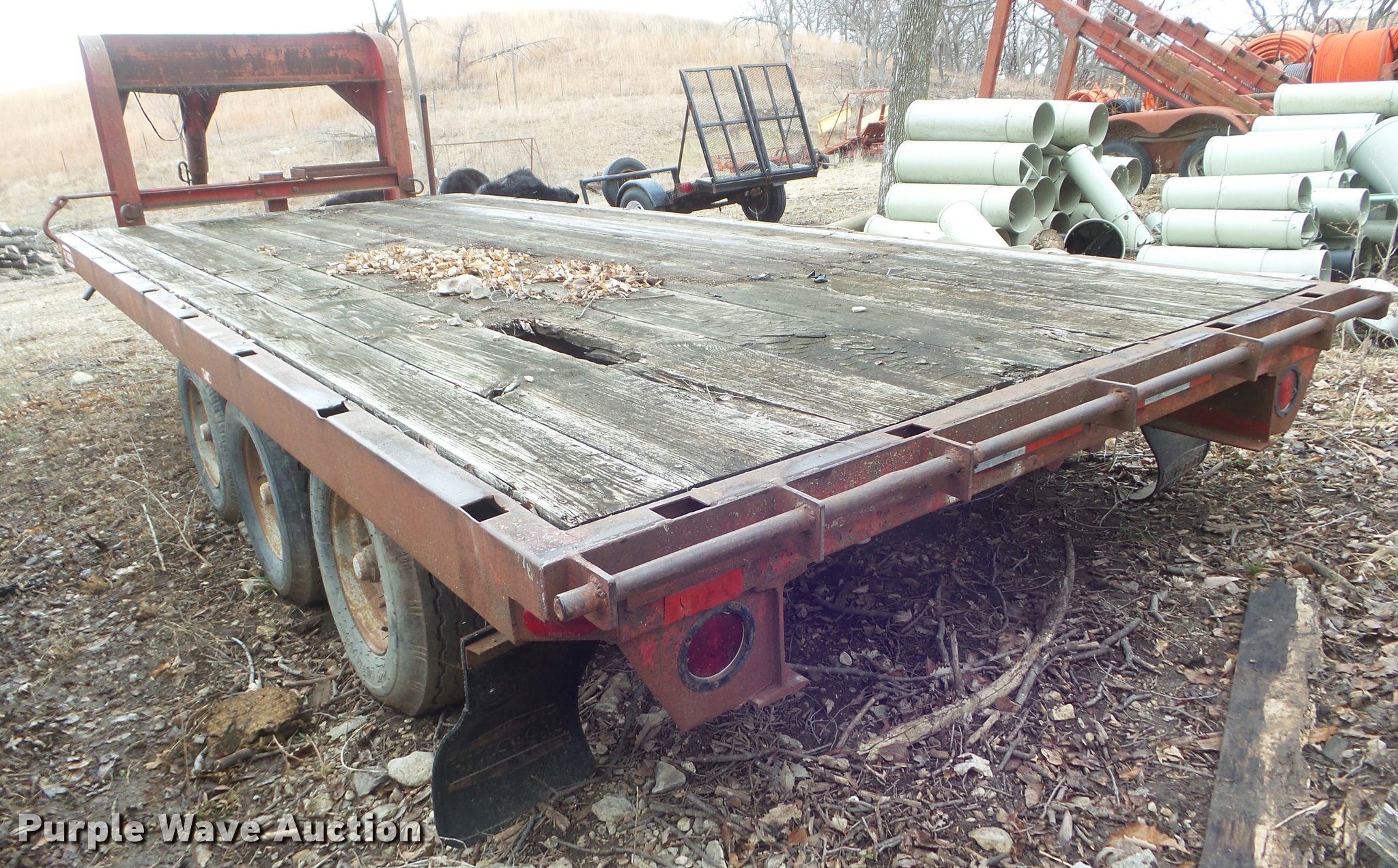 Purple Wave is selling a used Equip. Trailer in Kansas. This item is a 1977 Hillsboro equipment trailer with the following: 18'L x 94"W, Wood deck, Stake pockets, Gooseneck hitch, Single leg landing gear, Electric brakes, Triple axle, Steel wheels, 9-14.5 tires, Deck damaged