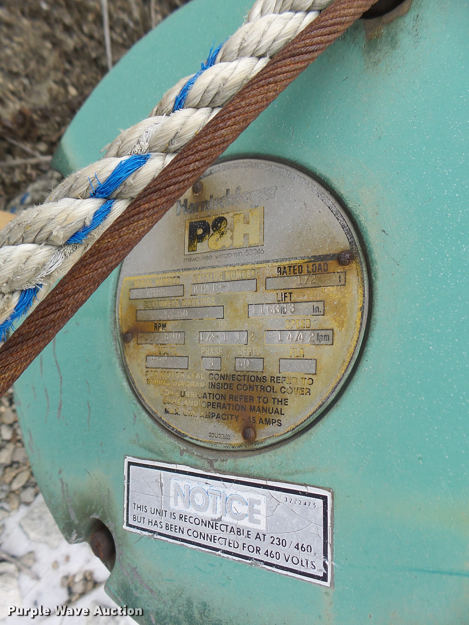 Purple Wave is selling a used Crane Attach. in Missouri. This item is a P & H swing crane with the following: 460V, Three phase, 1/2 ton capacity, Serial 7998