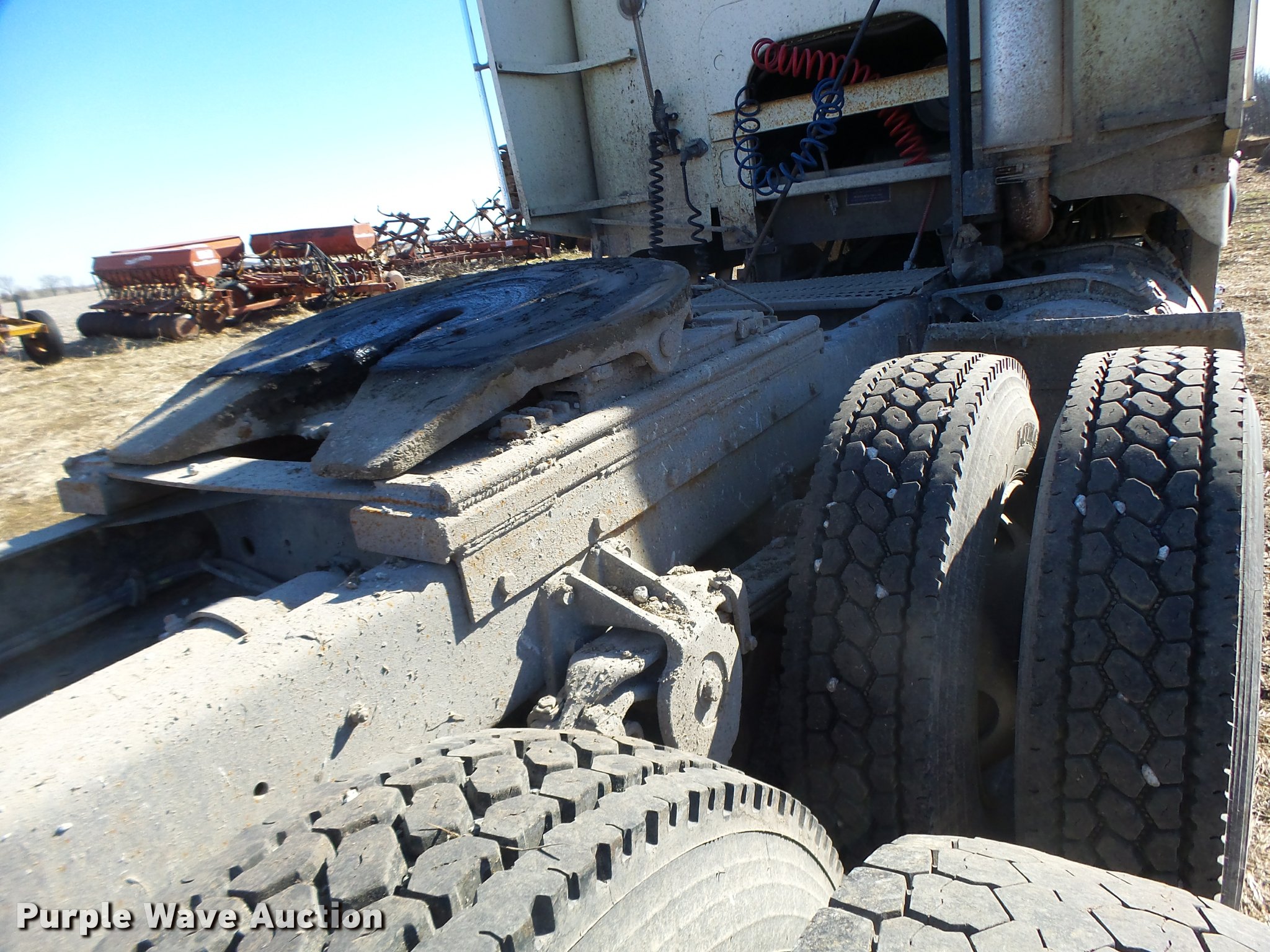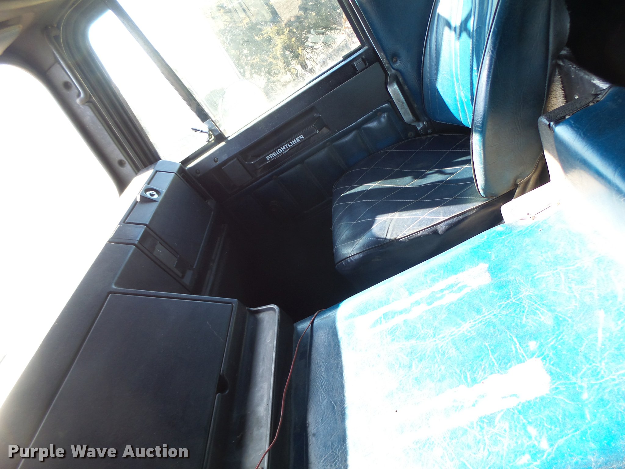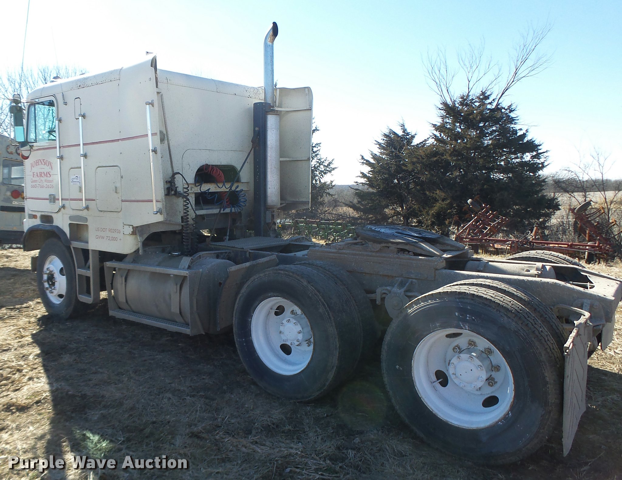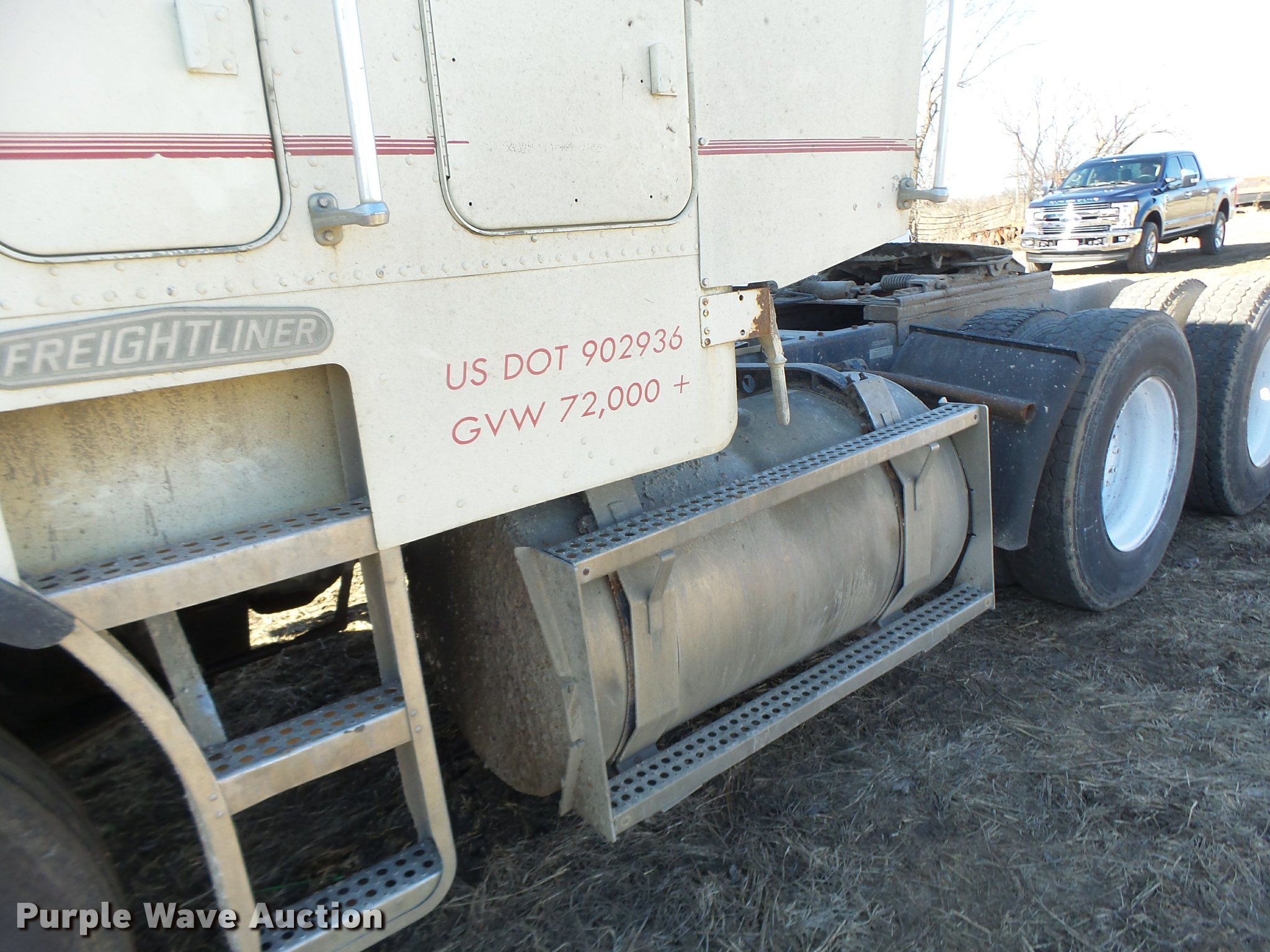 Purple Wave is selling a used Truck Tractor in Missouri. This item is a 1986 Freightliner semi truck with the following: 860,467 miles on odometer, Six cylinder diesel engine, Eaton Fuller Road Ranger nine speed manual transmission, Tandem axle, Inter-axle differential lock, Heat, AM/FM/cassette, Air suspension seat, Sleeper, Single bed, Single exhaust stack, Aluminum deck plate, Sliding fifth wheel plate, Dual fuel tanks, Mud flaps, Spring suspension, Air brakes, 11R22.5 tires