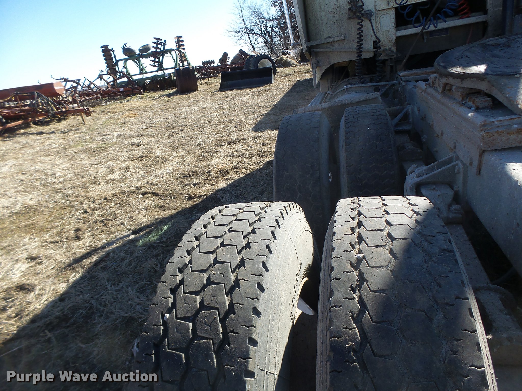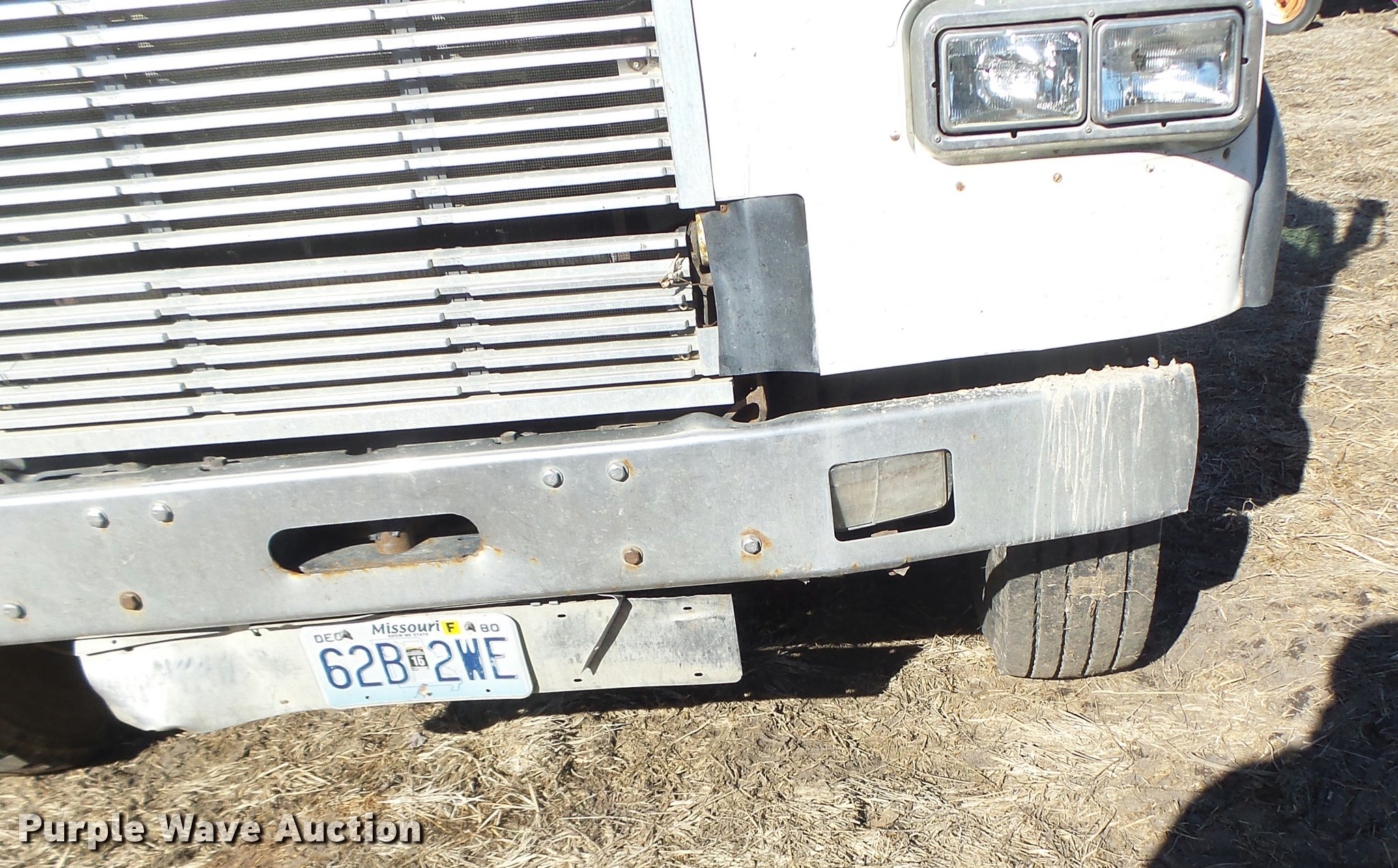 1986 Freightliner semi truck. 860,467 miles on odometer, Six cylinder diesel engine, Eaton Fuller Road Ranger nine speed manual transmission, Tandem axle, Inter-axle differential lock, Heat, AM/FM/cassette, Air suspension seat, Sleeper Single bed, Single exhaust stack, Aluminum deck plate, Sliding fifth wheel plate, Dual fuel tanks, Mud flaps, Spring suspension, Air brakes, 11R22.5 tires. Missouri title. 1FUEYRYB6GP281658. Johnson Brothers Farms. 15777 Hwy P. Queen City, MO 63561