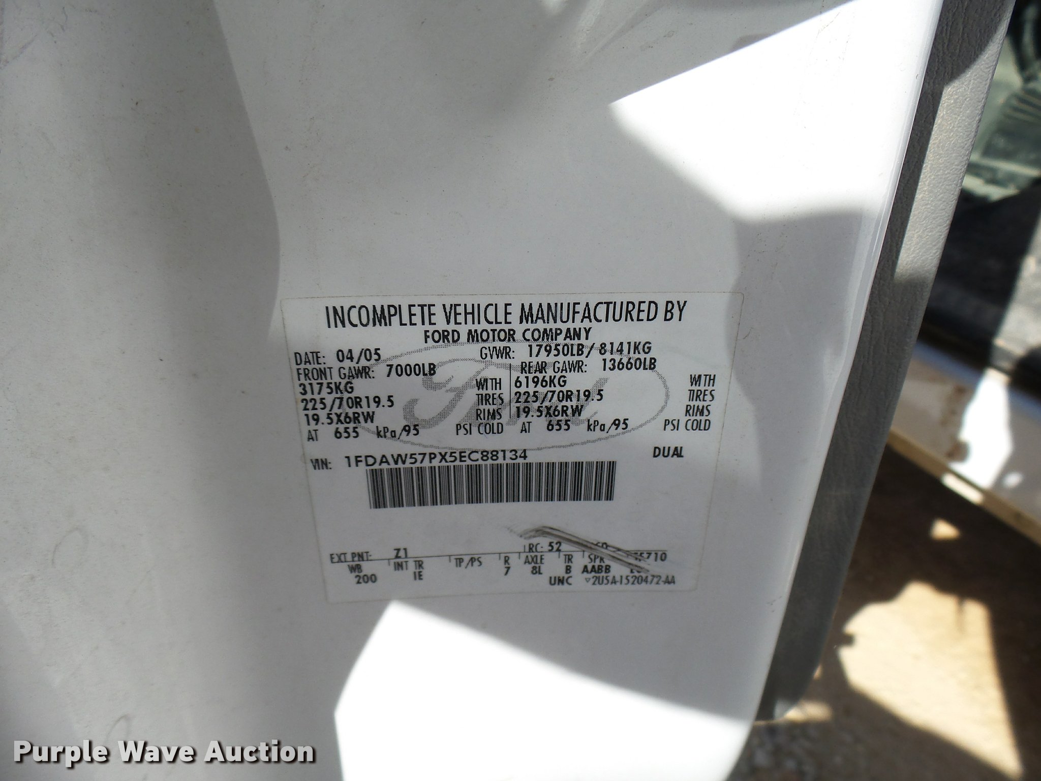 Purple Wave is selling a used Truck Chassis in Texas. This item is a 2005 Ford F550 Crew Cab truck cab and chassis with the following: 93,785 miles on odometer, 6.0L V8 OHV 32V diesel engine, Automatic transmission, Four wheel drive, AC and heat, Tilt, Cruise, AM/FM, Power windows, locks, and mirrors, Trailer brake controller, Front tow hooks, Entry steps, Receiver hitch, Pintle hitch, Trailer wiring, 225/70R19.5 tires, Front seats are not bolted down, Trailer wiring cut at end, Turbo charger removed, Unit# 51800