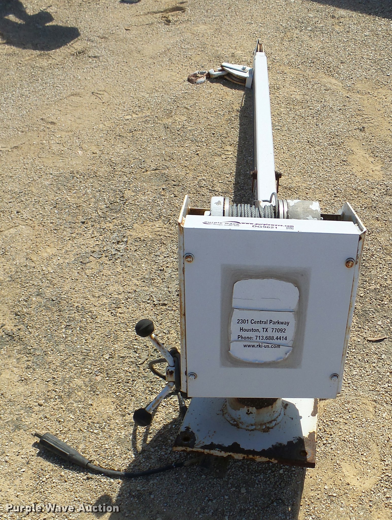 RKI truck bed crane. 80"L, Two position extendable boom, Electric winch, Unknown operating condition. Open inspection March 28. 6641 E Ben White Blvd. Austin, TX 78744