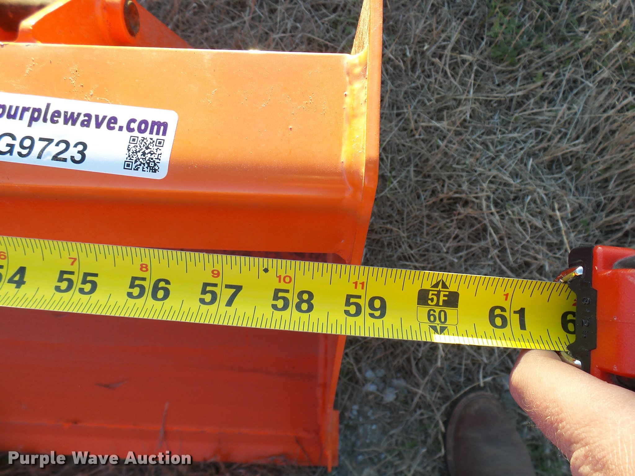 Purple Wave is selling a used Ag Tractor Loader or Attach. in Oklahoma. This item is a Kubota loader bucket with the following: 59"W x 22"H, Pin mounting brackets