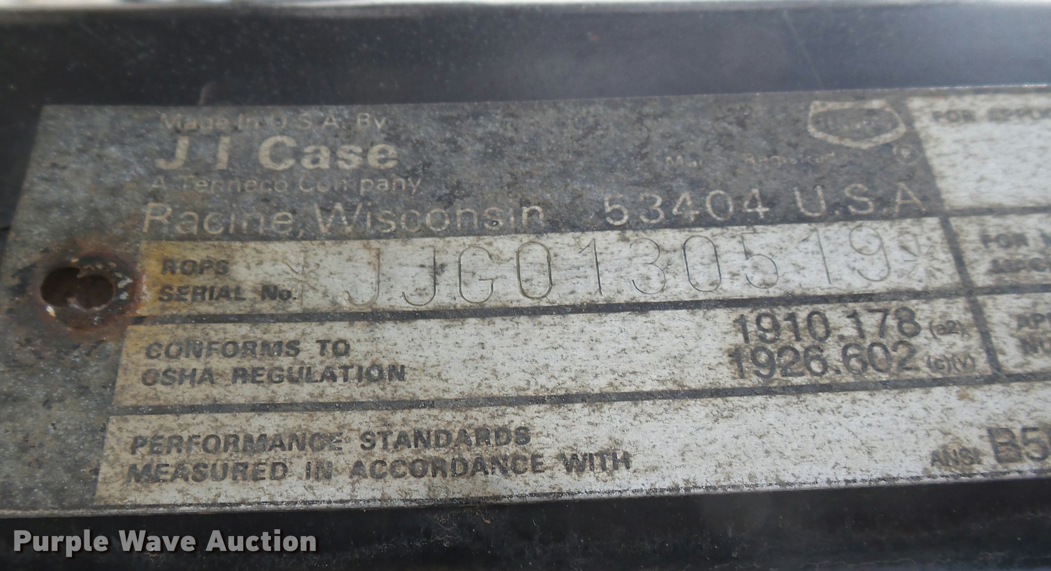 Case 586E forklift. 3,219 hours on meter, Case four cylinder diesel engine, Shuttle shift transmission 4F-4R gears, OROPS Serial LJJG0130519, 6,000 lbs maximum lift capacity, 21' maximum lift height, Three stage mast Side shift, Tilt, 60"W carriage, 48"L forks, Work lights, 19.5L-24 front tires, 11L-16 rear tires, Serial 408065008. 1313 US-56. Lyons, KS 67554