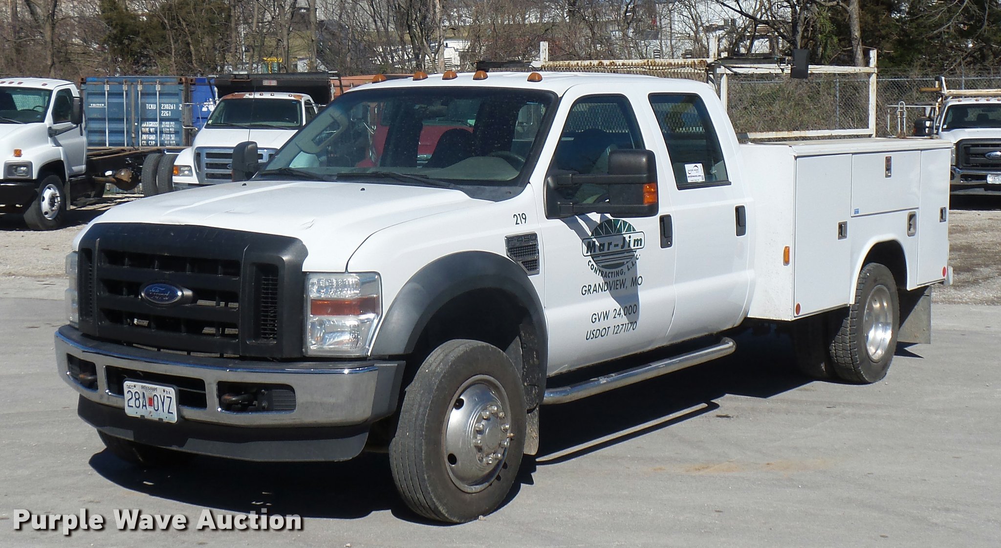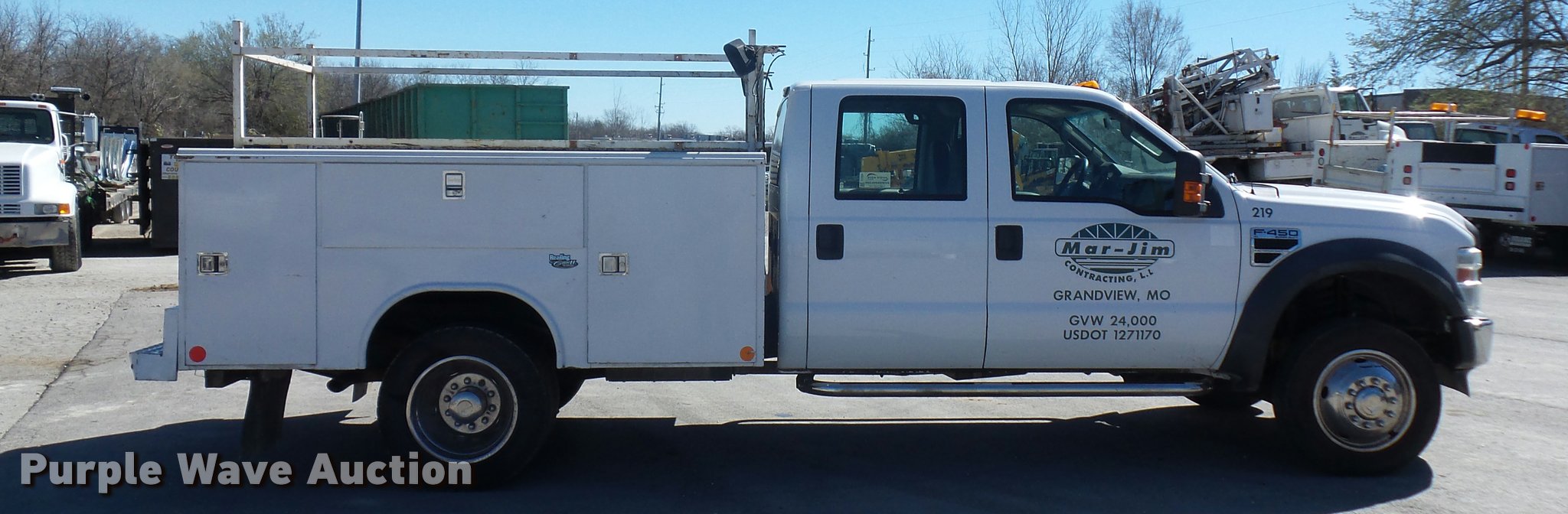 Purple Wave is selling a used Service Truck in Missouri. This item is a 2010 Ford F450 Super Duty utility truck with the following: 249,689 miles on odometer, 6.8L V10 SOHC 30V gas engine, Automatic transmission, AC and heat, Tilt, Cruise, AM/FM/CD, Power windows, locks, and mirrors, Vinyl interior, Reading utility bed, Receiver hitch, Trailer wiring, 255/70R19.5 tires, Unit# 219