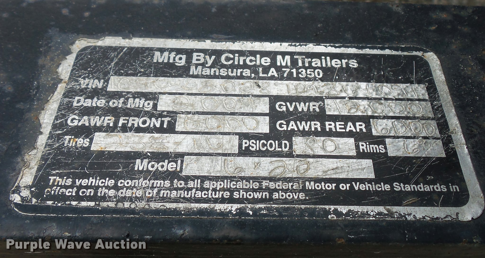Purple Wave is selling a used Equip. Trailer in Missouri. This item is a 2007 Circle M equipment trailer with the following: 20'L x 84"W deck, Pintle hitch, Manual jack, Spring suspension, Electric brakes, Tandem axle, 235/80R16 tires, GVWR 12,000 lbs, GAWR 6,000 lbs