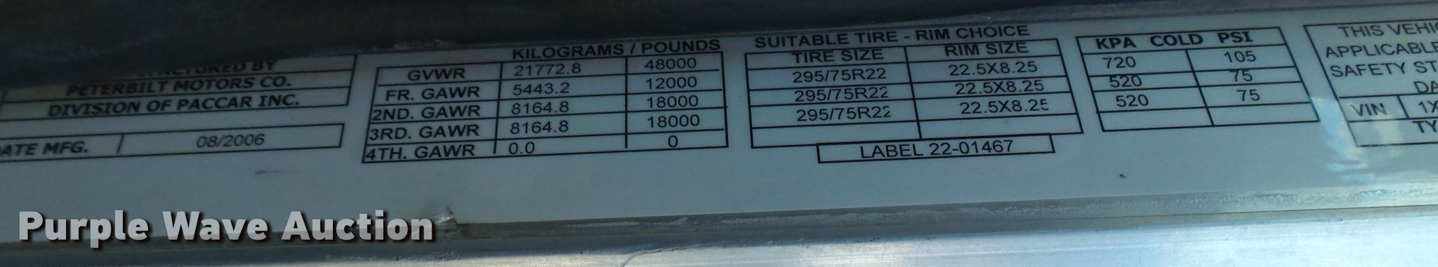 Purple Wave is selling a used Truck Tractor in Kansas. This item is a 2007 Peterbilt 379 semi truck with the following: 812,495 miles on odometer, 22,943 hours on meter, Cummins ISX 14.9L L6 diesel engine, Eaton Fuller 10 speed manual transmission, Tandem axle, Inter-axle differential lock, AC and heat, Cruise, AM/FM/CD, Power windows and locks, Power and heated mirrors, Air suspension seat, Spotlight, Exterior visor, PTO, Wet kit, Aluminum headache rack, Aluminum deck plate, Air operated sliding fifth wheel plate, Dual exhaust stacks, Dual fuel tanks, Full fenders, Air suspension, Air brakes, Engine brake, 11R24.5 tires, GVWR 48,000 lbs, FAWR 12,000 lbs, IAWR 18,000 lbs, RAWR 18,000 lbs, Unit# 09-519