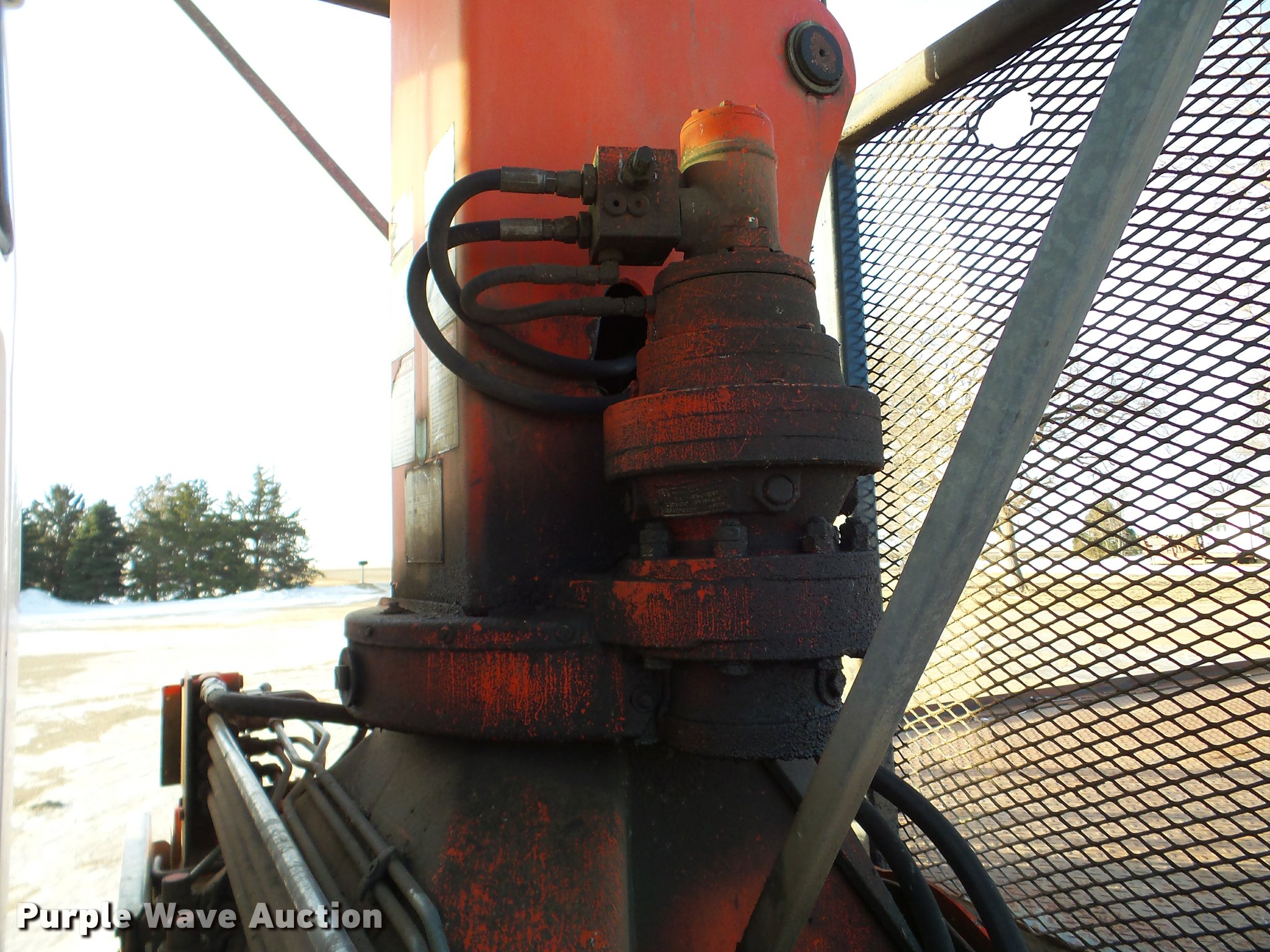 1997 Ford LT9513 Louisville 113 crane truck. 226,060 miles on odometer, 4,992 hours on meter, Cummins ISM 10.8L L6 turbo diesel engine, Eight speed manual transmission, Locking differential, Triple axle, Heat, AM/FM/CD, Air suspension seat, PTO, Backup alarm, 25'L x 8'7"W flatbed Pintle hitch, 1997 Palfinger PW350 crane 50' boom length, 63' maximum lift height, Ground boom controls, Boom rotation, Knuckle boom, (2) outriggers, Serial 9776112, Forks Model PZP-W, Dual fuel tanks, 274" wheelbase, Spring over walking beam suspension, Air brakes, 425/65R22.5 front tires, 235/75R17.5 tag axle tires, 11R22.5 rear tires, GVWR 58,000 lbs. South Dakota title. 1FDZS96P2VVA39673. Anything Concrete. 40182 US-212. Doland, SD 57436