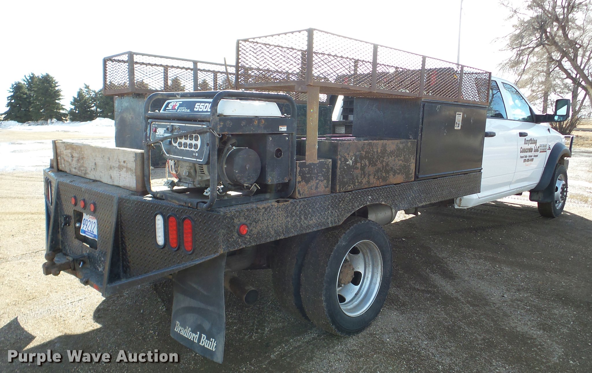 Purple Wave is selling a used Flat Bed Truck in South Dakota. This item is a 2014 Dodge Ram 5500HD flatbed truck with the following: 78,907 miles on odometer, 6.7L L6 OHV 24V turbo diesel engine, Automatic transmission, Four wheel drive, Single axle, AC and heat, AM/FM, Power windows, locks, and mirrors, 11'L x 8'W flatbed, Toolboxes, Honda North Star 5500 generator, Gas engine, (8) 120V outlets, 240V outlet, Ranch Hand front bumper, Gooseneck hitch, Receiver hitch, Spring suspension, 225/70R19.5 tires, GVWR 19,500 lbs