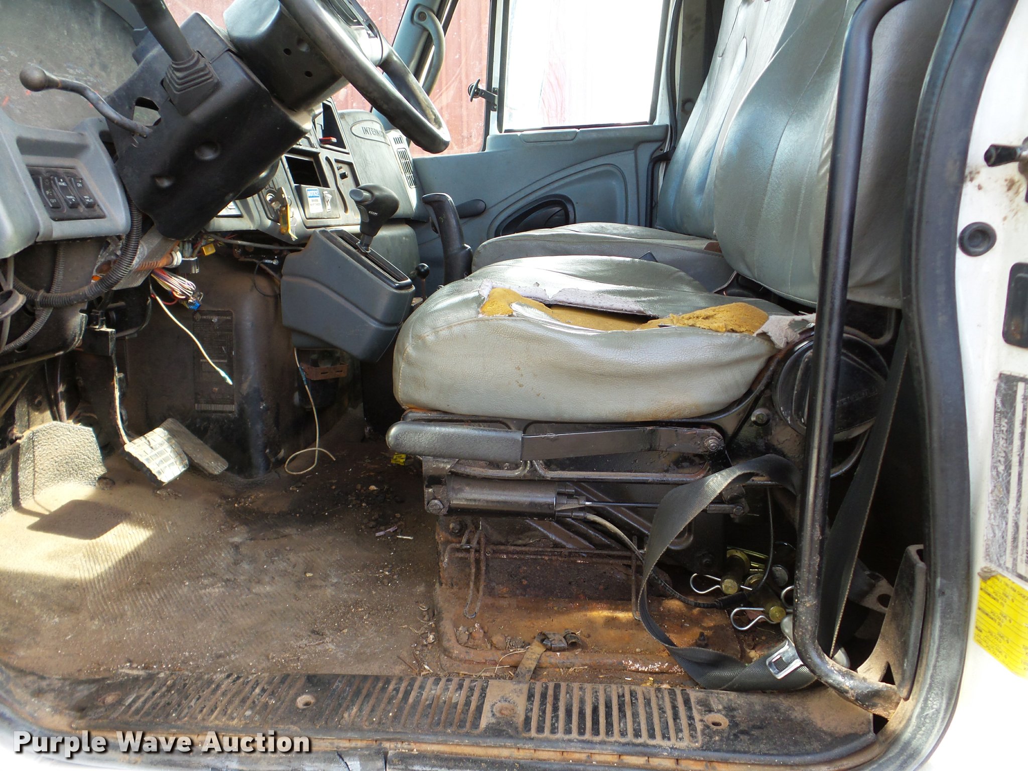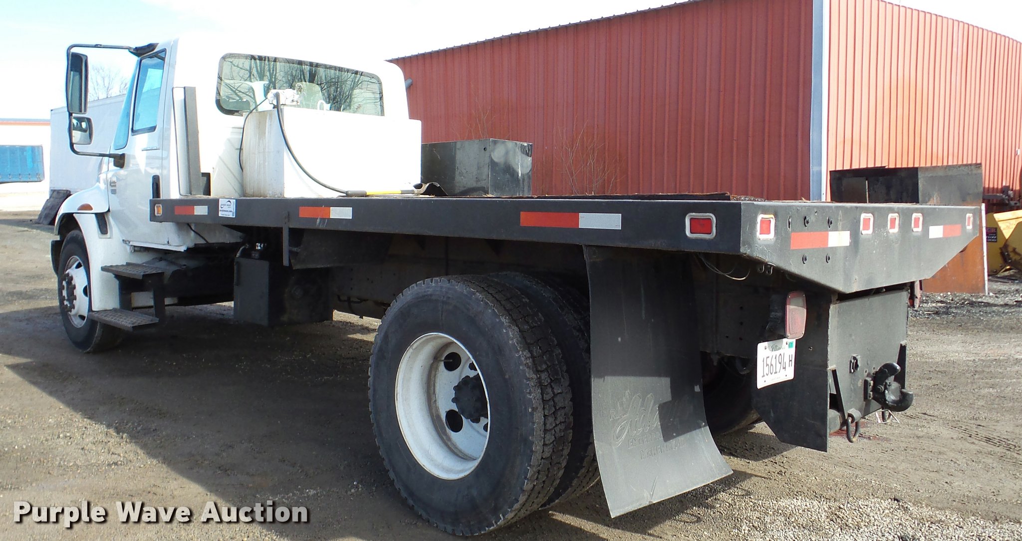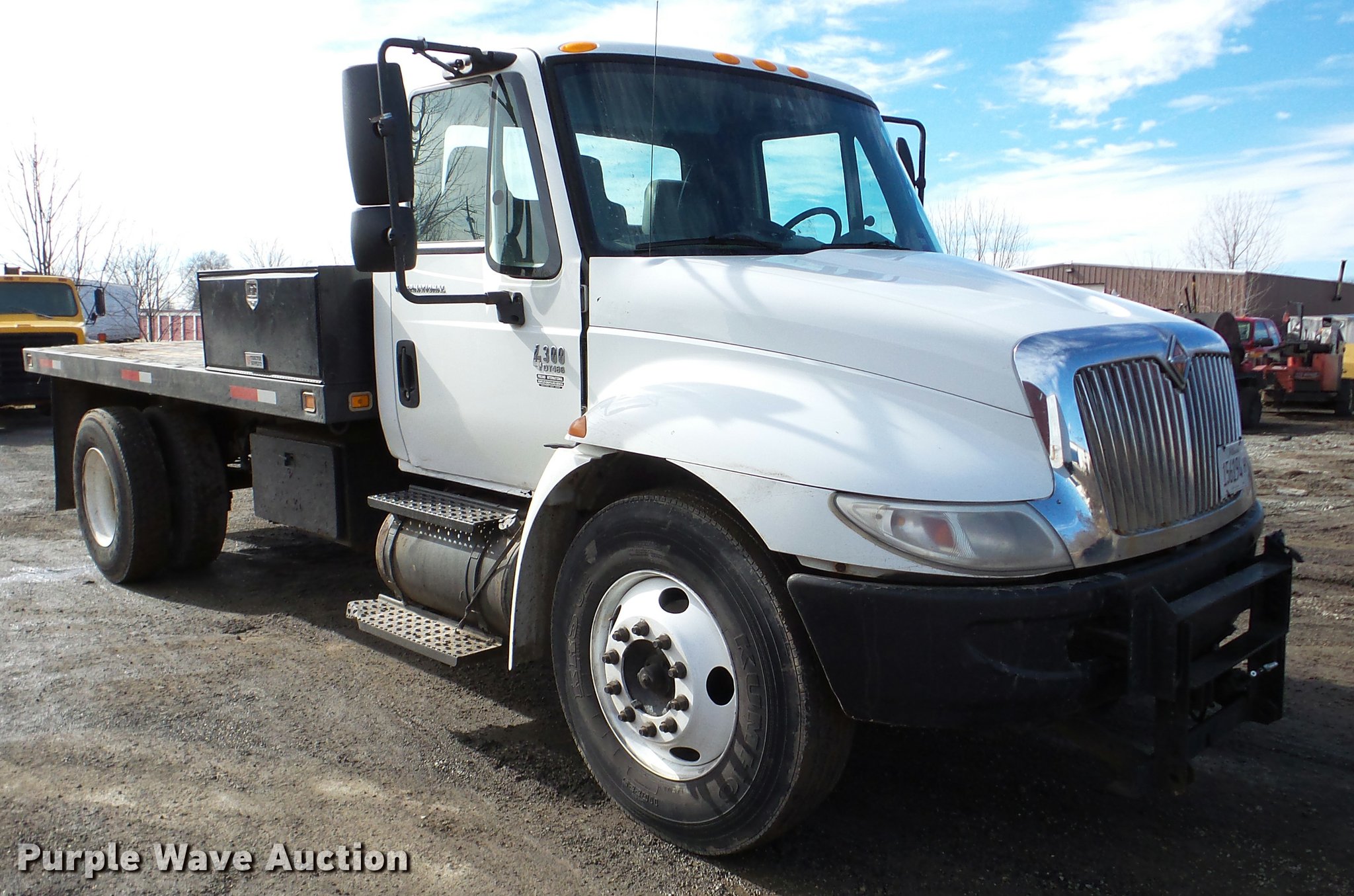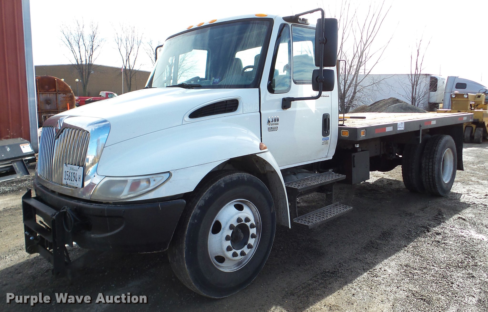Purple Wave is selling a used Flat Bed Truck in Illinois. This item is a 2002 International 4300 flatbed truck with the following: 114,864 miles on odometer, International DT466 7.6L L6 diesel engine, Automatic transmission, Single axle, AC and heat, AM/FM, Air suspension seat, 14'L x 8'W flatbed, Wood deck, 10'W snow plow, In-cab plow and spreader controls, Single fuel tank, Pintle hitch, Spring suspension, Hydraulic brakes, 11R22.5 tires, Unknown operating condition of AC, Front hydraulics for snow plow are weak, Toolbox and fuel tank are not included
