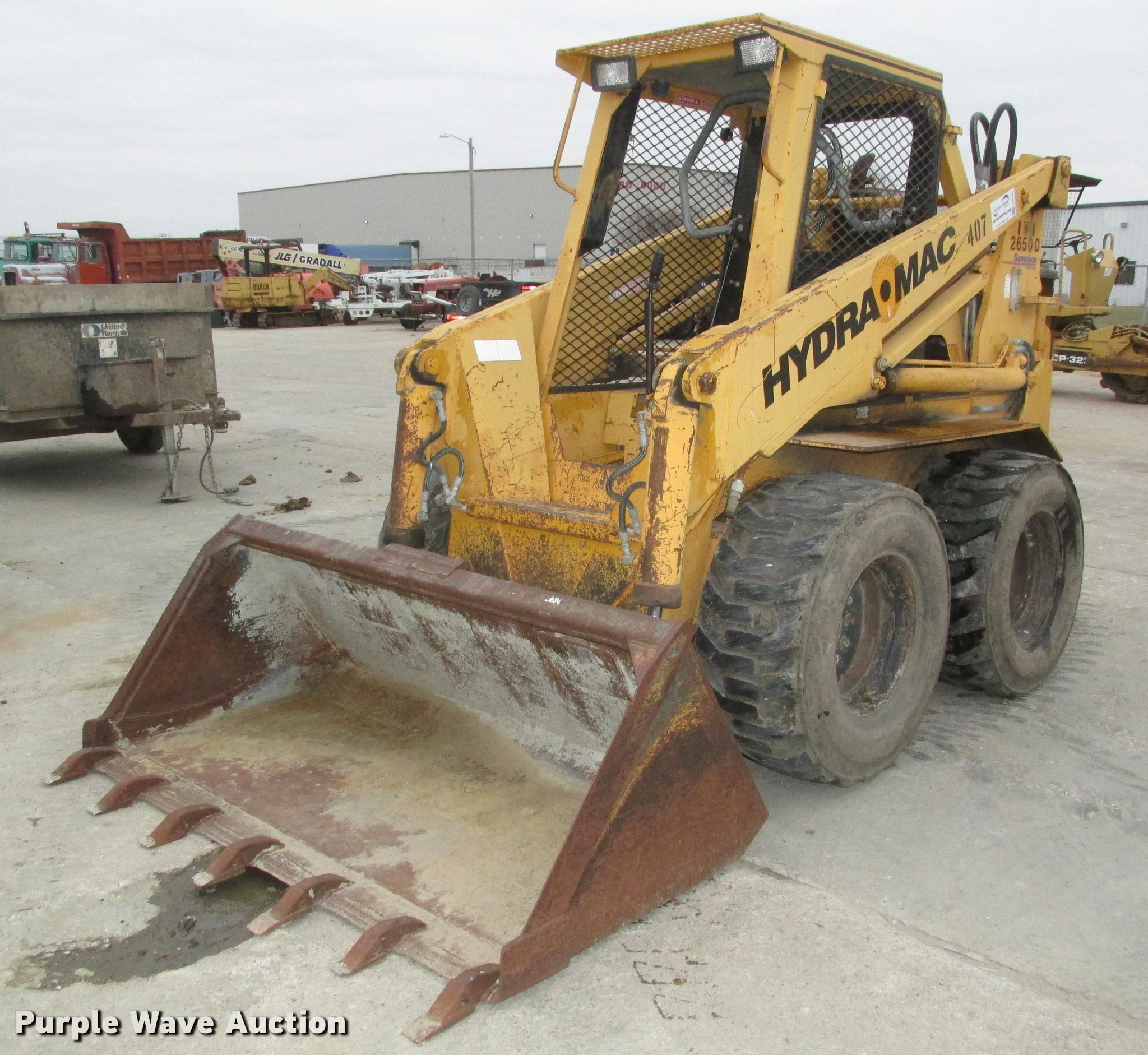 Purple Wave is selling a used Skid Steer Loader in Nebraska. This item is a Hydramac 2650D skid steer with the following: 3,009 hours on meter, Four cylinder diesel engine, Hydrostatic transmission, Open cab, Hand/foot controls, Front work lights, 71"W bucket, 14-17.5 tires, Right side wheel bearing issues, Serial 26565044