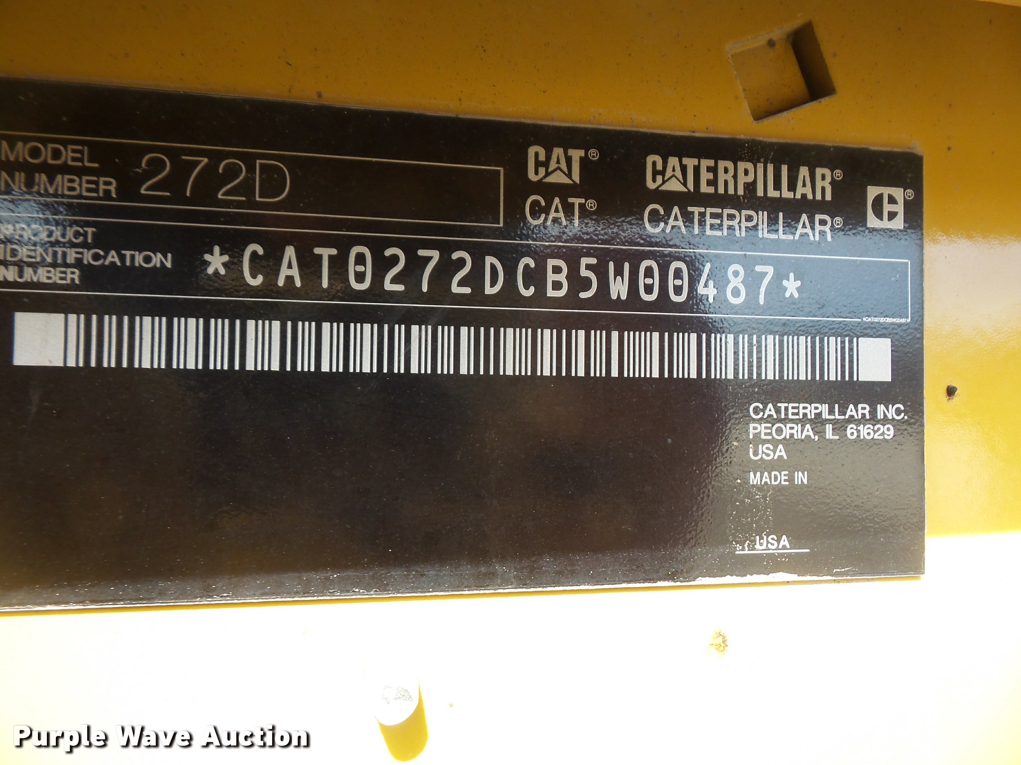 Purple Wave is selling a used Skid Steer Loader in Missouri. This item is a 2014 Caterpillar 272D skid steer with the following: 2,955 hours on meter, Caterpillar C3.8 3.8L four cylinder turbo diesel engine, 95 HP, Two speed hydrostatic transmission, Open station/canopy, Joystick controls, Pattern changer, Currently Case control pattern, can be modified to Caterpillar control pattern, Spring suspension seat, Front and rear work lights, Hydraulic quick coupler, High flow auxiliary hydraulics, Counterweights, 12-16.5 tires, Serial CAT0272DCB5W00487, Unit# PUC0302