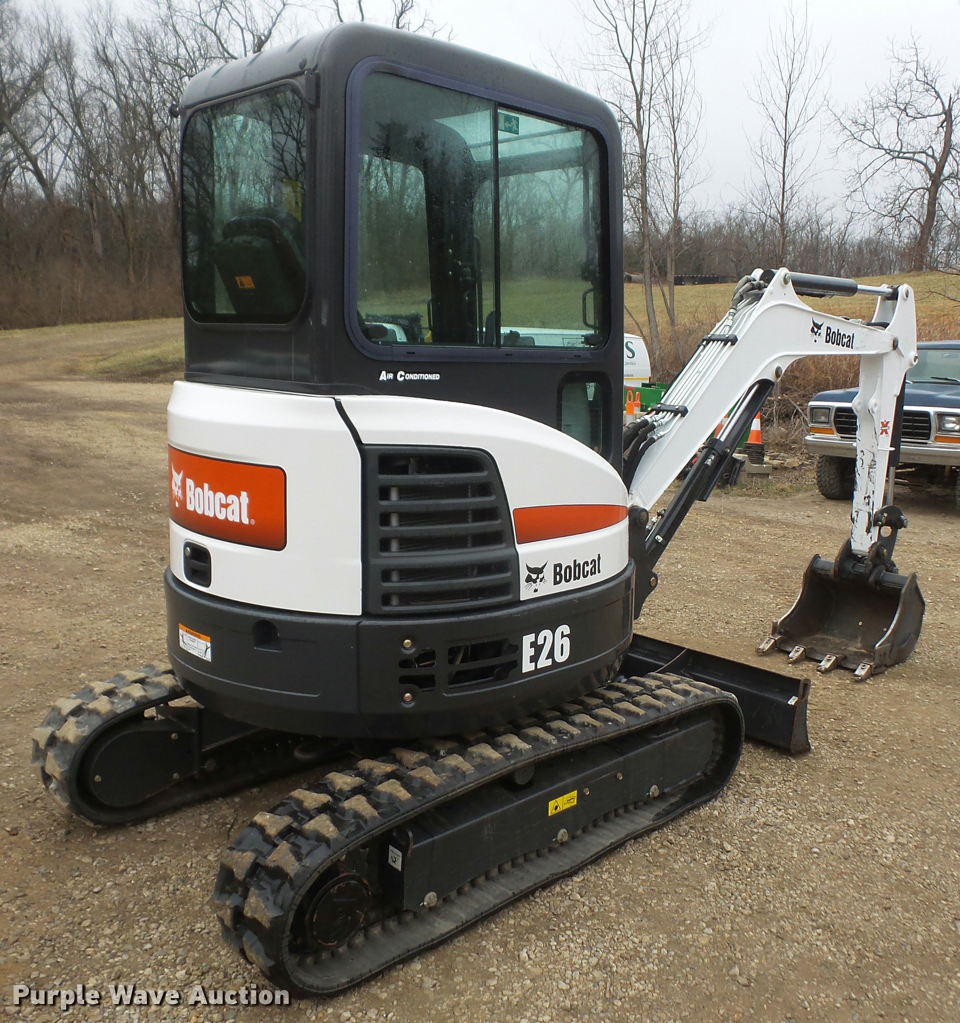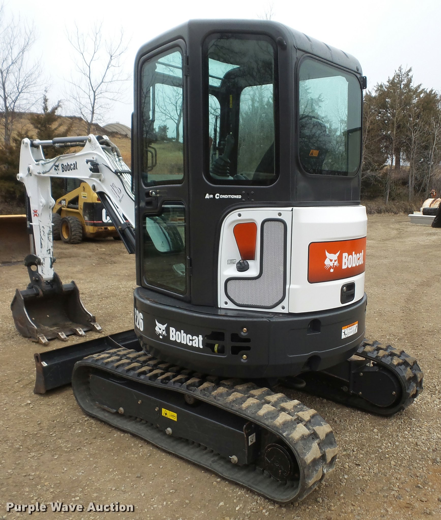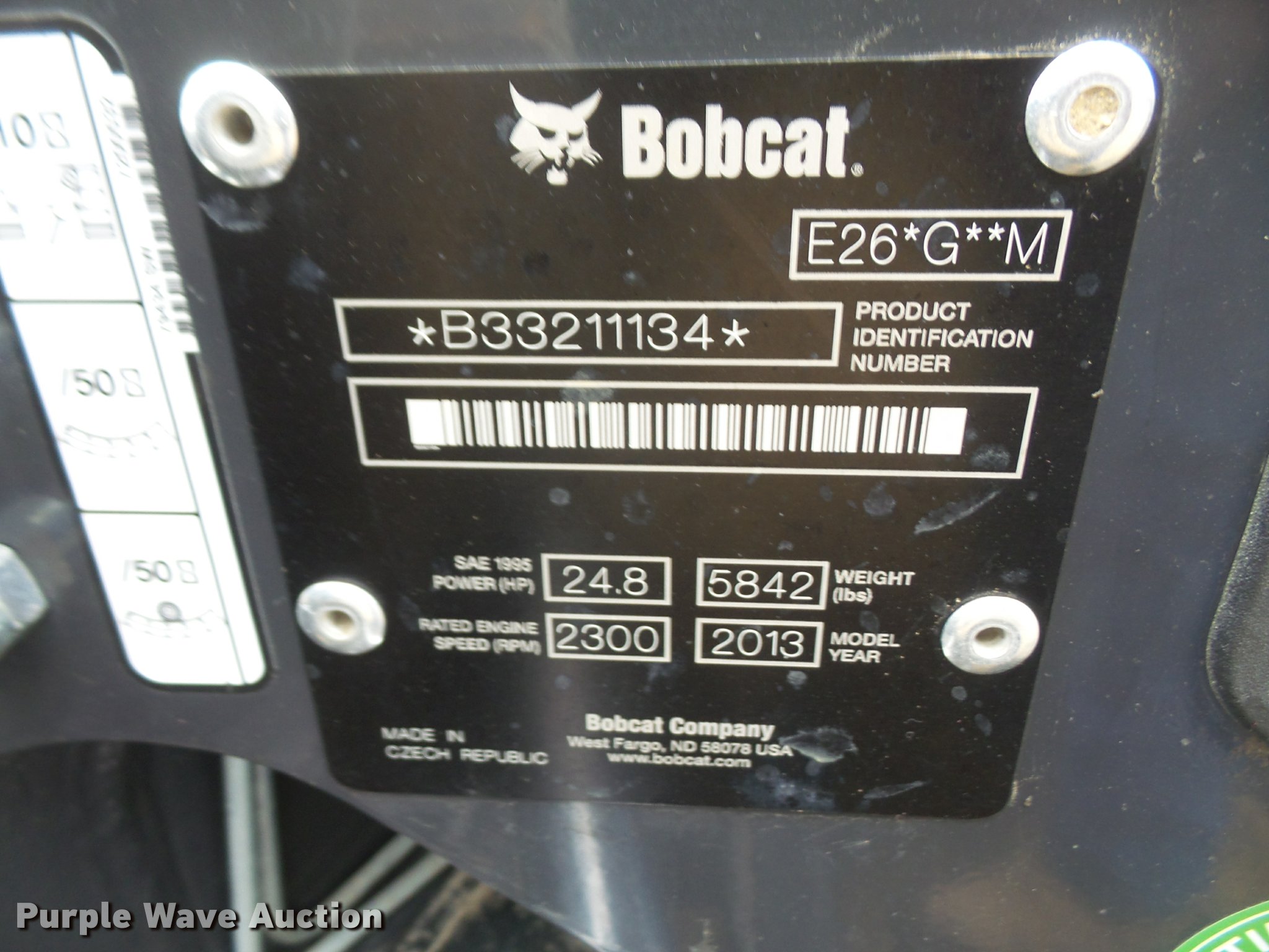 Purple Wave is selling a used Mini Excavator in Kansas. This item is a 2013 Bobcat E26 compact excavator with the following: 132 hours on meter, Kubota V1505-EF01 1.5L four cylinder diesel engine, 24.8 HP, Serial 1DE4429, Hydrostatic transmission, Enclosed cab, AC and heat, Suspension seat, Pattern changer, 60"W back fill blade, Standard boom, 43" stick length, Two way auxiliary hydraulics, Mechanical quick coupler, Bobcat 24"W bucket, (4) weld-on teeth, 12"W rubber tracks, Serial B33211134
