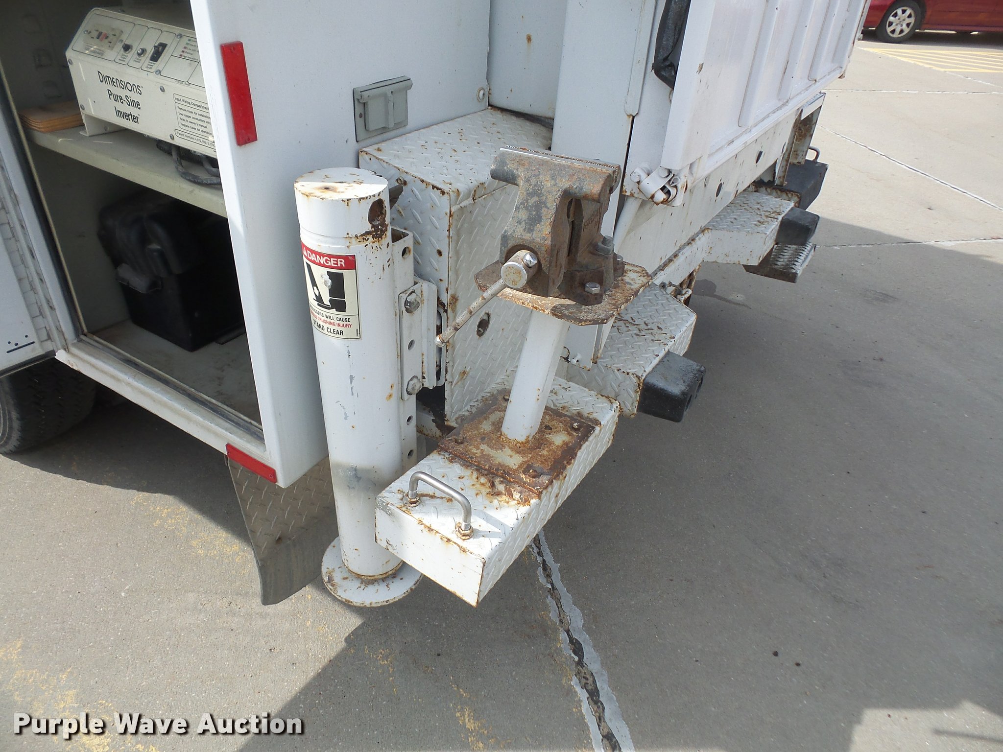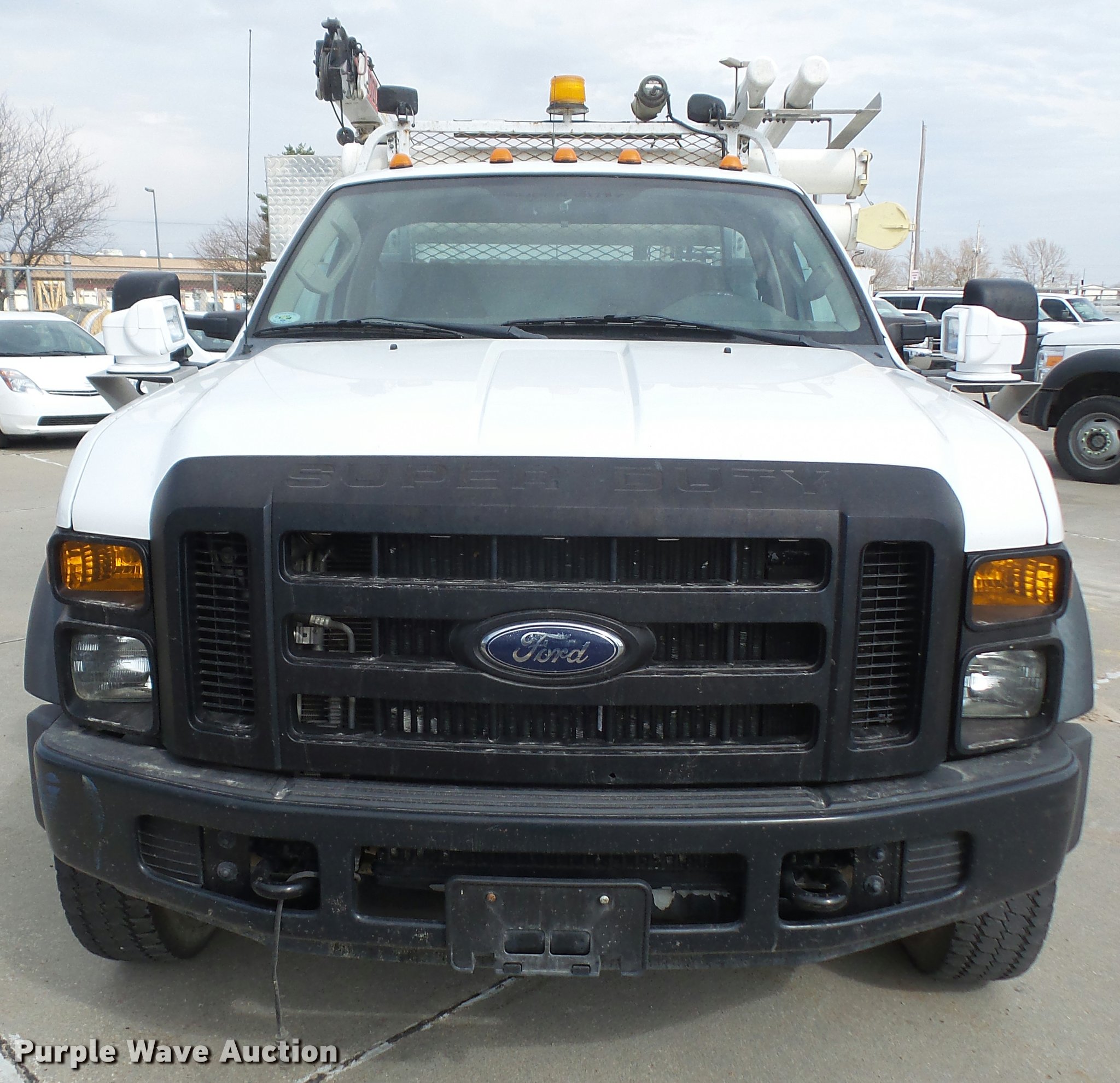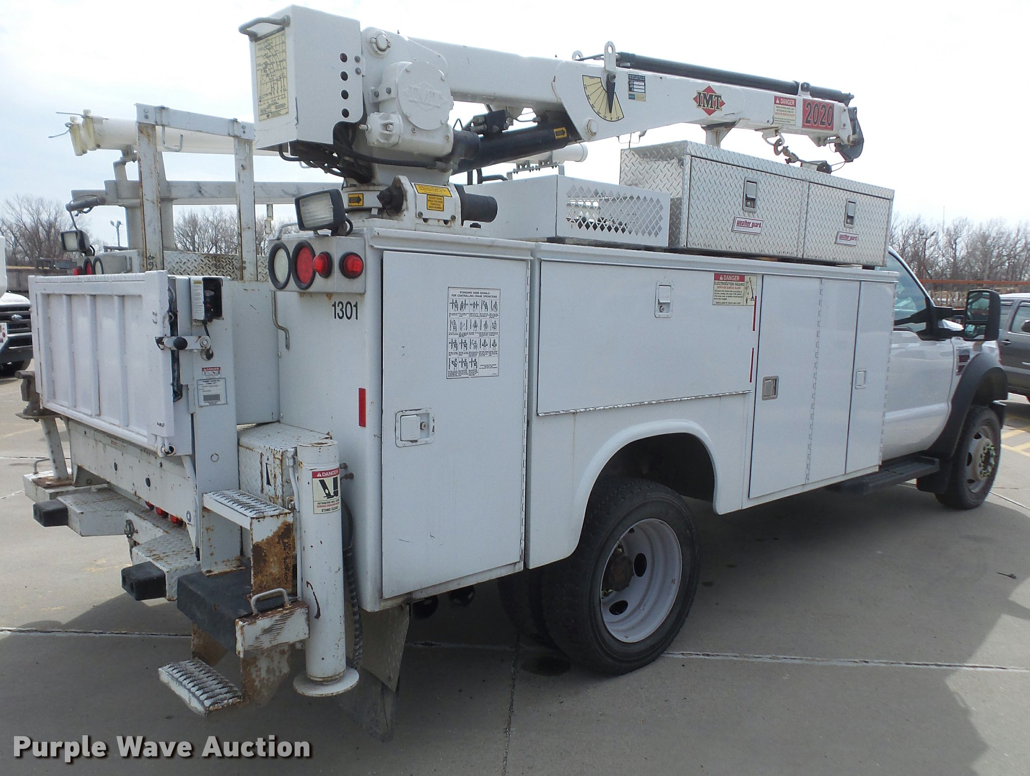 Purple Wave is selling a used Service Truck in Kansas. This item is a 2008 Ford F550 Super Duty service truck with crane with the following: 117,597 miles on odometer, 6.4L V8 OHV 32V turbo diesel engine, Automatic transmission, Single axle, AC and heat, AM/FM/CD, Auxiliary controls, Brake controller, PTO, Knapheide utility bed, 11'L, Shelving, Slide-out drawers, Utility rack, Toolboxes, Dual remote control spotlights, Work lights, Mounted vise, Tommy Gate end gate lift, 1,300 lbs maximum lift capacity, Receiver hitch, IMT 2020 crane, 5,000 lbs maximum lift capacity, 20' boom length, Remote control, (2) outriggers, Front tow hooks, Beacon light, Single fuel tank, Spring suspension, Hydraulic brakes, 225/70 R19.5 tires, GVWR 19,000 lbs, Unit# 1301