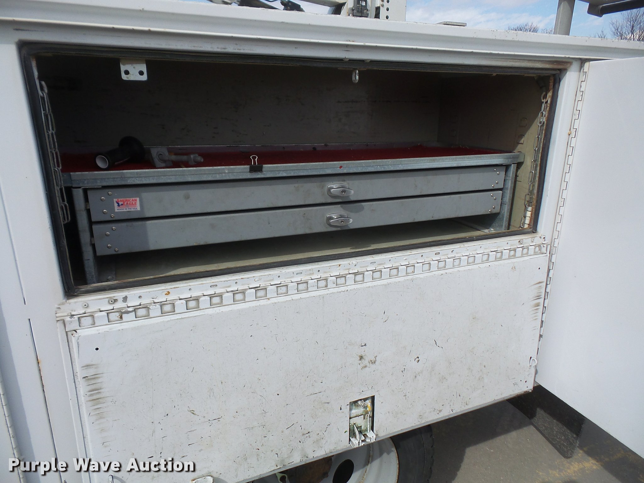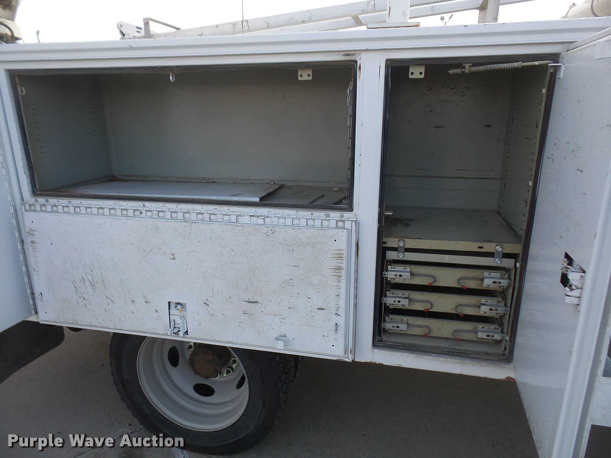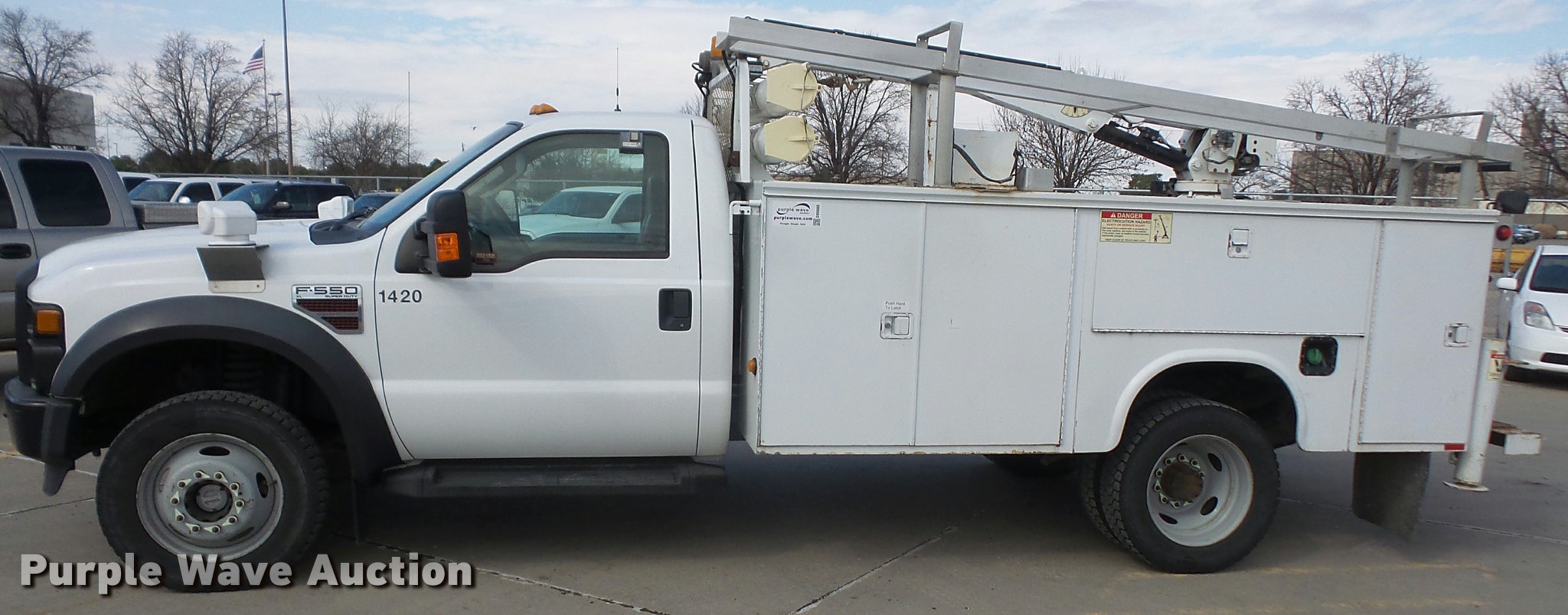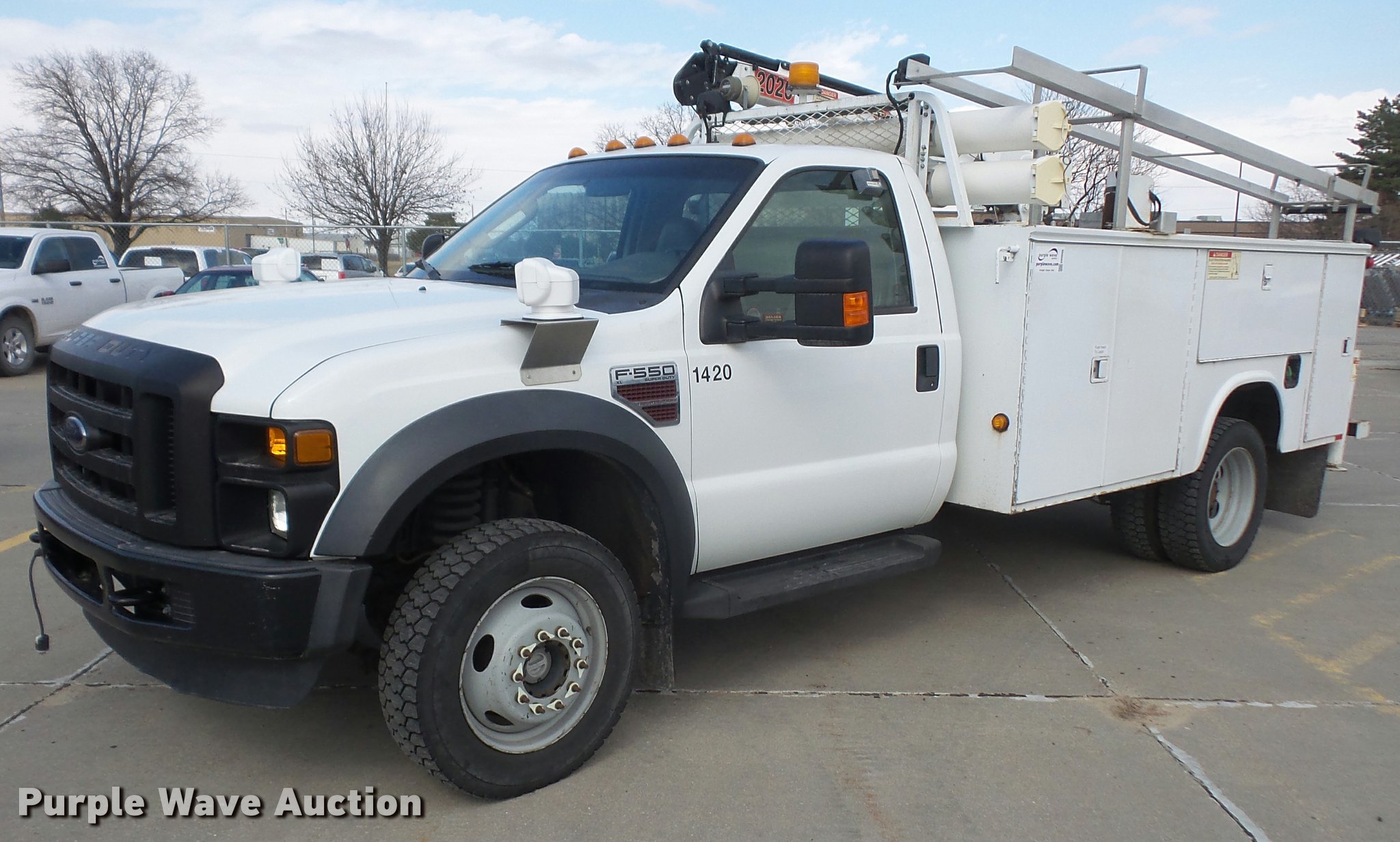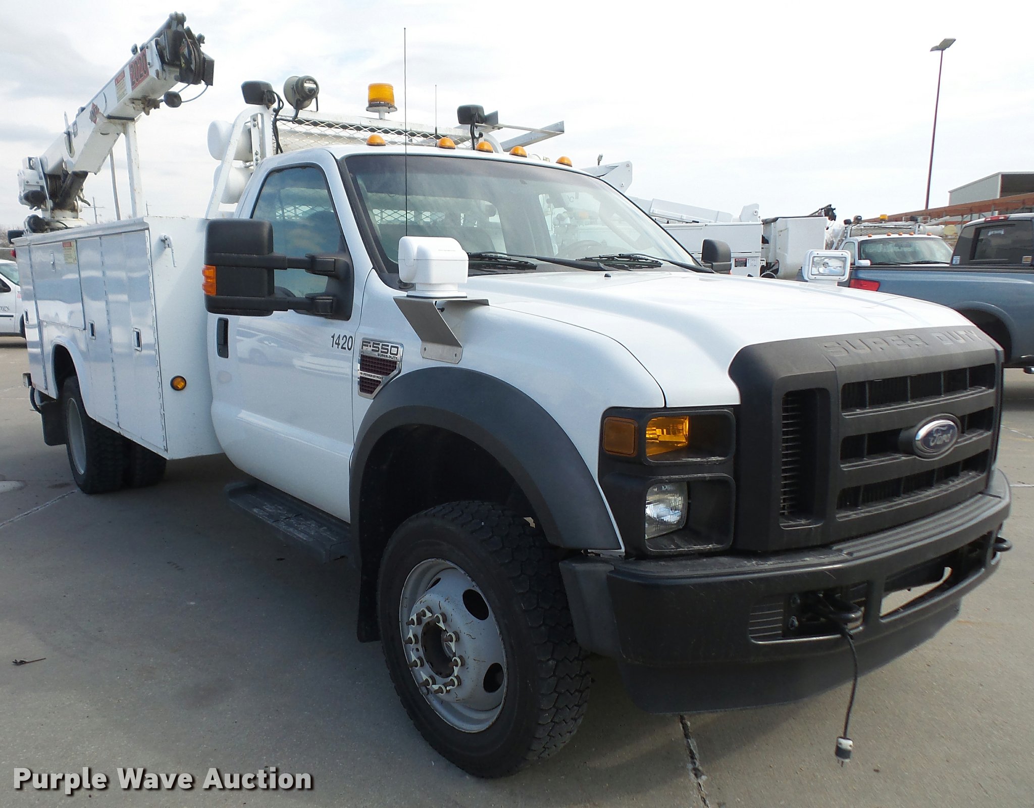 Purple Wave is selling a used Service Truck in Kansas. This item is a 2008 Ford F550 Super Duty service truck with crane with the following: 95,184 miles on odometer, 6.4L V8 OHV 32V turbo diesel engine, Automatic transmission, Four wheel drive, AC and heat, AM/FM/CD, Power windows, locks, and mirrors, Auxiliary controls, Brake controller, PTO, Knapheide utility bed, 11'L, Shelving, Slide-out drawers, Utility rack, Dual remote control spotlights, Tommy Gate end gate lift, 1,300 lbs maximum lift capacity, Receiver hitch, IMT 2020 crane, 5,000 lbs maximum lift capacity, 20' boom length, Remote control, (2) outriggers, Beacon light, Single fuel tank, Spring suspension, Hydraulic brakes, 225/70R19.5 tires, GVWR 19,500 lbs, Unit# 1420
