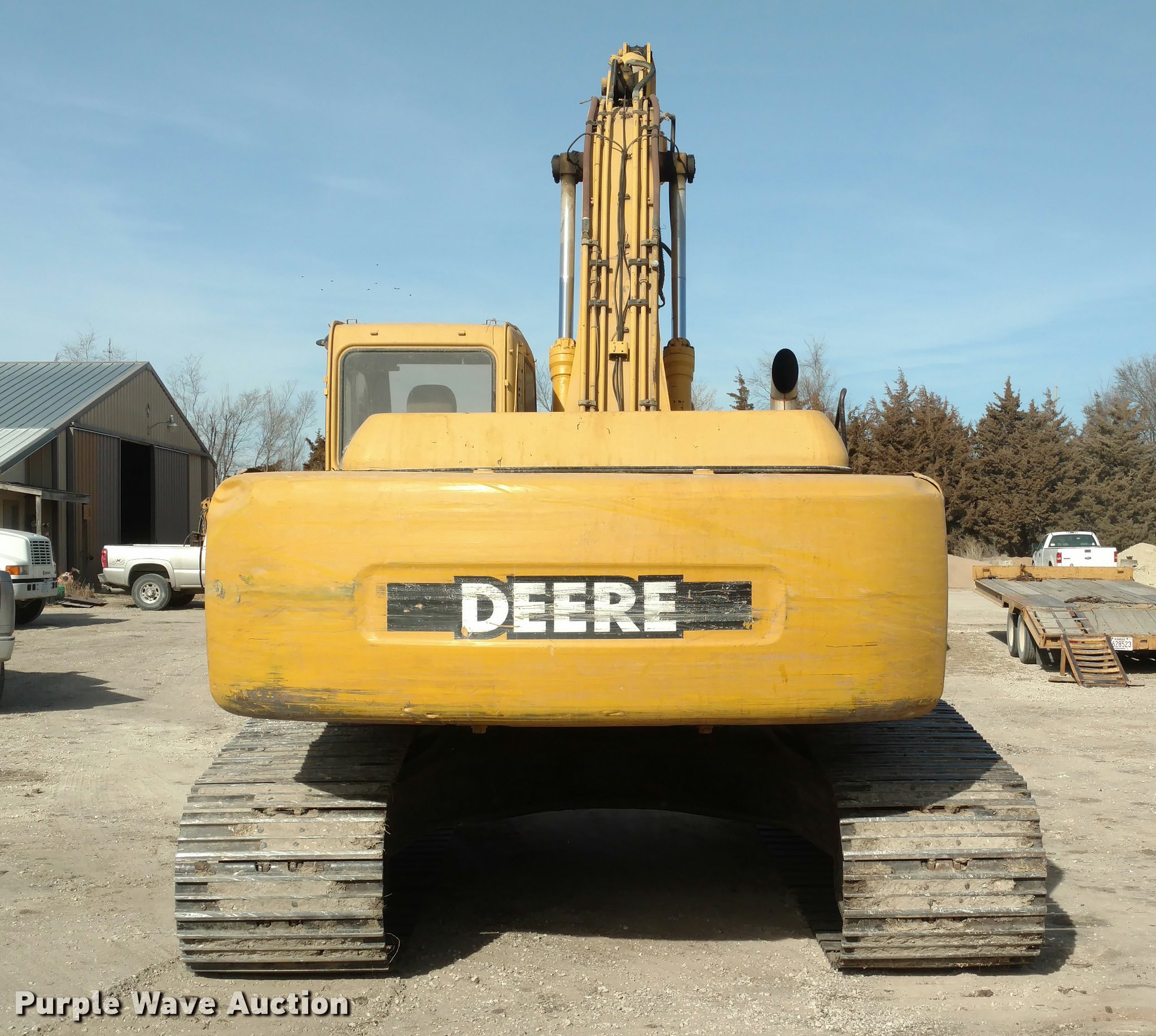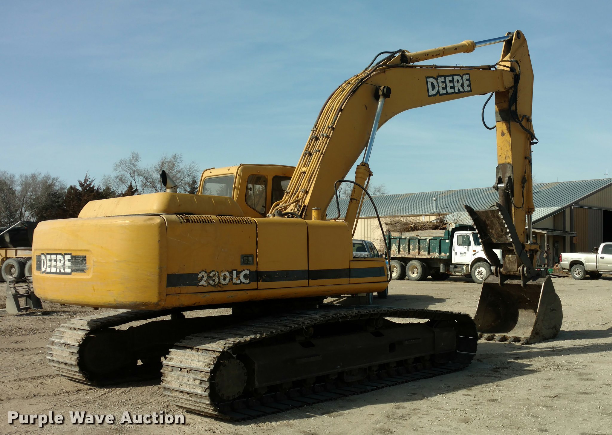 1999 John Deere 230LC excavator. 7,959 hours on meter, Six cylinder turbo diesel engine, Hydrostatic transmission, EROPS, AC and heat, AM/FM, Suspension seat, Front and rear work lights, Standard boom, Hydraulic thumb Foot controls, Two way auxiliary hydraulics, 31.5"W steel triple grouser track pads, Left joystick has a hydraulic leak, Serial FF0230X600384. Dalke Construction Inc.. Hillsboro, KS 67063