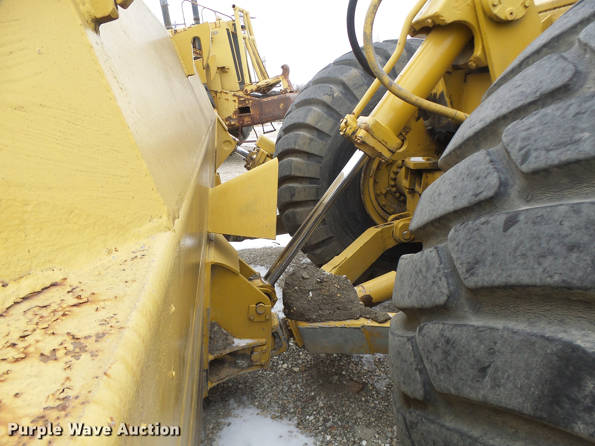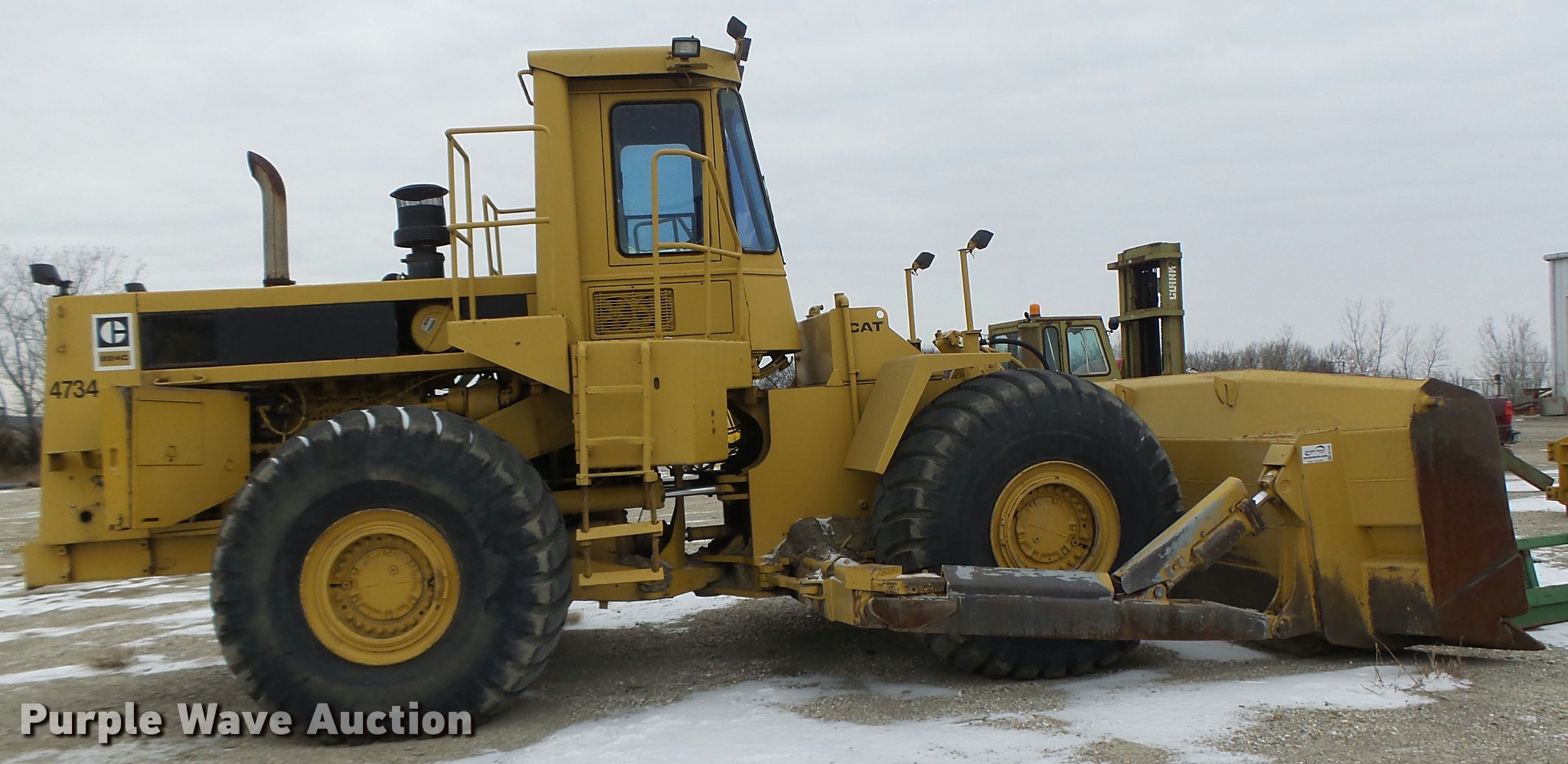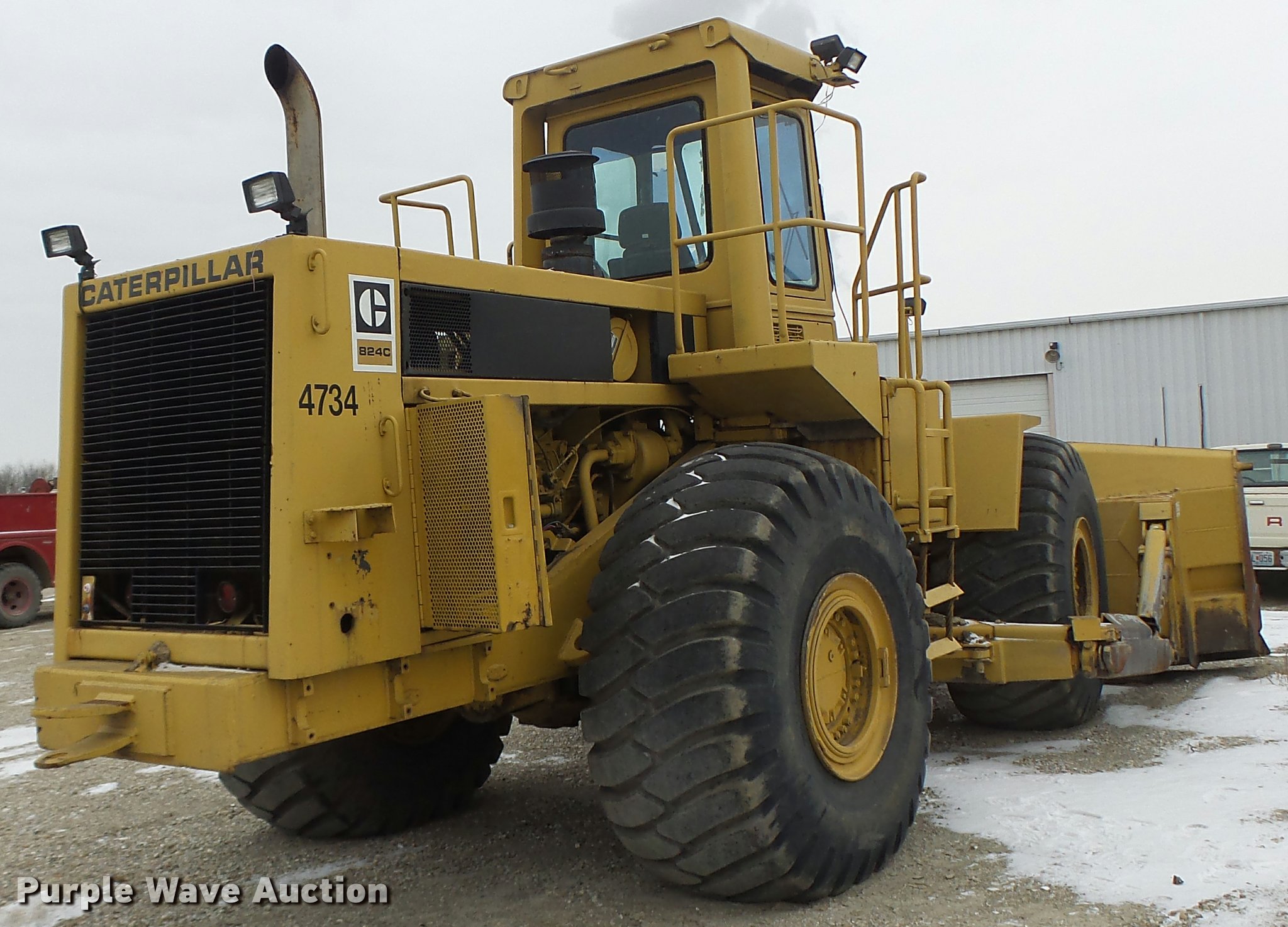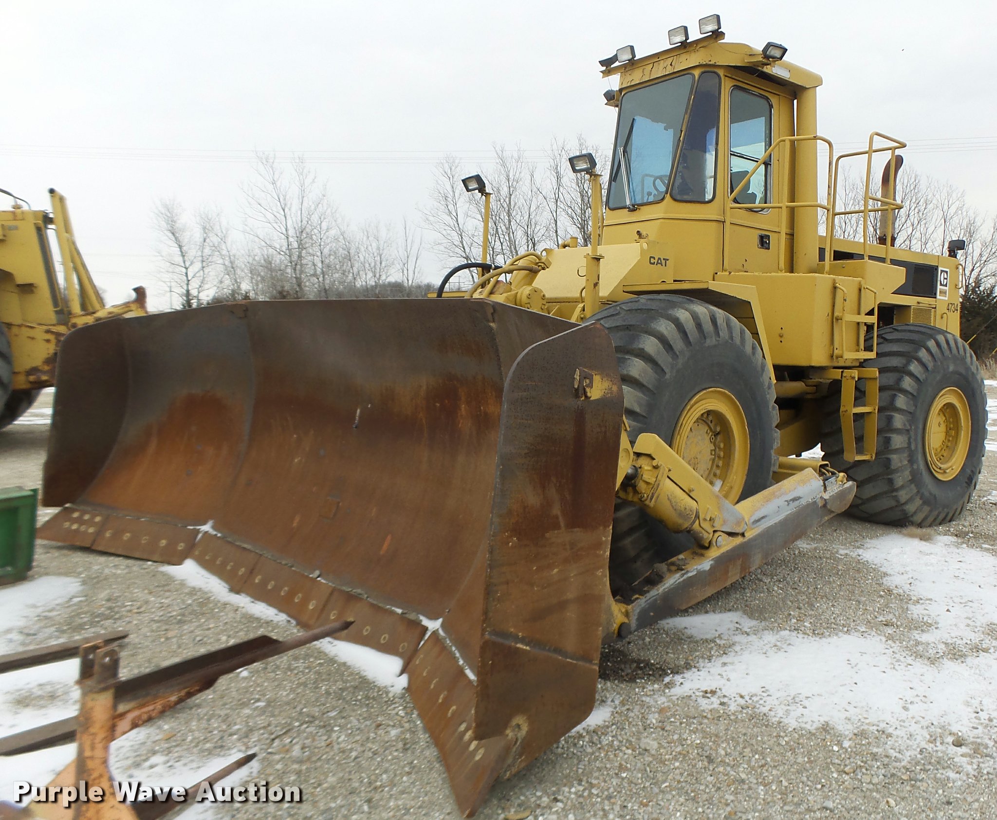 Purple Wave is selling a used Wheel Dozer in Missouri. This item is a 1980 Caterpillar 824C wheel dozer with the following: 16,286 hours on meter, Caterpillar 3406 six cylinder diesel engine, Powershift transmission, 4F-4R gears, Enclosed cab, Suspension seat, Joystick bucket controls, Wipers, Front and rear work lights, 15'W blade, Bolt-on cutting edge, 29.5-25 tires, Serial 85X00518