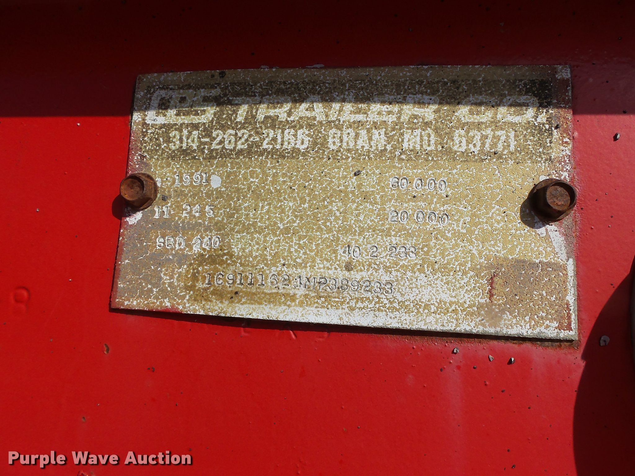 1991 CPS bottom dump trailer. 40'L x 8'W overall, Side boards, Steel construction, Air operated clamshell gate Variable speed opening, Rear push block, Fifth wheel plate, Dual leg landing gear, Spring suspension, Air brakes, Tandem axle, Steel wheels, 11R24.5 tires, GVWR 80,000 lbs, Unit# T92. Missouri title. 1C9111624MP389233. Leo O'Laughlin Inc.. 499 N 4th St. Shelbina, MO 63468