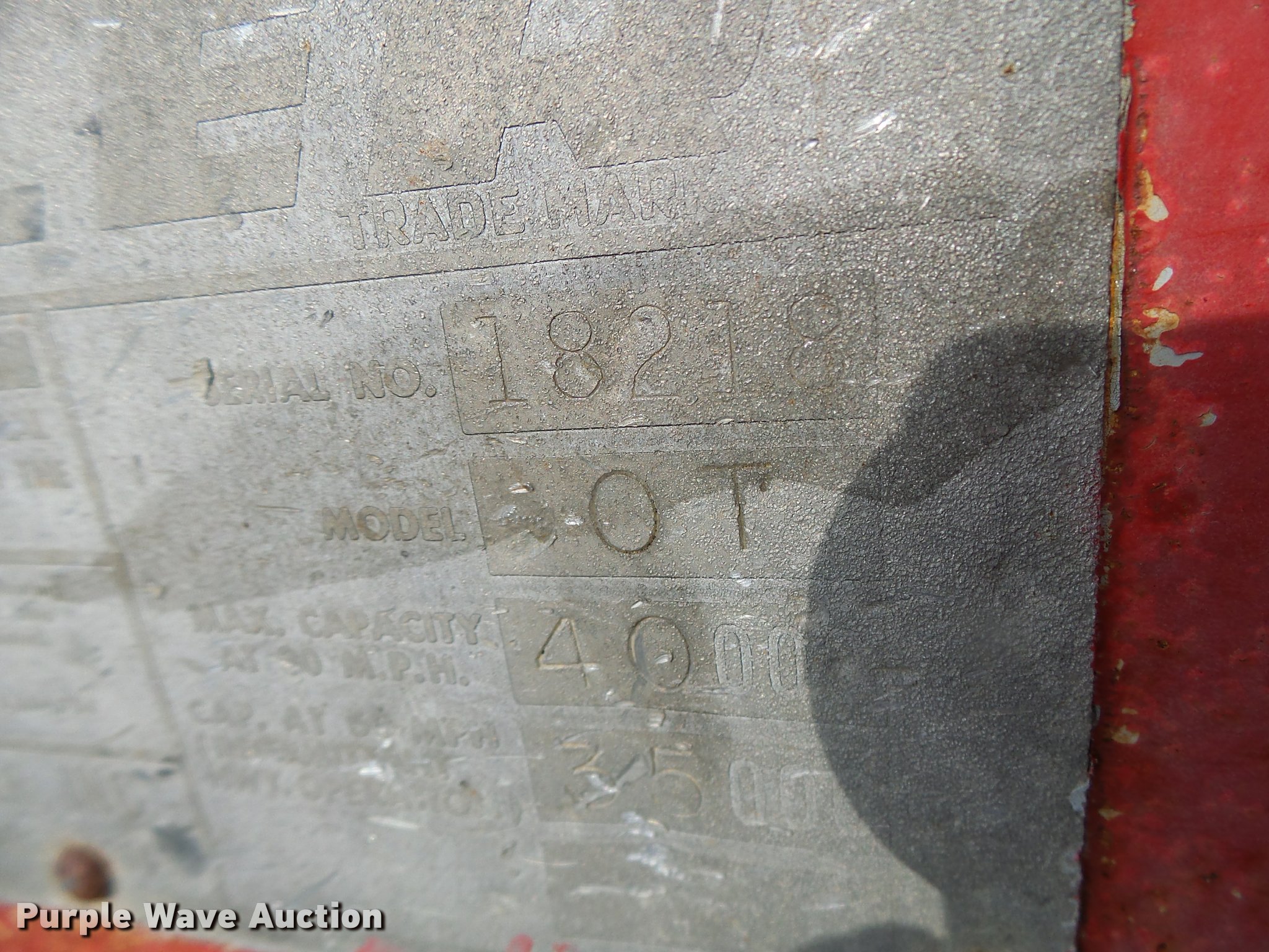 1975 Miller tilt deck equipment trailer. 22'L x 8'W overall, 18'L wood tilt deck, 4'L fixed deck, D-ring tie downs, Pintle hitch, Single leg landing gear, Spring suspension, Air brakes, Steel wheels, 10R17.5 tires, GVWR 40,000 lbs. Missouri title. 18218. Leo O'Laughlin Inc.. 499 N 4th St. Shelbina, MO 63468