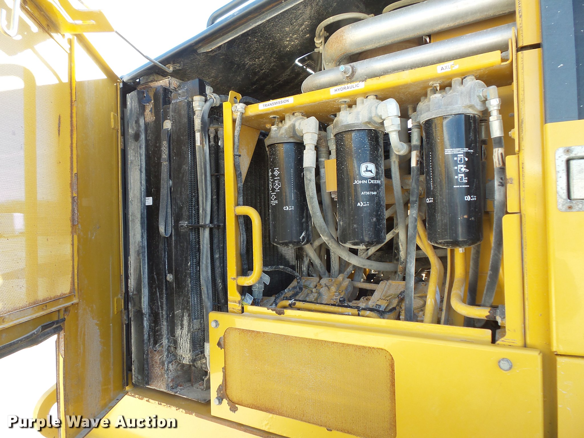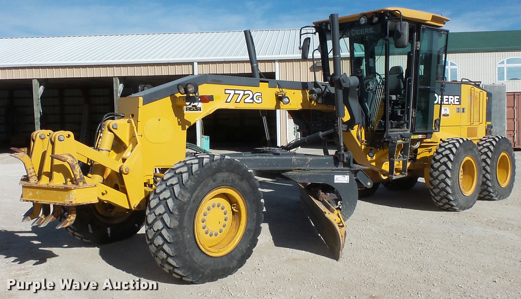 Purple Wave is selling a used Motor Grader in Missouri. This item is a 2010 John Deere 772G motor grader with the following: 8,475 hours on meter, Hours may vary, still in use, John Deere six cylinder turbo diesel engine, Serial RG6090L069761, Powershift transmission, 8F-8R gears, Six wheel drive, Enclosed cab, AC and heat, AM/FM, Front and rear work lights, Strobe beacon light, 12' moldboard, Tip control, Side shift, John Deere front mounted scarifier, (6) teeth, Michelin 17.5R25 tires, Serial DW772GX627221