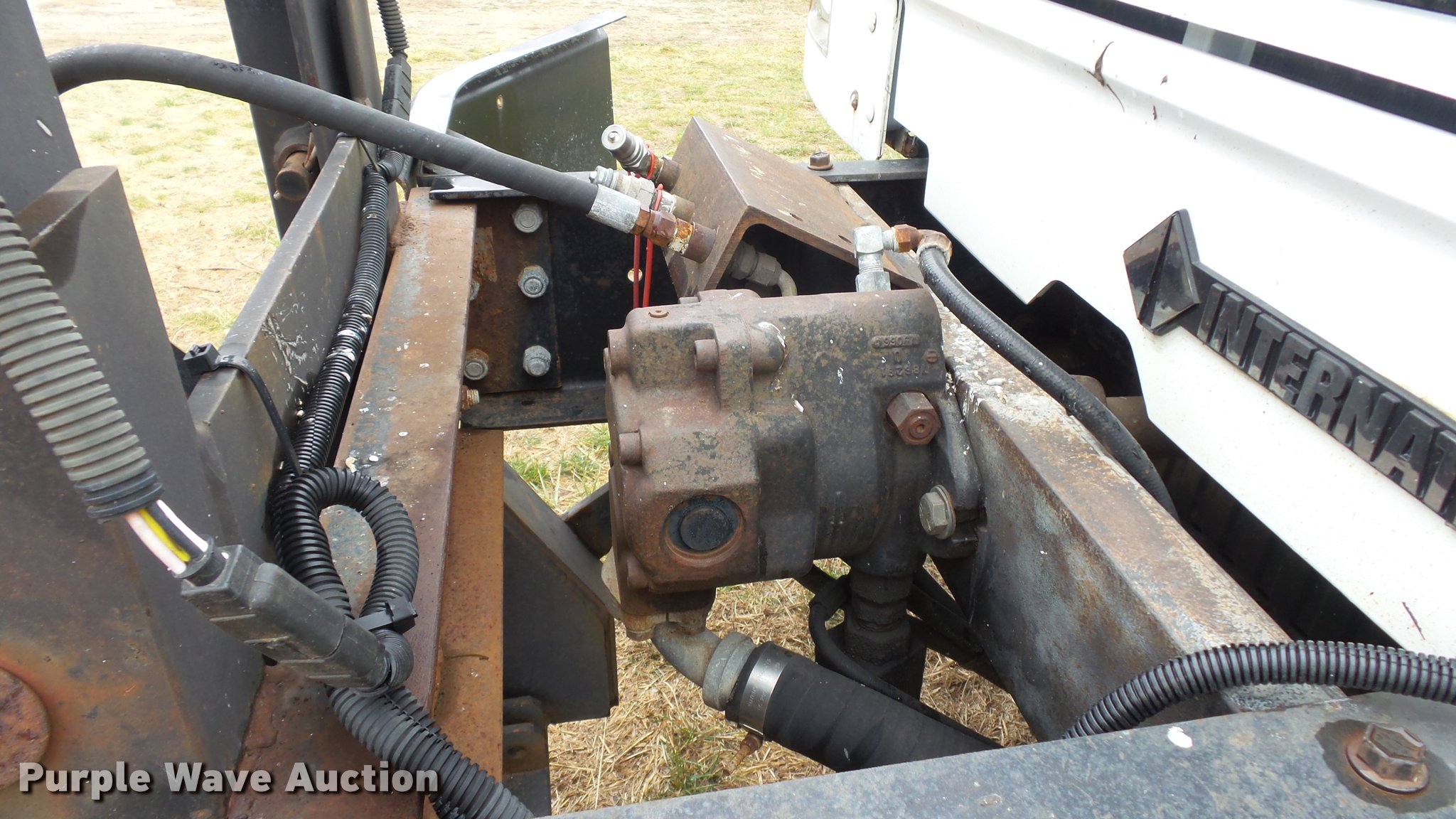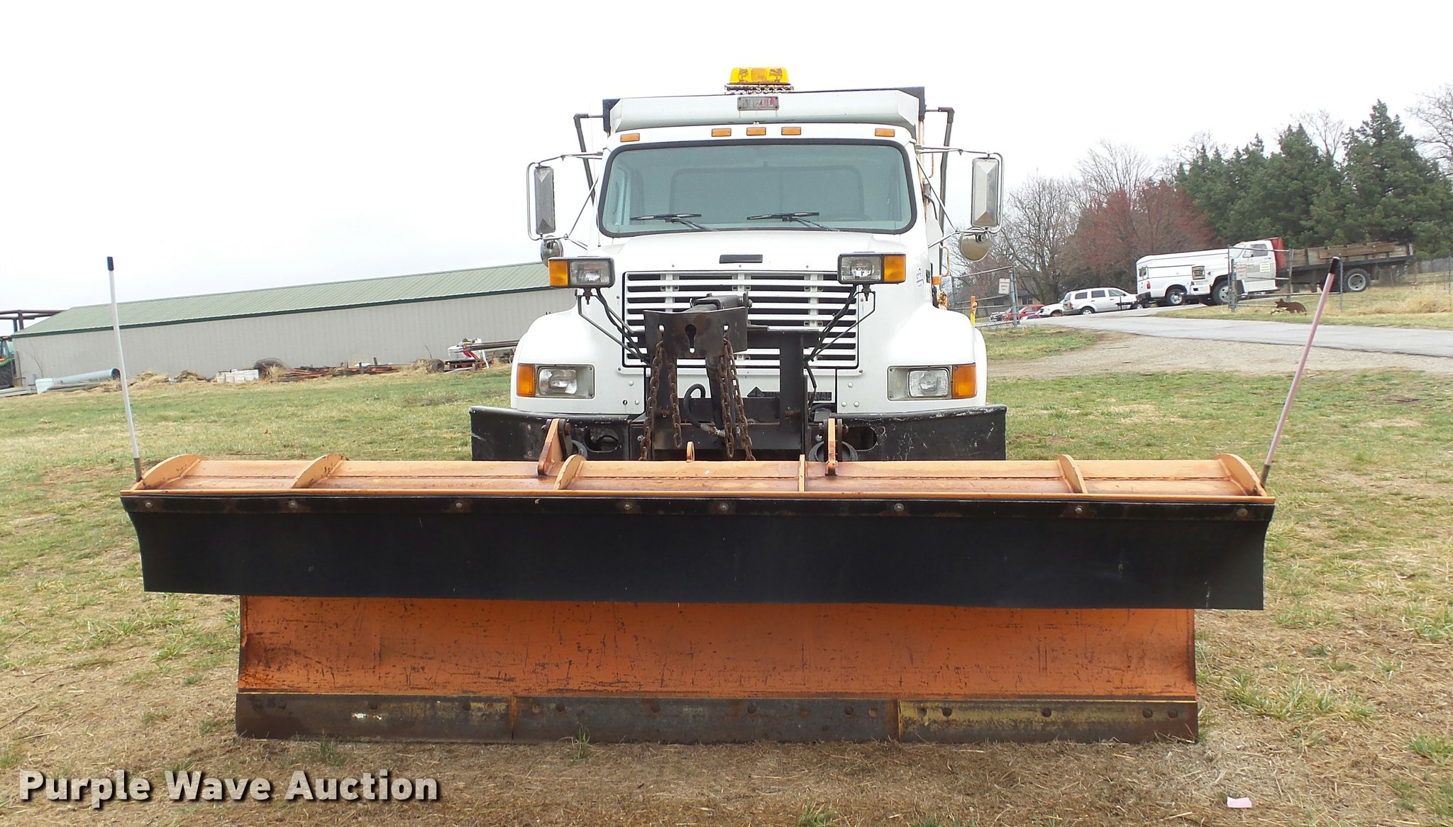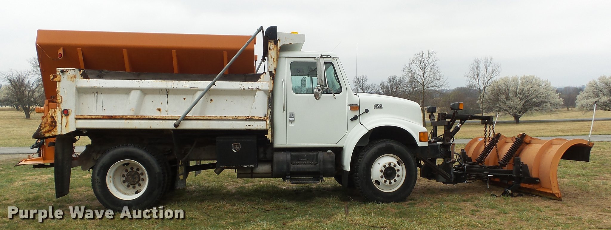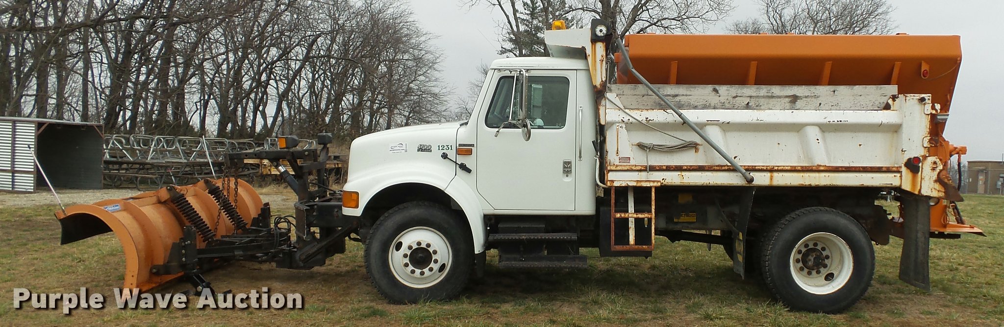Purple Wave is selling a used Construction Dump Truck in Kansas. This item is a 2001 International 4700 dump truck with the following: 45,205 miles on odometer, Actual mileage unknown, 3,673 hours on meter, International DT466 7.6L L6 turbo diesel engine, Five speed manual transmission, Single axle, AC and heat, Cruise, AM/FM/weatherband, Spring suspension seat, Block heater, Front mounted PTO, Heil SL steel dump bed, 10'L x 8'W, 28" side height, Five cu. yd. capacity, Manual operated end gate, Roll tarp, Toolbox, Unattached tailgate included, American 10'W snow plow, Warren AC240A-10 steel spreader, 6.2 cu. yd. capacity, Force SSC1100 spreader controls, Front and rear work lights, Strobe lights, Single fuel tank, Pintle hitch, Trailer wiring, 12.5' wheelbase, Spring suspension, Hydraulic brakes, 11R22.5 tires, Non-operational brakes, Unit must be towed or hauled, Electronic face replaced, Rust