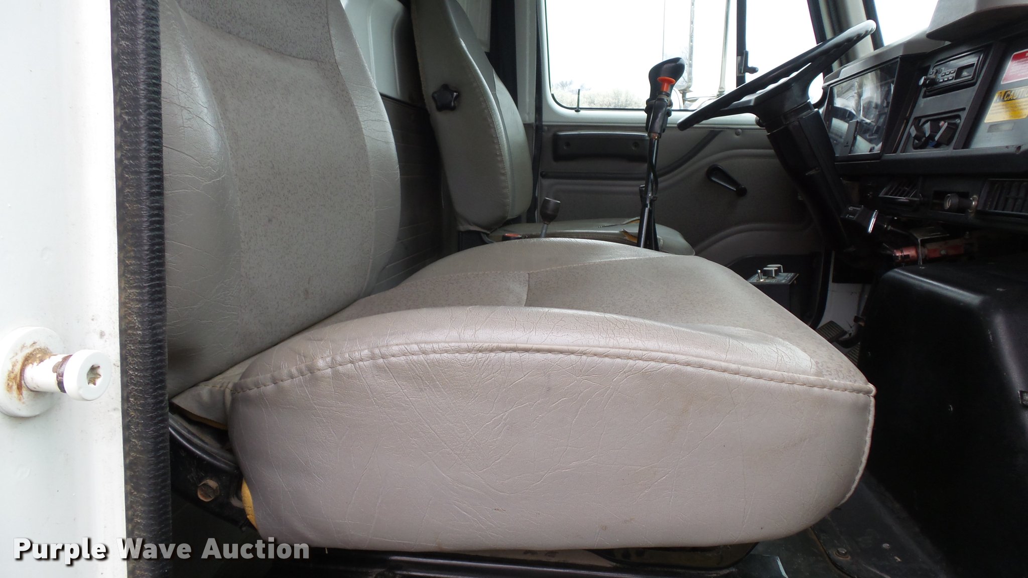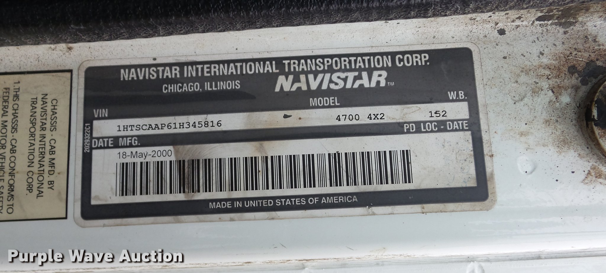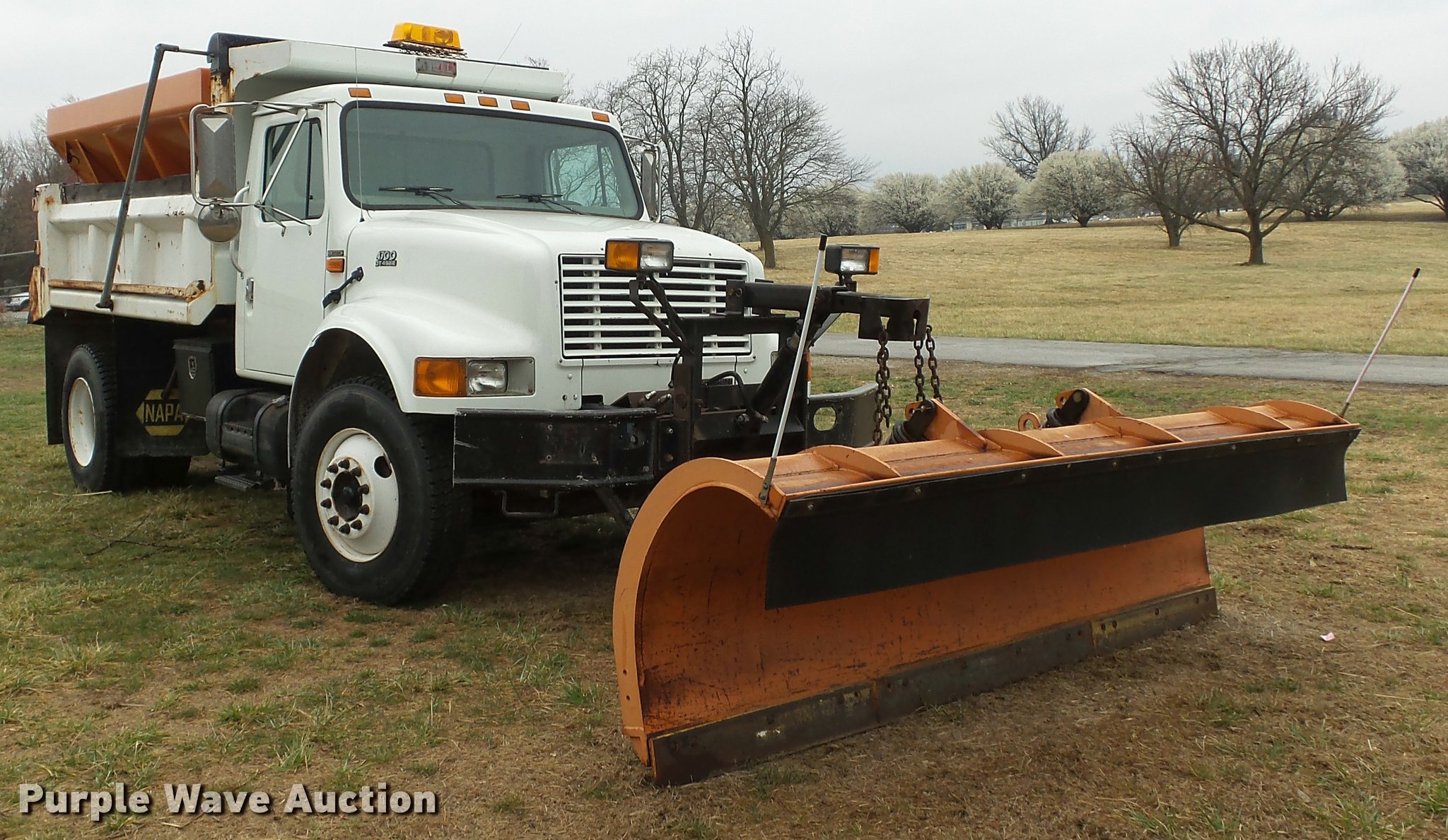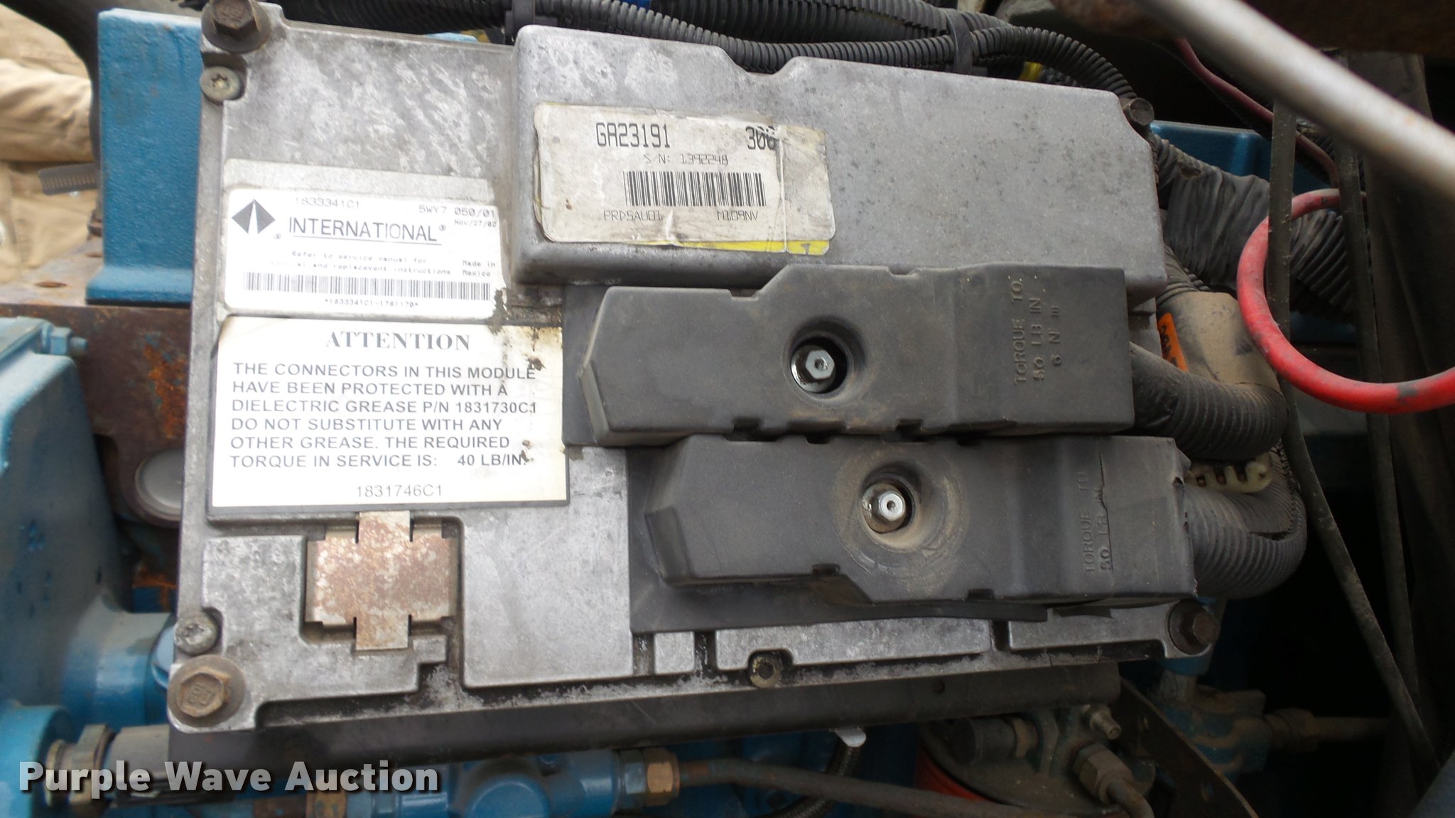 Purple Wave is selling a used Construction Dump Truck in Kansas. This item is a 2001 International 4700 dump truck with the following: 45,205 miles on odometer, Actual mileage unknown, 3,673 hours on meter, International DT466 7.6L L6 turbo diesel engine, Five speed manual transmission, Single axle, AC and heat, Cruise, AM/FM/weatherband, Spring suspension seat, Block heater, Front mounted PTO, Heil SL steel dump bed, 10'L x 8'W, 28" side height, Five cu. yd. capacity, Manual operated end gate, Roll tarp, Toolbox, Unattached tailgate included, American 10'W snow plow, Warren AC240A-10 steel spreader, 6.2 cu. yd. capacity, Force SSC1100 spreader controls, Front and rear work lights, Strobe lights, Single fuel tank, Pintle hitch, Trailer wiring, 12.5' wheelbase, Spring suspension, Hydraulic brakes, 11R22.5 tires, Non-operational brakes, Unit must be towed or hauled, Electronic face replaced, Rust