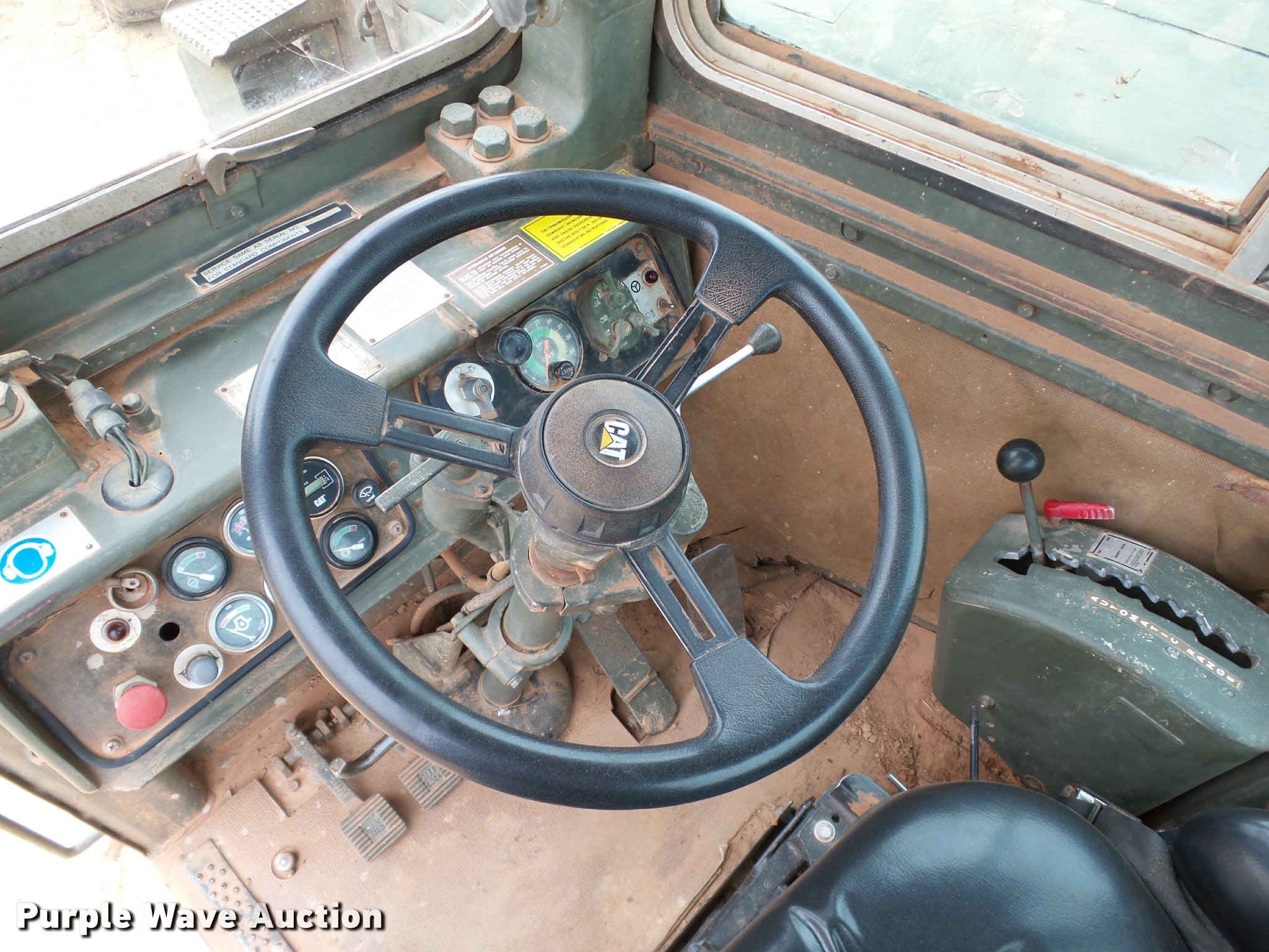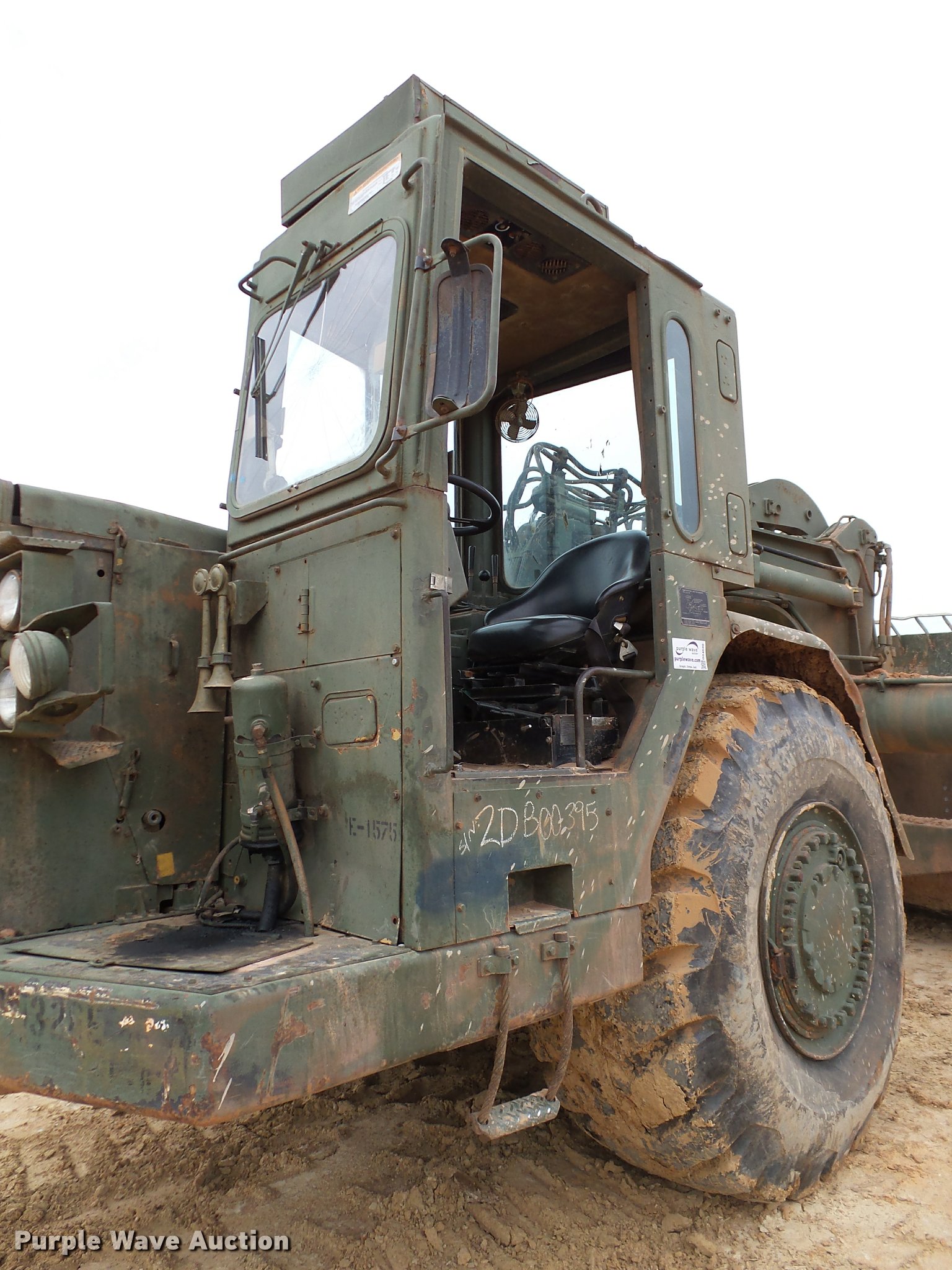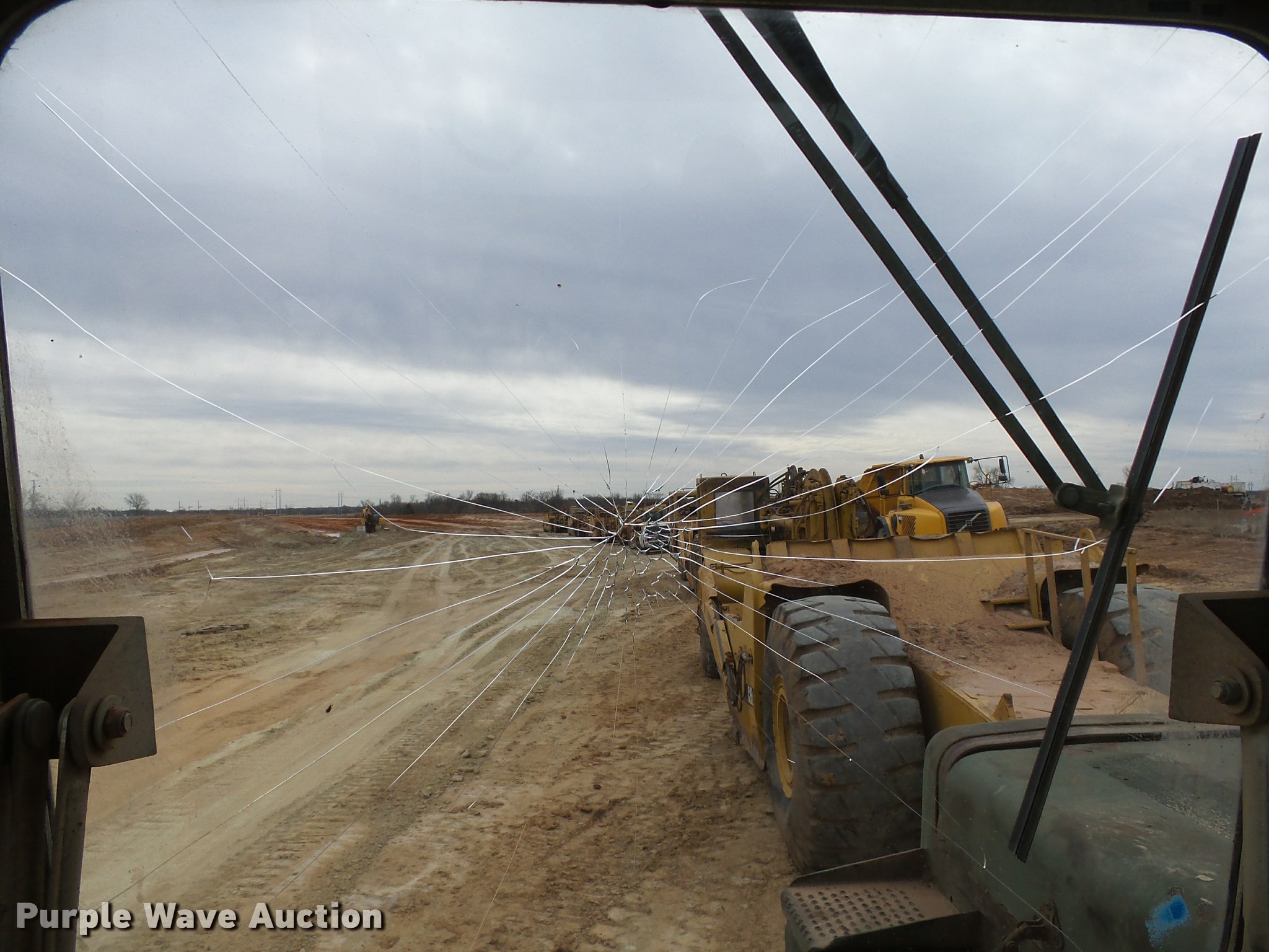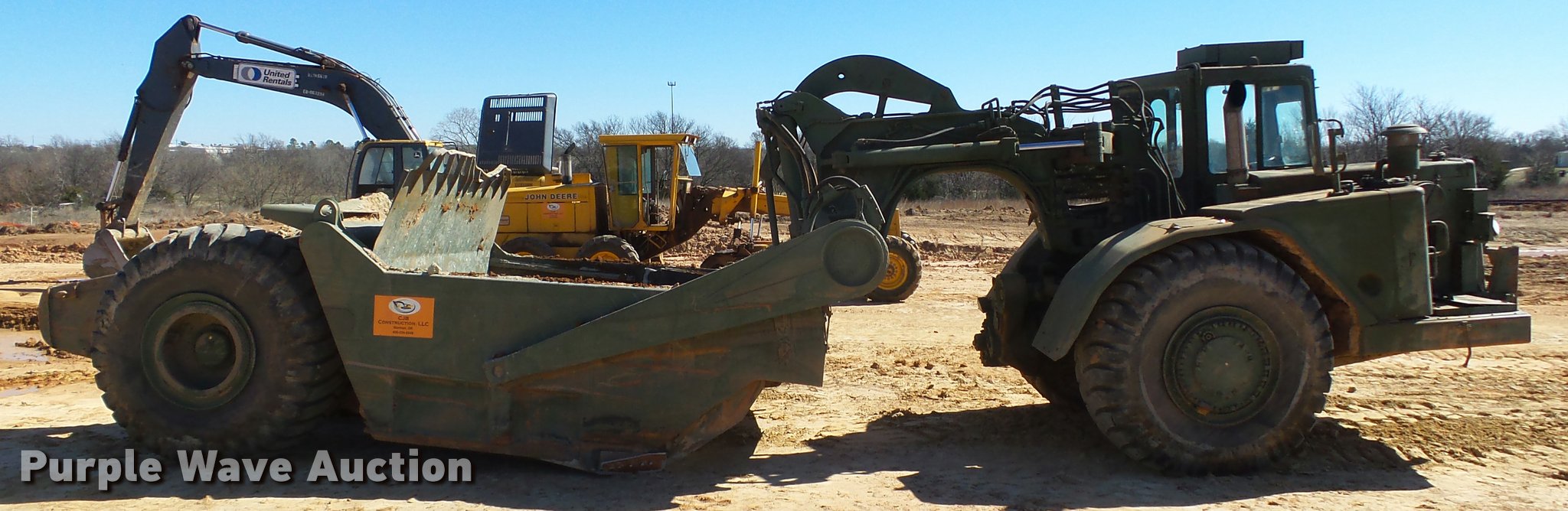 Purple Wave is selling a used Conventional Scraper in Oklahoma. This item is a 1984 Caterpillar 621B conventional scraper with the following: 2,299 hours on meter, Caterpillar 3406 14.6L six cylinder turbo diesel engine, 330 HP, Serial 70V18890, Powershift transmission, 8F-1R gears, Differential lock, Enclosed cab, Unattached door included, Heat, Tilt steering wheel, Wipers, 20 cu. yd. bowl capacity, Hydraulic lift, Three lever controls, Rear push block, Front work lights, Front pin hitch, 29.5-29 tires, Glass cracked, Serial 2DB00395