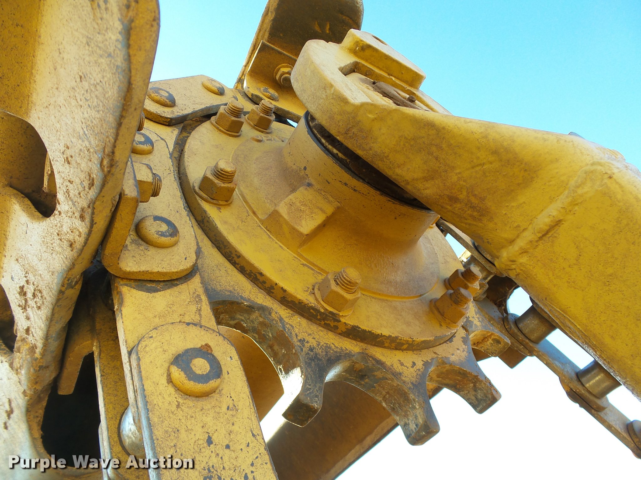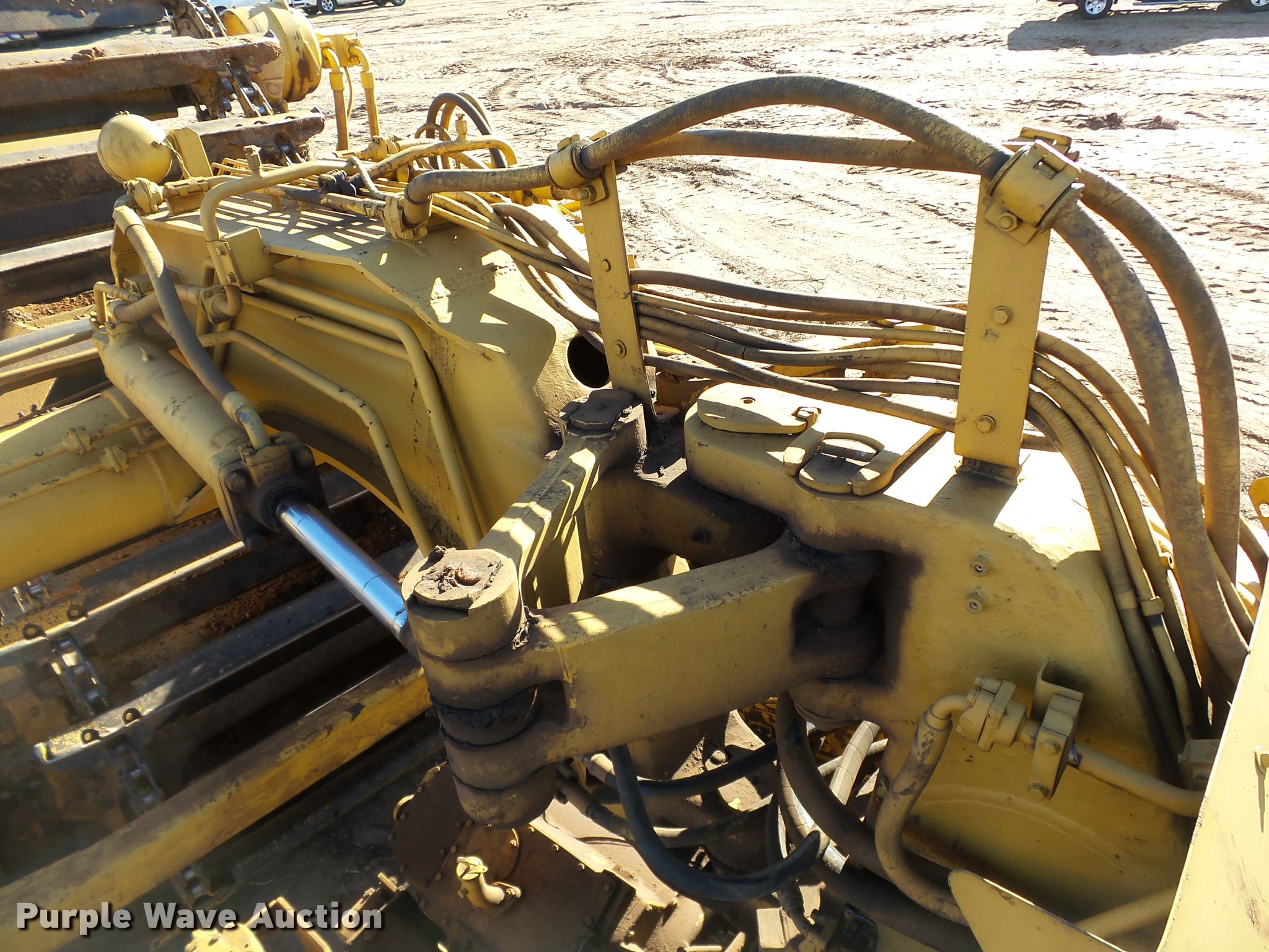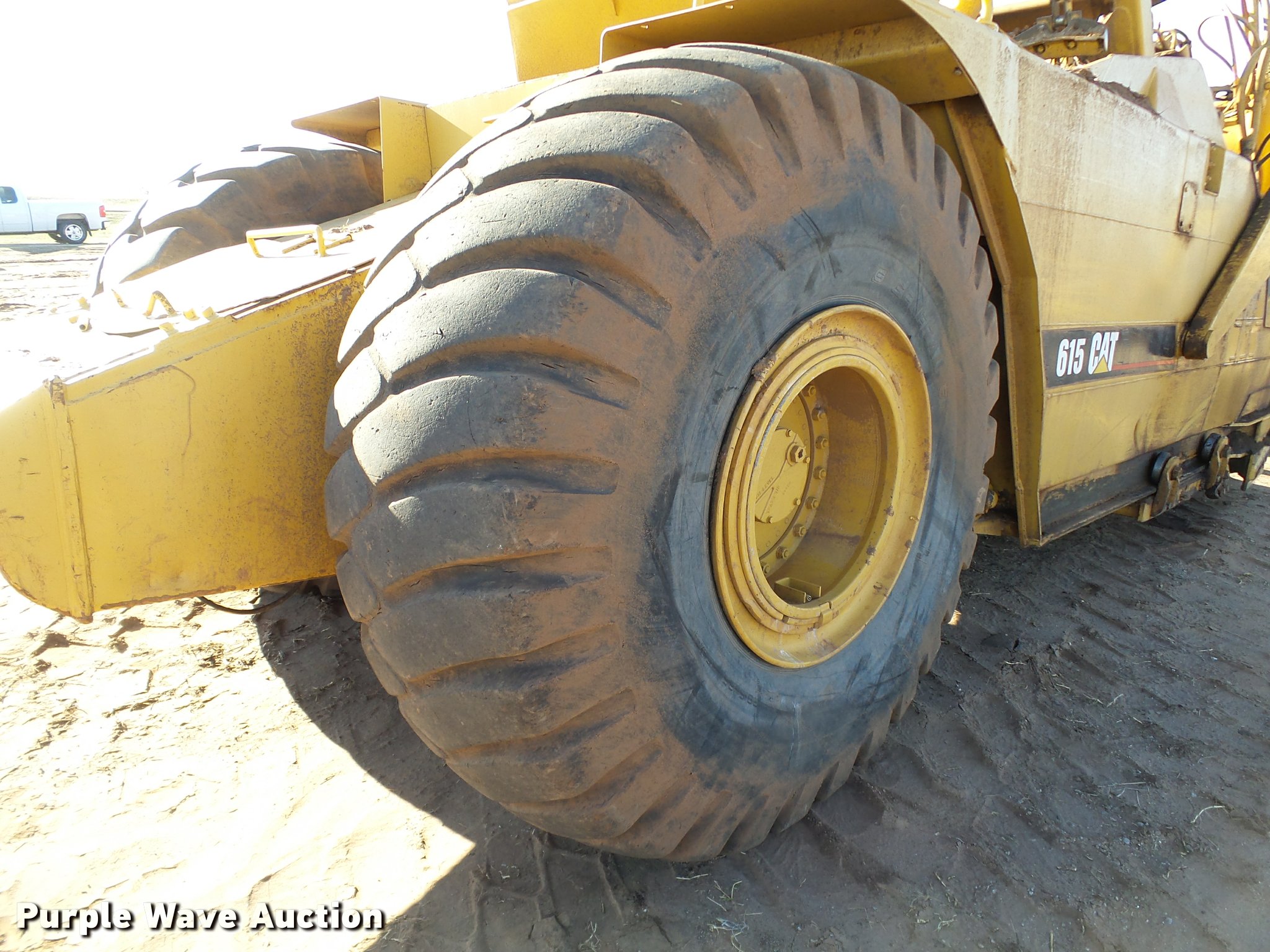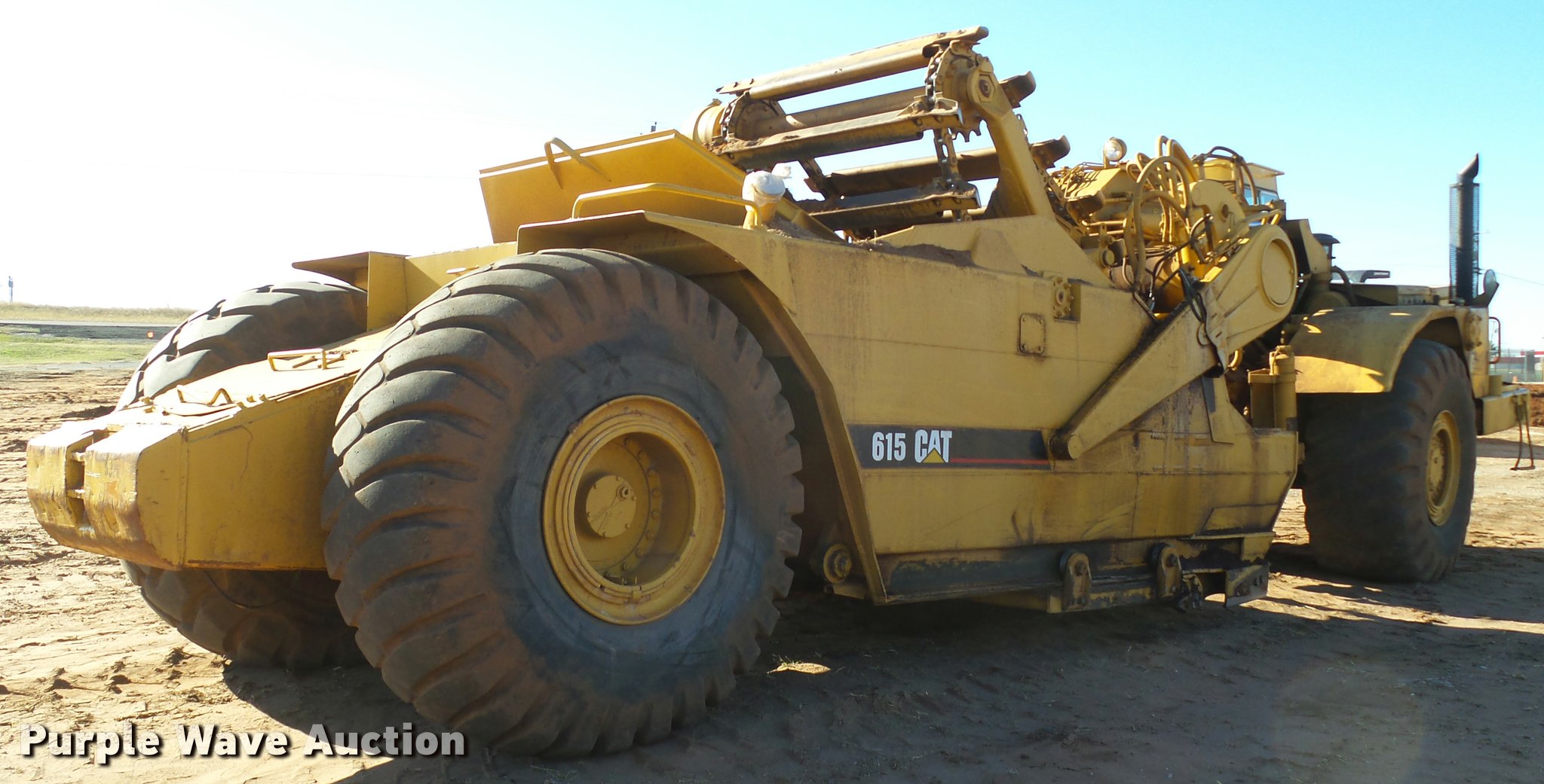 1984 Caterpillar 615 elevating scraper. 13,818 hours on meter, Caterpillar 3306 10.5L six cylinder turbo diesel engine 250 HP, Serial 08Z23421, Powershift transmission 6F-1R gears, Differential lock, Enclosed cab, 16 cu. yd. bowl capacity Hydraulic lift, Three lever controls, Rear push block, Front work lights, Rear pin hitch, 29.5-29 tires, Glass cracked, Serial 46Z01074. CJB Construction LLC.. 2200 Weedn Blvd. Purcell, OK 73080