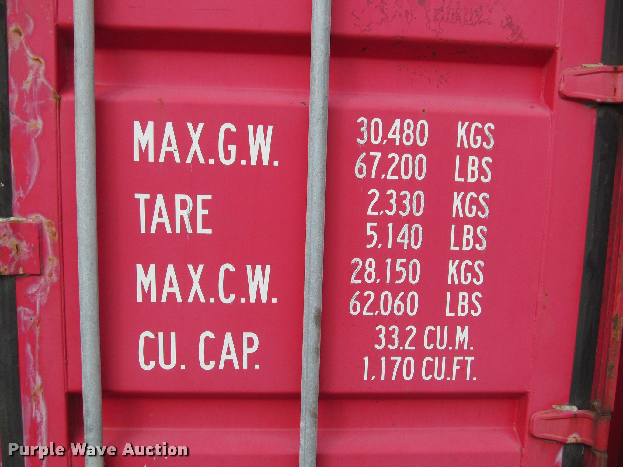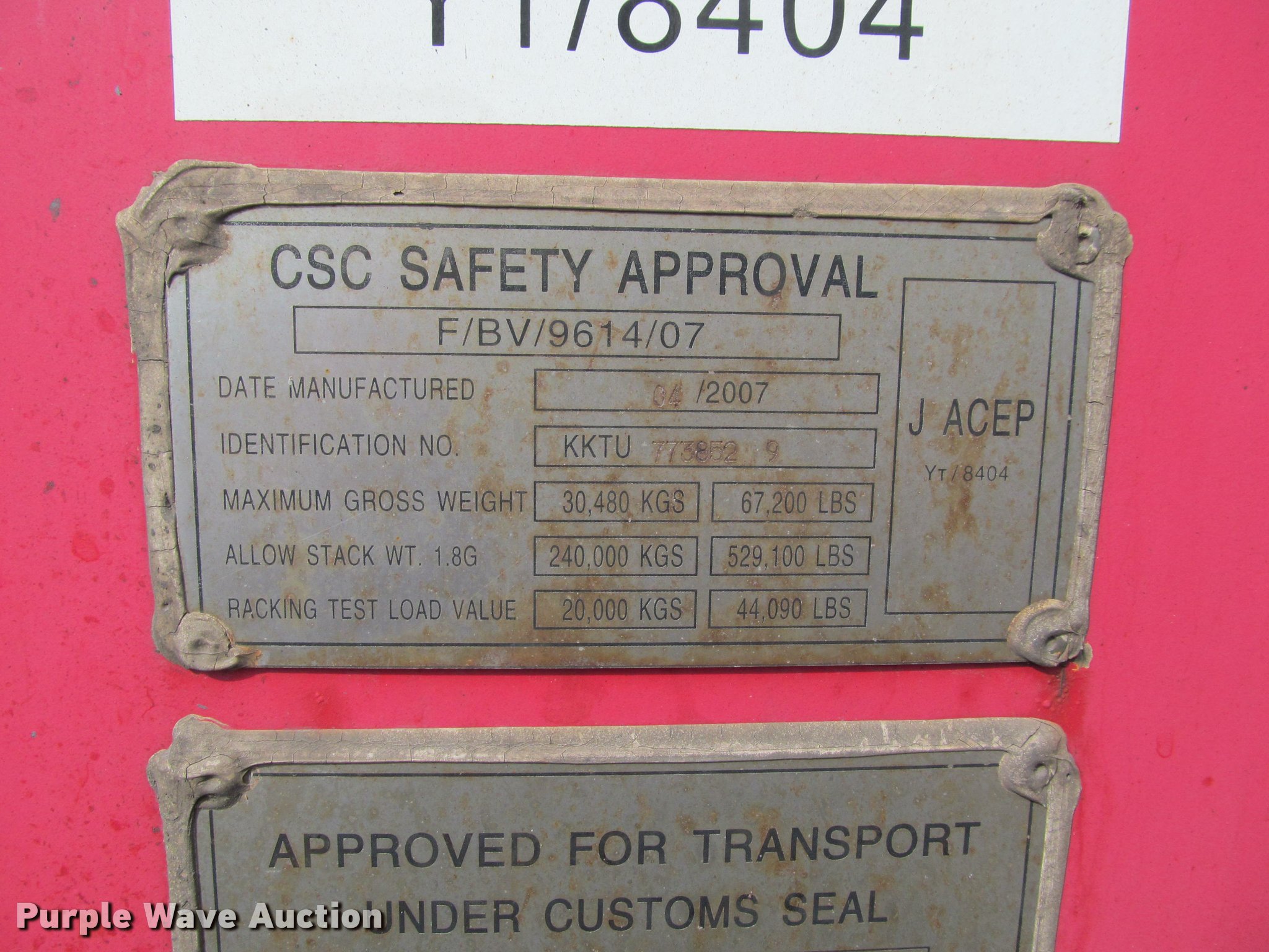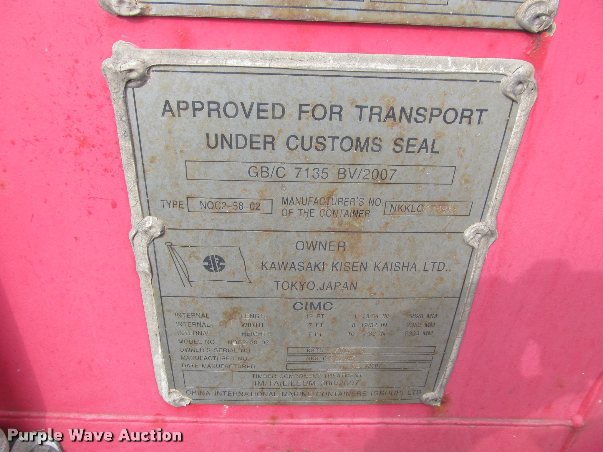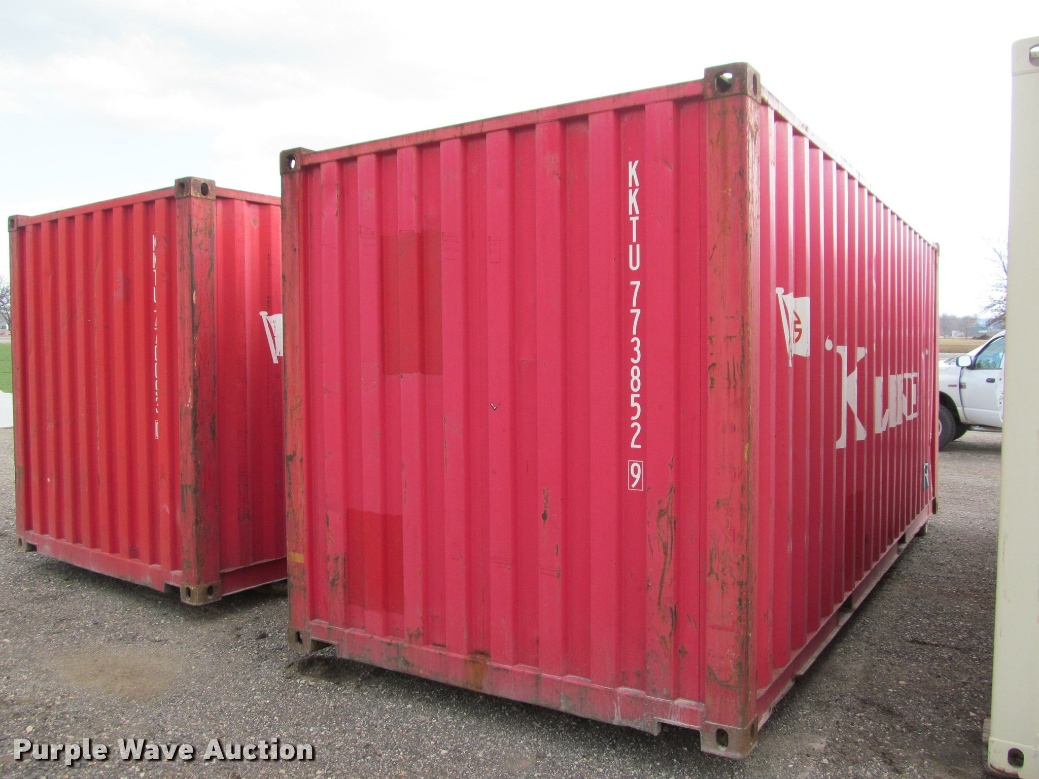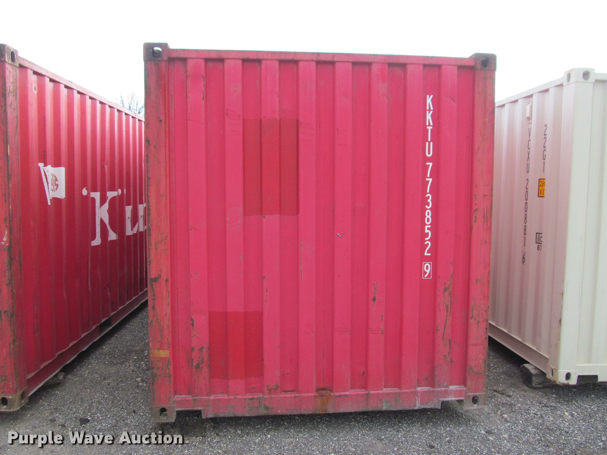 Purple Wave is selling a used Storage or Shipping Container in Kansas. This item is a 2007 K-Line container with the following: 20'L x 8'W x 8.5'H, Wood floor, Lifting eyes, Fork pockets, Floor/roof tie down hooks, 67,200 lbs max gross weight, 5,140 lbs tare weight, Serial KKTU773852-9