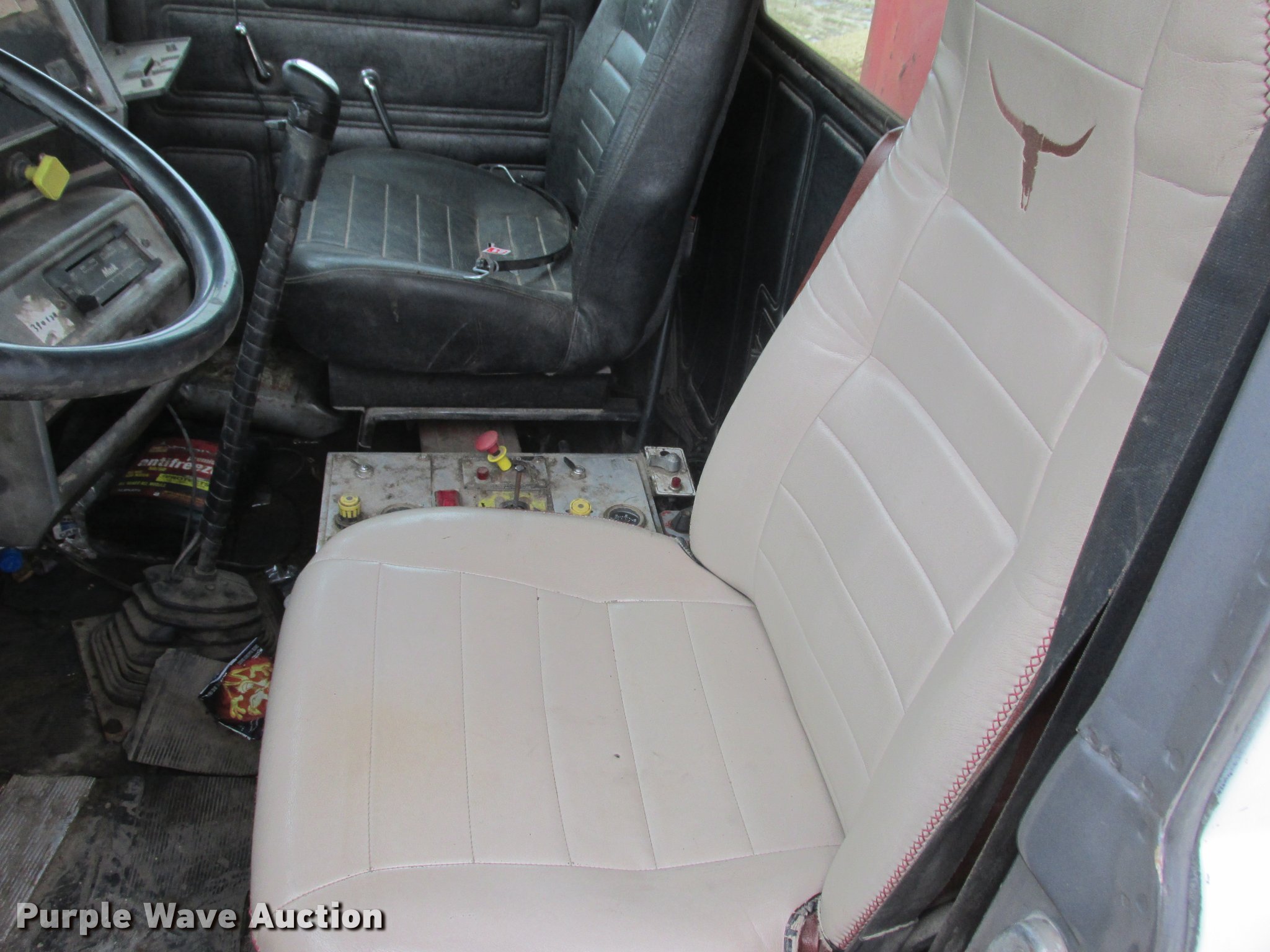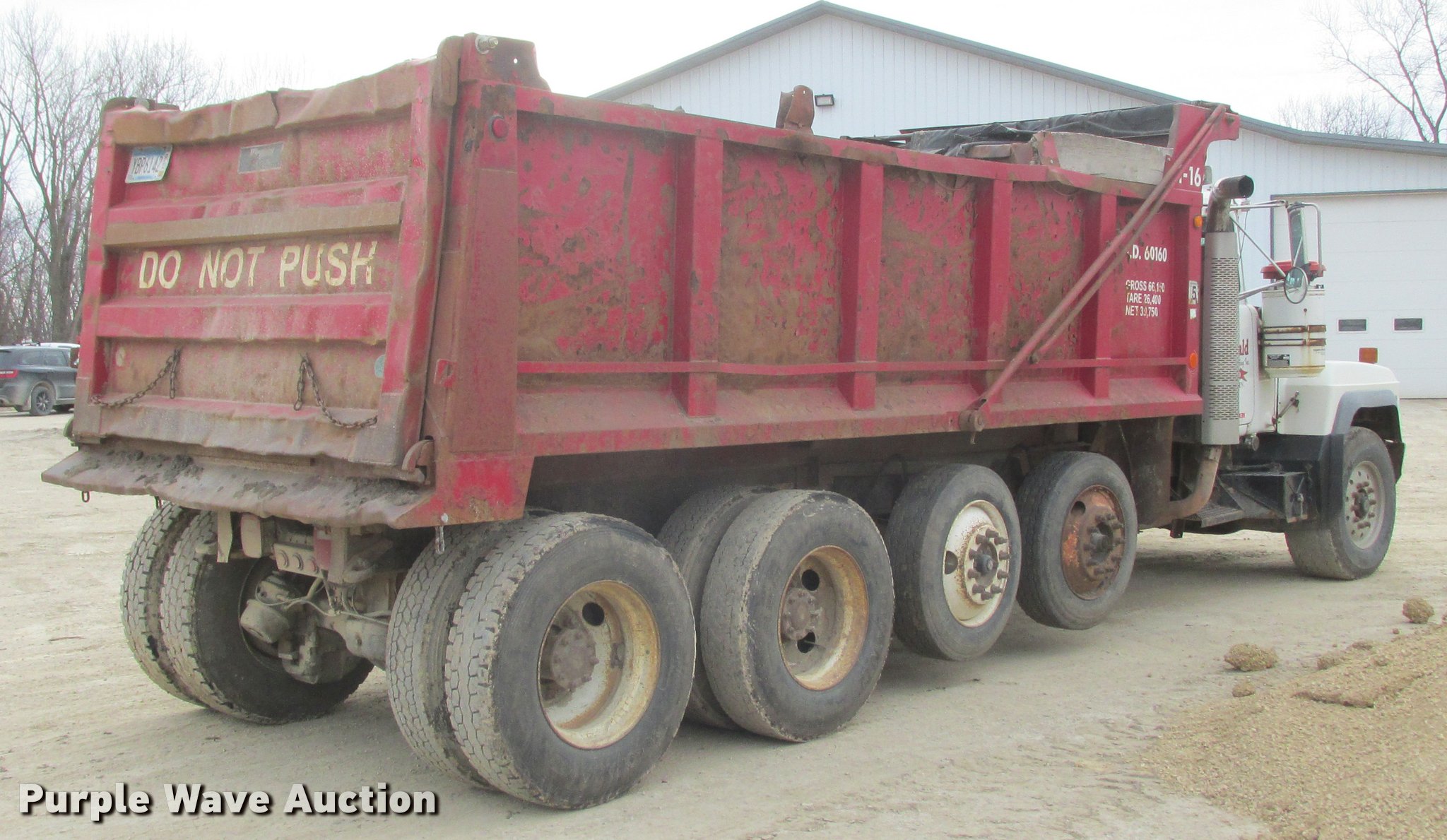 Purple Wave is selling a used Construction Dump Truck in Minnesota. This item is a 2001 Mack RD688S dump truck with the following: 380,276 miles on odometer, 6,734 hours on meter, Mack E7 12.0L L6 turbo diesel engine, Eaton Fuller eight speed with lo-lo manual transmission, Quad axle, AC and heat, Air suspension seat, Exterior visor, Steel dump bed, 18'L x 8'W, 4' side height, Single ram hoist, Roll tarp, Air operated end gate, Single fuel tank, Chrome bumper, Air lift steerable pusher axles, 256" wheelbase, Spring suspension, Air brakes, 385/65R22.5 front tires, 11R22.5 rear tires, GVWR 66,150 lbs