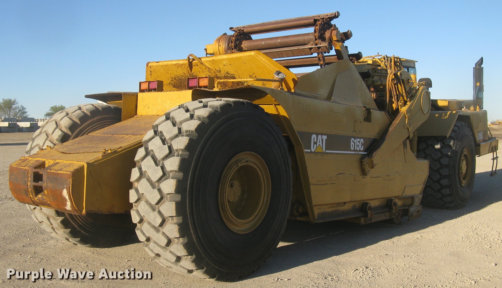 Purple Wave is selling a used Elevating Scraper in Oklahoma. This item is a 1995 Caterpillar 615C Series II elevating scraper with the following: Approximately 5,200 hours on unit, 346 hours on meter, Caterpillar 3306 six cylinder turbo diesel engine, 279 HP, Serial 08Z86525, Powershift transmission, 6F-1R gears, Differential lock, EROPS, AC and heat, Tilt, telescoping steering wheel, Air suspension seat, Front and rear wipers, Rear push block, Hydraulic lift, Elevator reverse, Three lever controls, Front work lights, Bowl serial 2X001183, Hydraulic brakes, 29.5R25 tires, One tier level upgrade 2/10, Serial 9XG00622, Unit# 76.13L