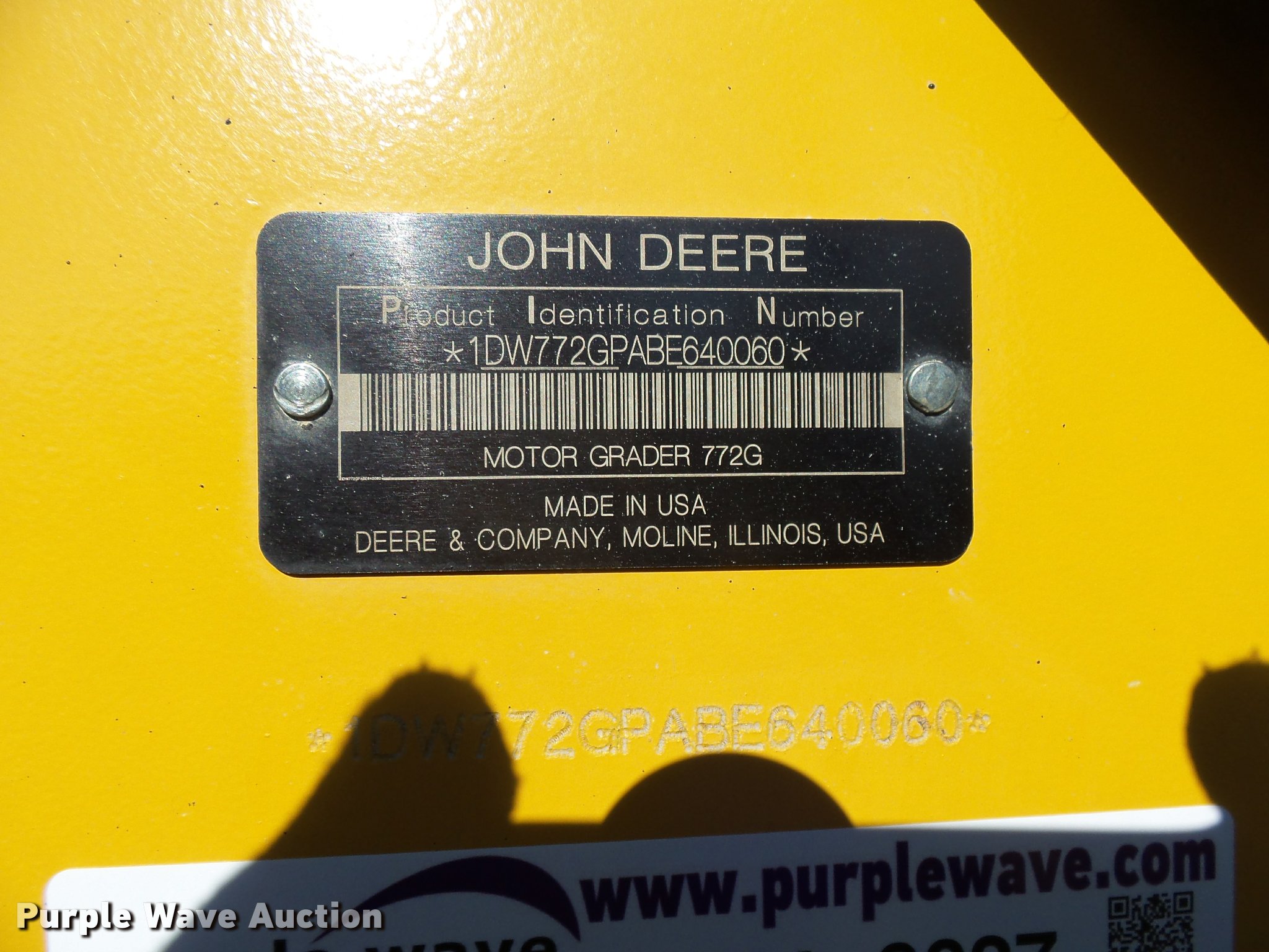 Purple Wave is selling a used Motor Grader in South Dakota. This item is a 2012 John Deere 772GP motor grader with the following: 6,198 hours on meter, John Deere 6090 HDW II diesel engine, Serial RG6090R010024, Powershift transmission, 8F-8R gears, Differential lock, Enclosed cab, AC and heat, AM/FM/CD, Air suspension seat, Front and rear work lights, 16'W moldboard, Left and right blade extensions, Bridgestone 17.5R25 tires, Serial 1DW772GPABE640060