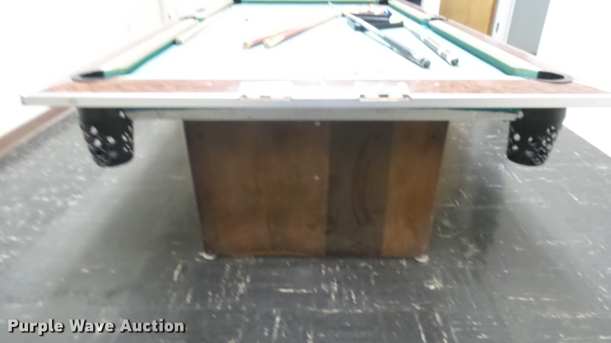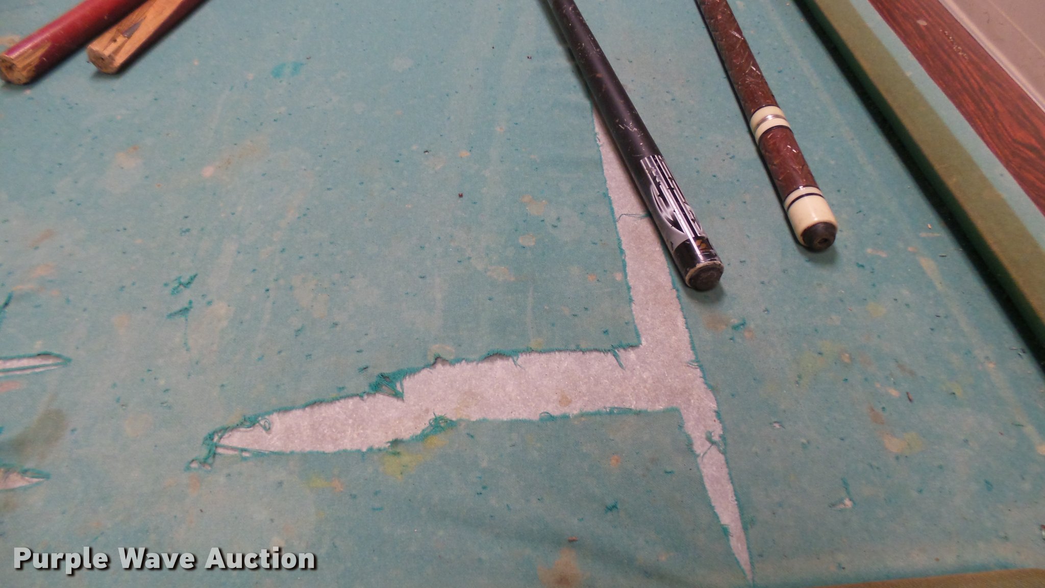 Purple Wave is selling a used Sporting Goods in Kansas. This item is a Pool table with the following: 100" x 56" x 32"H, Balls, Sticks, Felt damaged