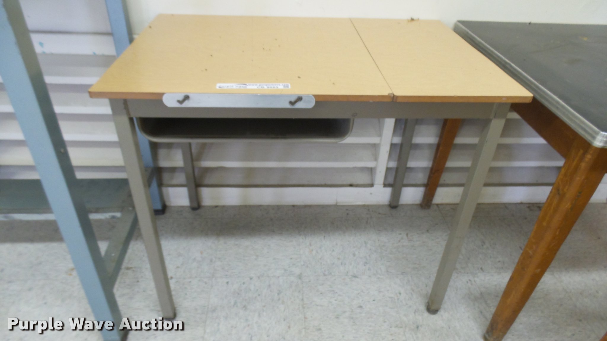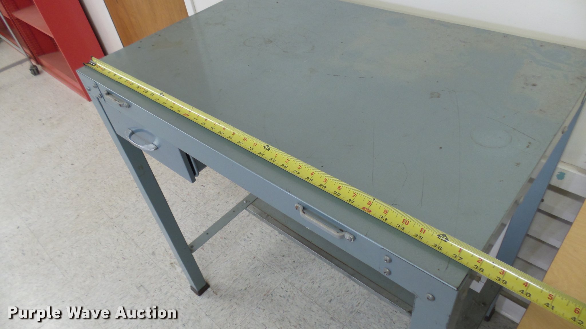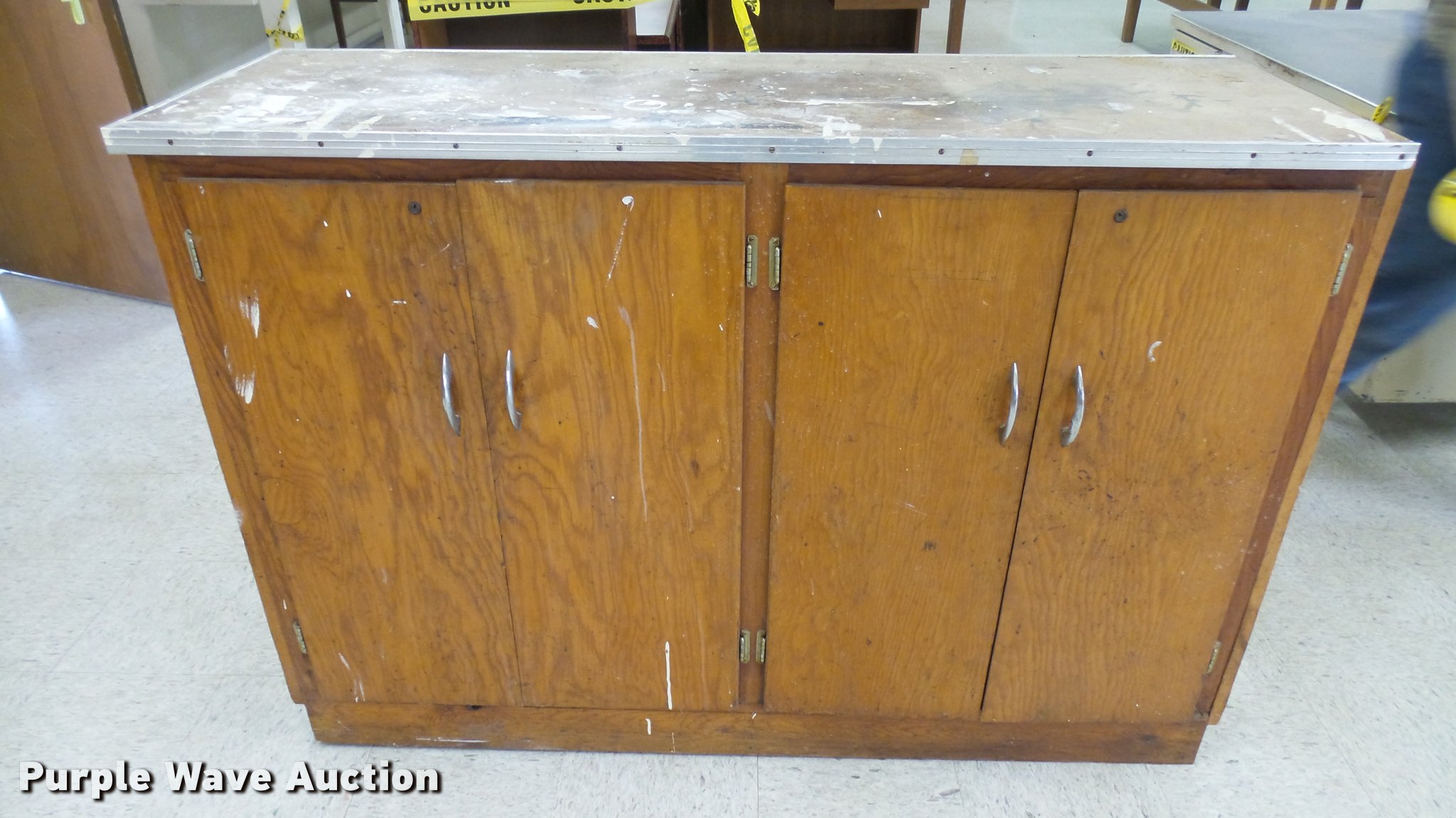 Purple Wave is selling a used Furniture in Kansas. This item is a Office furniture with the following: Wood storage cabinet, (2) wood tables, Metal desk