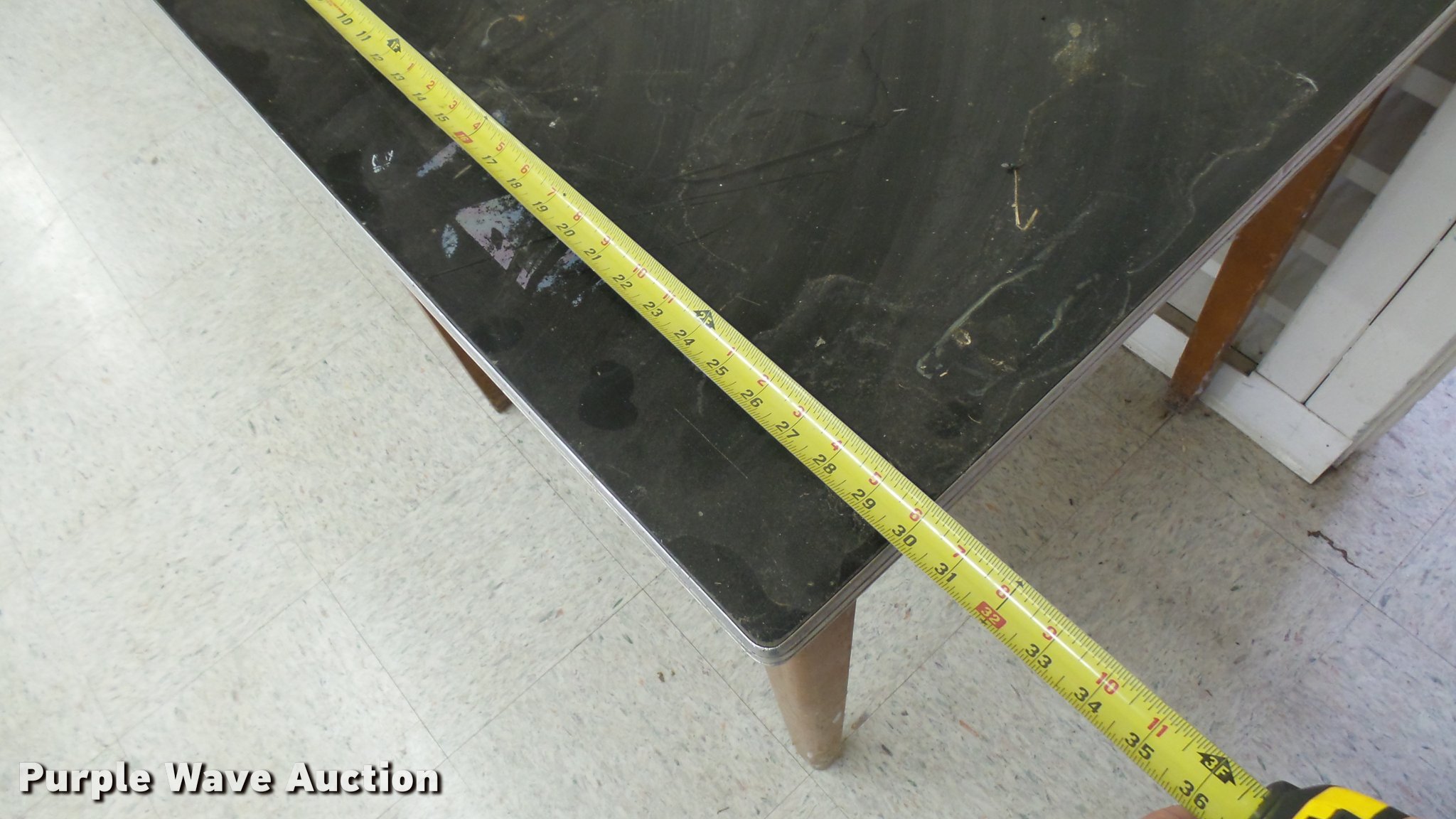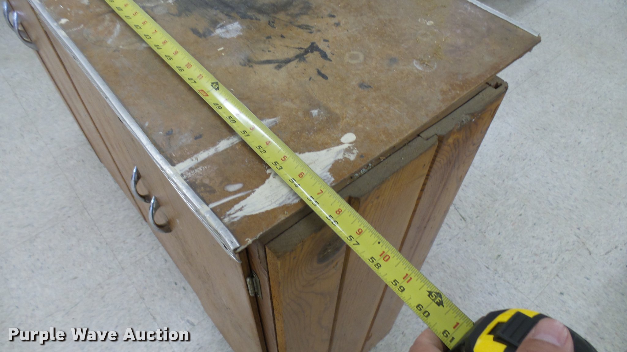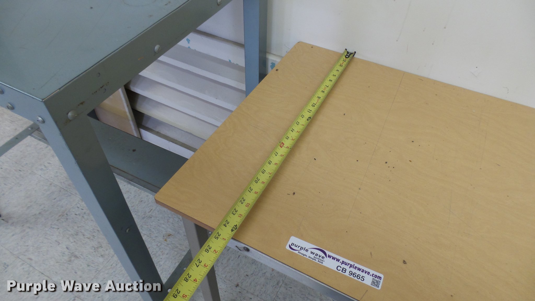 Purple Wave is selling a used Furniture in Kansas. This item is a Office furniture with the following: Wood storage cabinet, (2) wood tables, Metal desk