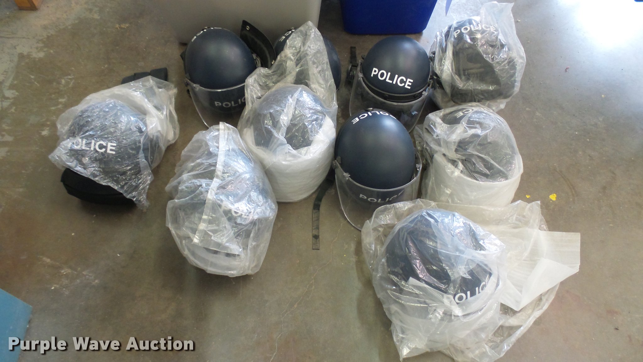 Purple Wave is selling a used Sporting Goods in Kansas. This item is a (10) police helmets with the following: Visor, Plastic, Most unused