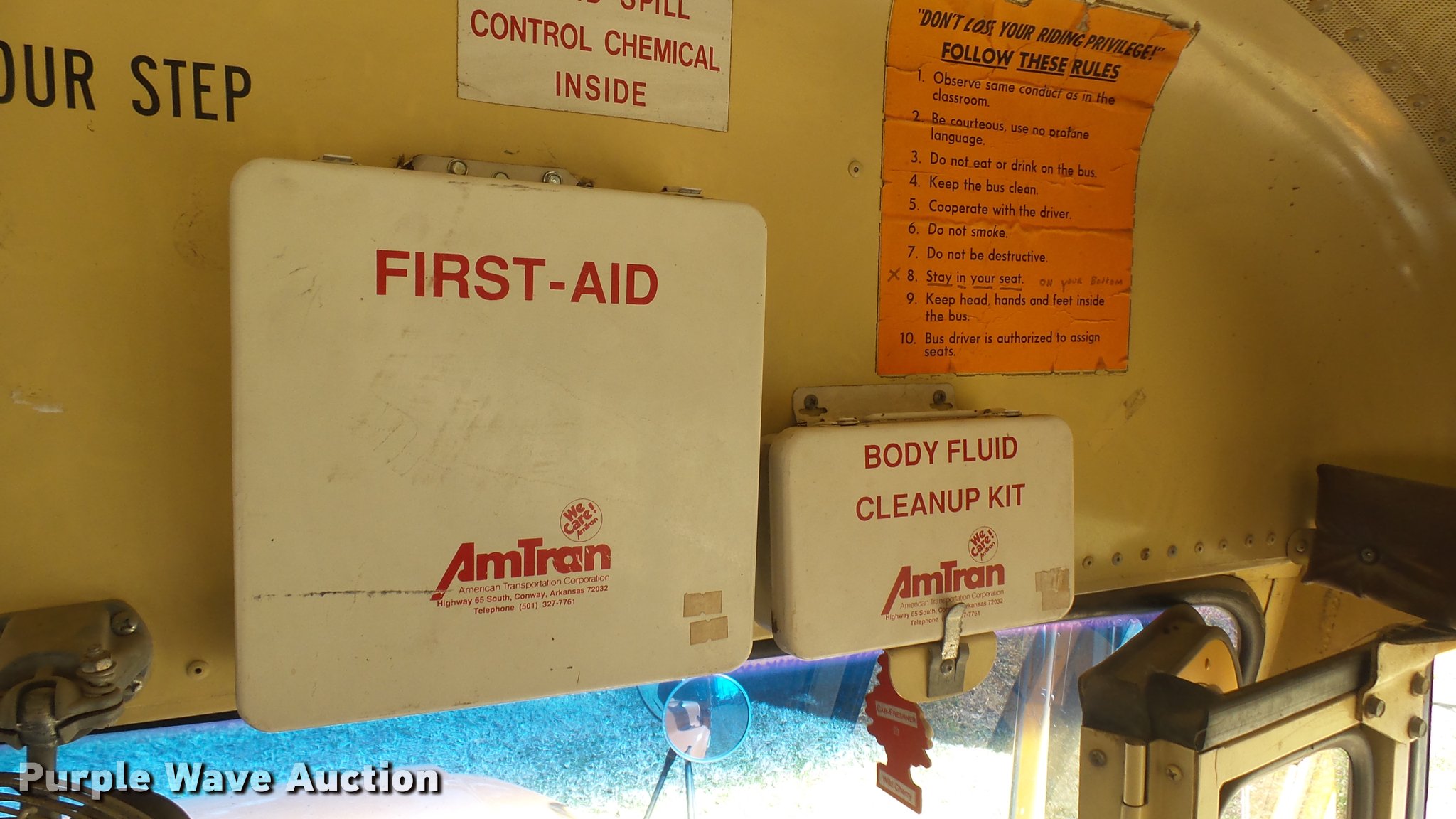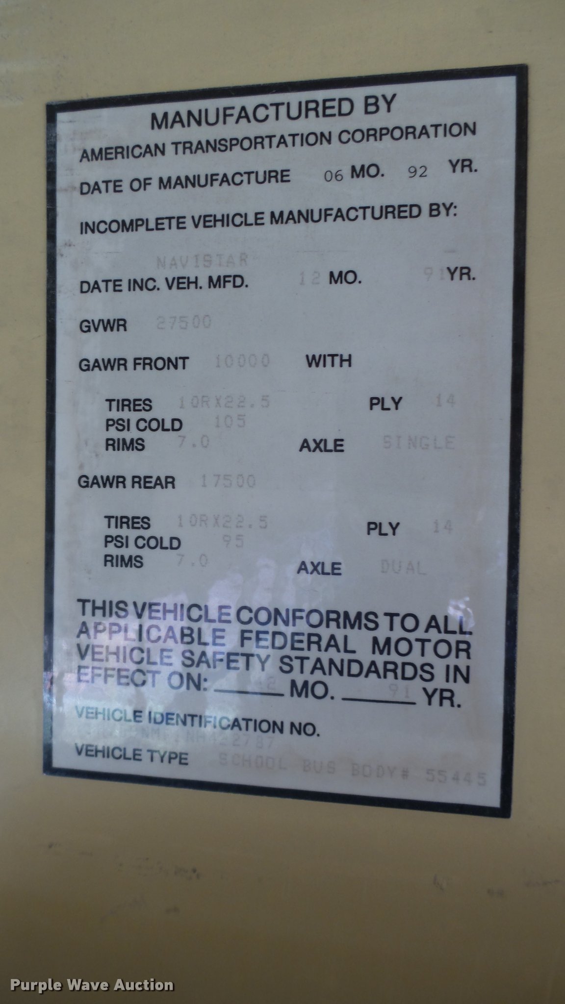 Purple Wave is selling a used Bus in Kansas. This item is a 1992 International 3800 school bus with the following: 94,423 miles on odometer, International DT360 5.9L L6 diesel engine, Automatic transmission, Heat, Manual windows and locks, Vinyl interior, 65 passenger capacity, Full light package, Am Tran body, Spring suspension, Hydraulic brakes, 10R22.5 tires, Rear taillights removed, Unit# 1