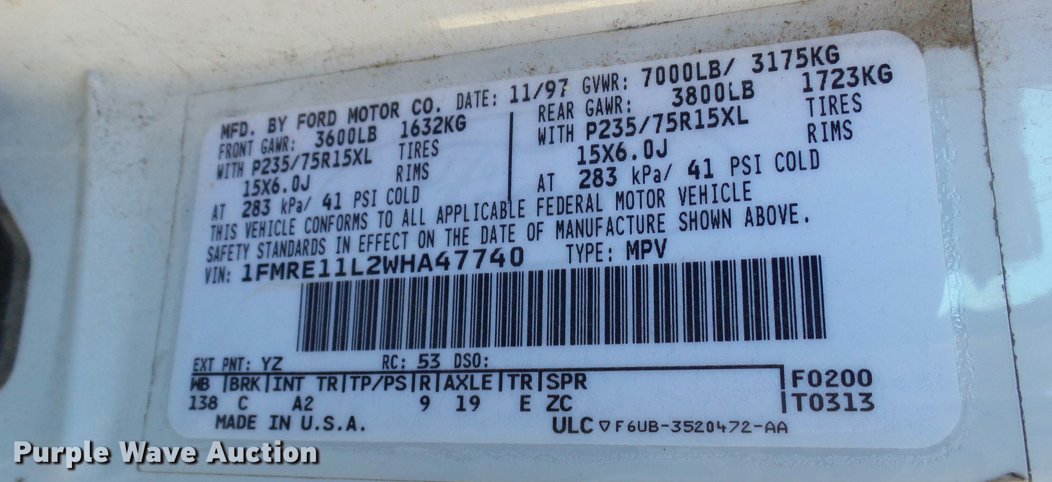 Purple Wave is selling a used Passenger Vehicle in Kansas. This item is a 1998 Ford Club Wagon van with the following: 192,857 miles on odometer, 5.4L V8 SOHC 16V gas engine, Automatic transmission, AC and heat, Tilt, Cruise, AM/FM/cassette, Manual windows and locks, Vinyl interior, Tommy Gate lift gate, 235/75R15 tires, Non-operational engine, Seats torn, Rear seats detached, Unit# 35