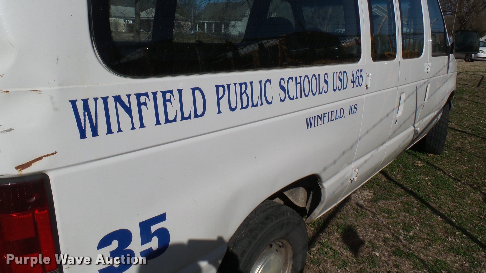 1998 Ford Club Wagon van. 192,857 miles on odometer, 5.4L V8 SOHC 16V gas engine, Automatic transmission, AC and heat, Tilt, Cruise, AM/FM/cassette, Manual windows and locks, Vinyl interior, Tommy Gate lift gate, 235/75R15 tires, Non-operational engine, Seats torn, Rear seats detached, Unit# 35. Kansas title. 1FMRE11L2WHA47740. USD 465 Winfield. 407 Harter St. Winfield, KS 67156
